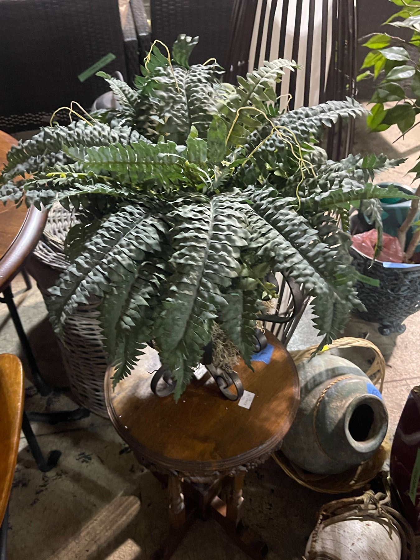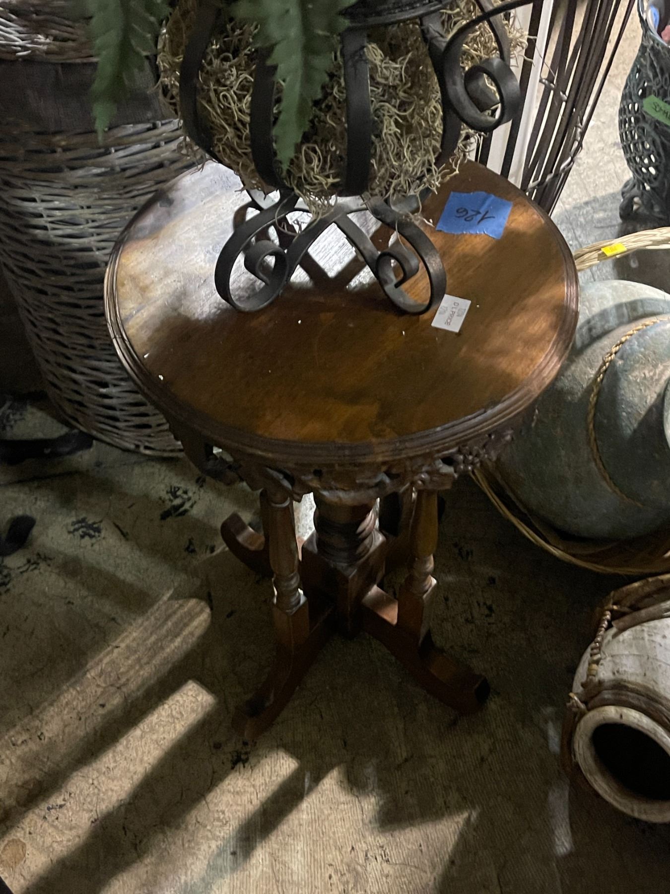 Vintage Wooden Pedestal Side Table (approx. H20" x 13") and Artificial Fern Plant