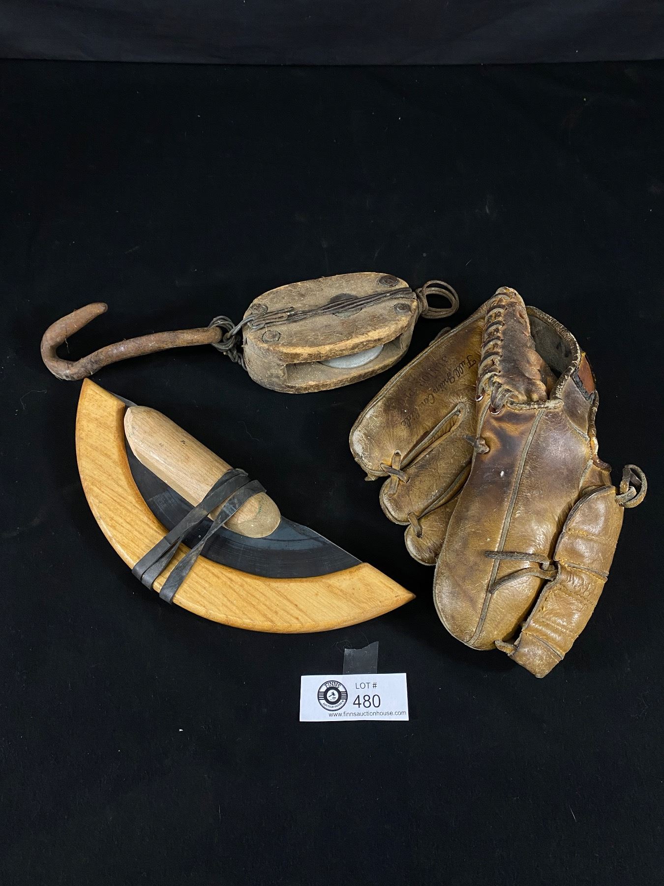 Vintage Wooden Pulley, Baseball Glove & Cutter