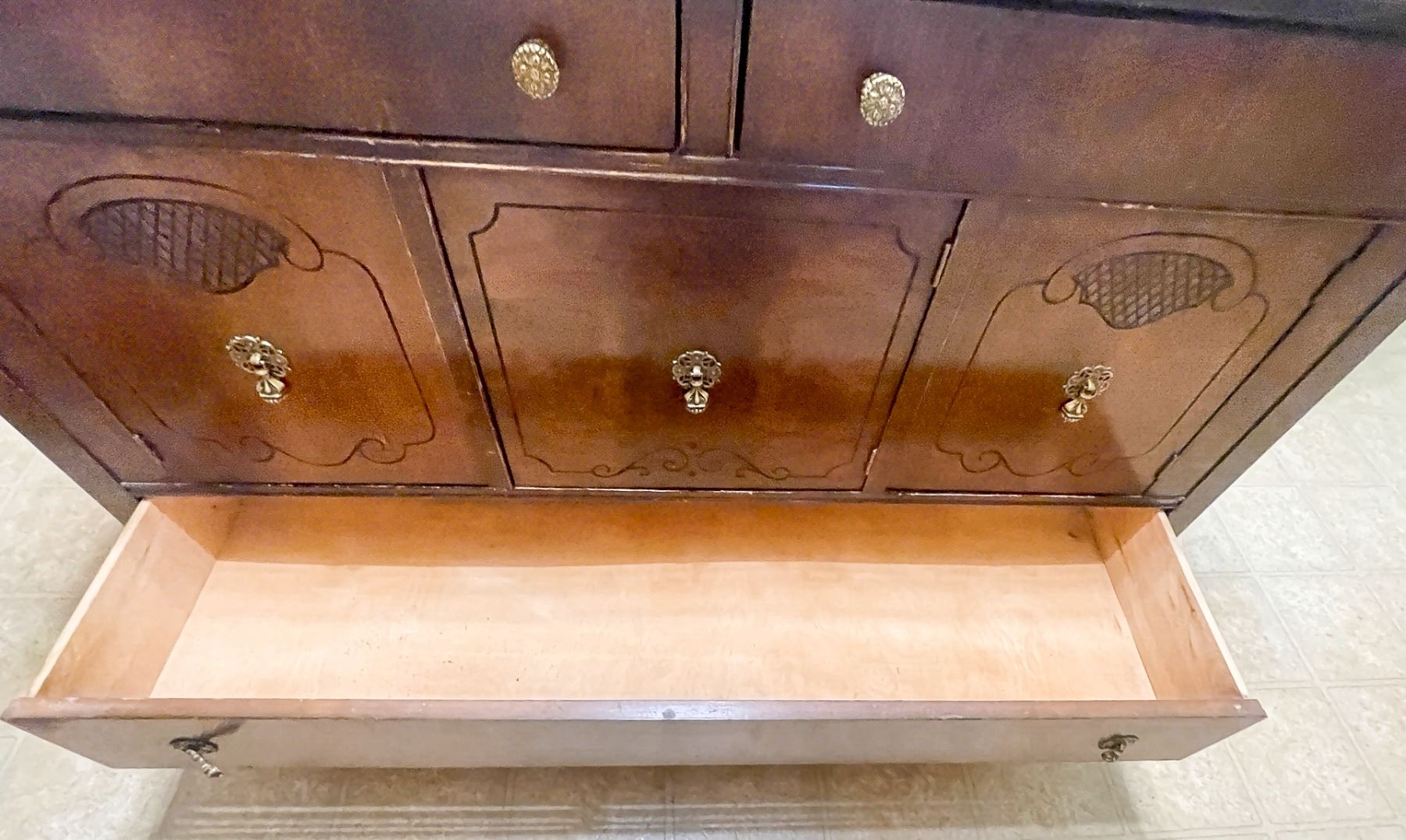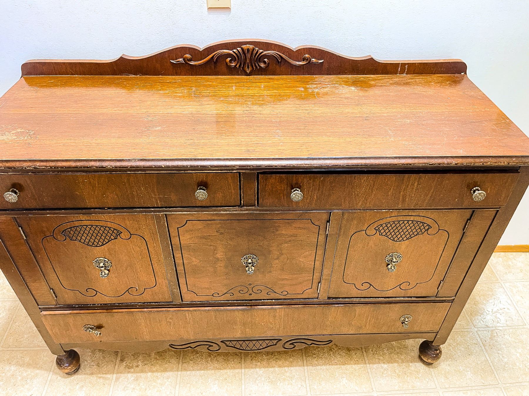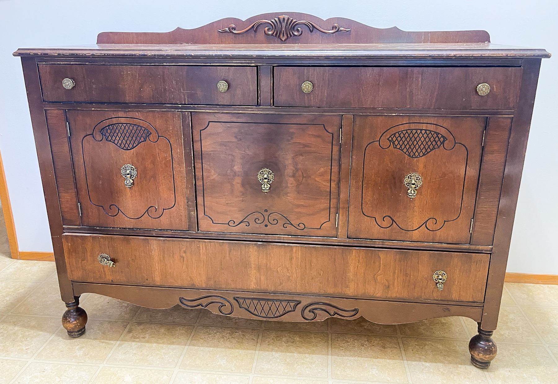 Heavy solid wood piece with carved details, turned legs, and original hardware. Two top drawers, large lower drawer, and center cabinets with shelves. Surface wear consistent with age; sturdy with lots of character. Buyer must bring help to move/load.