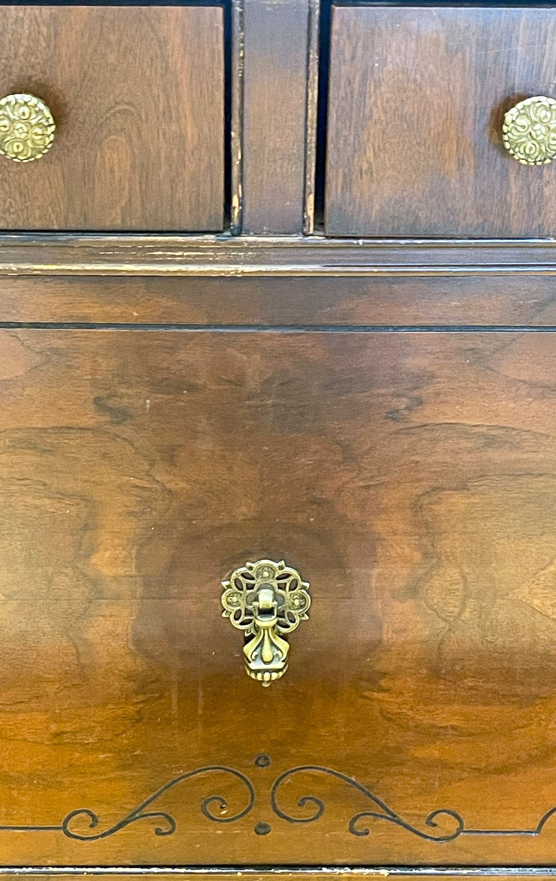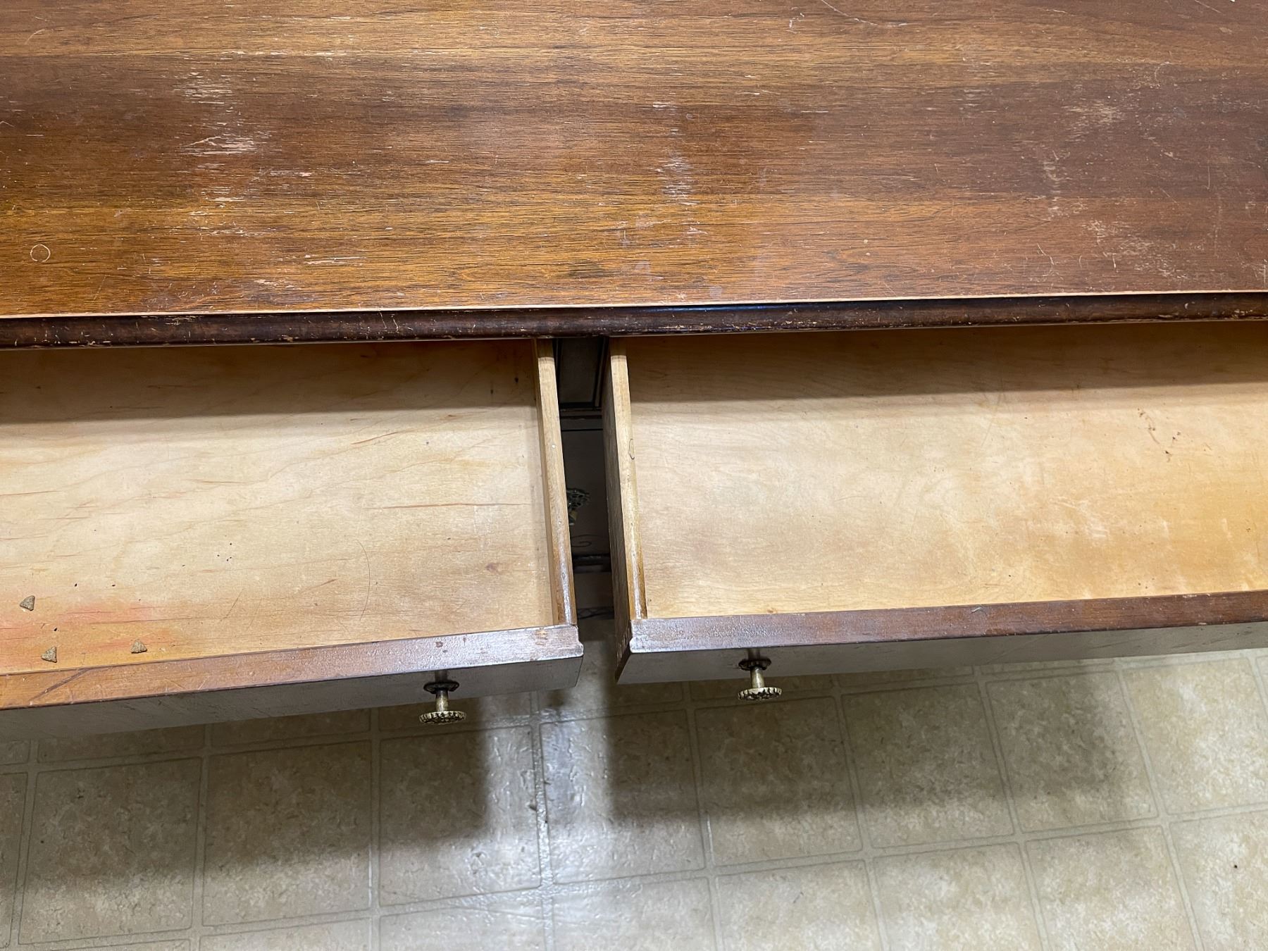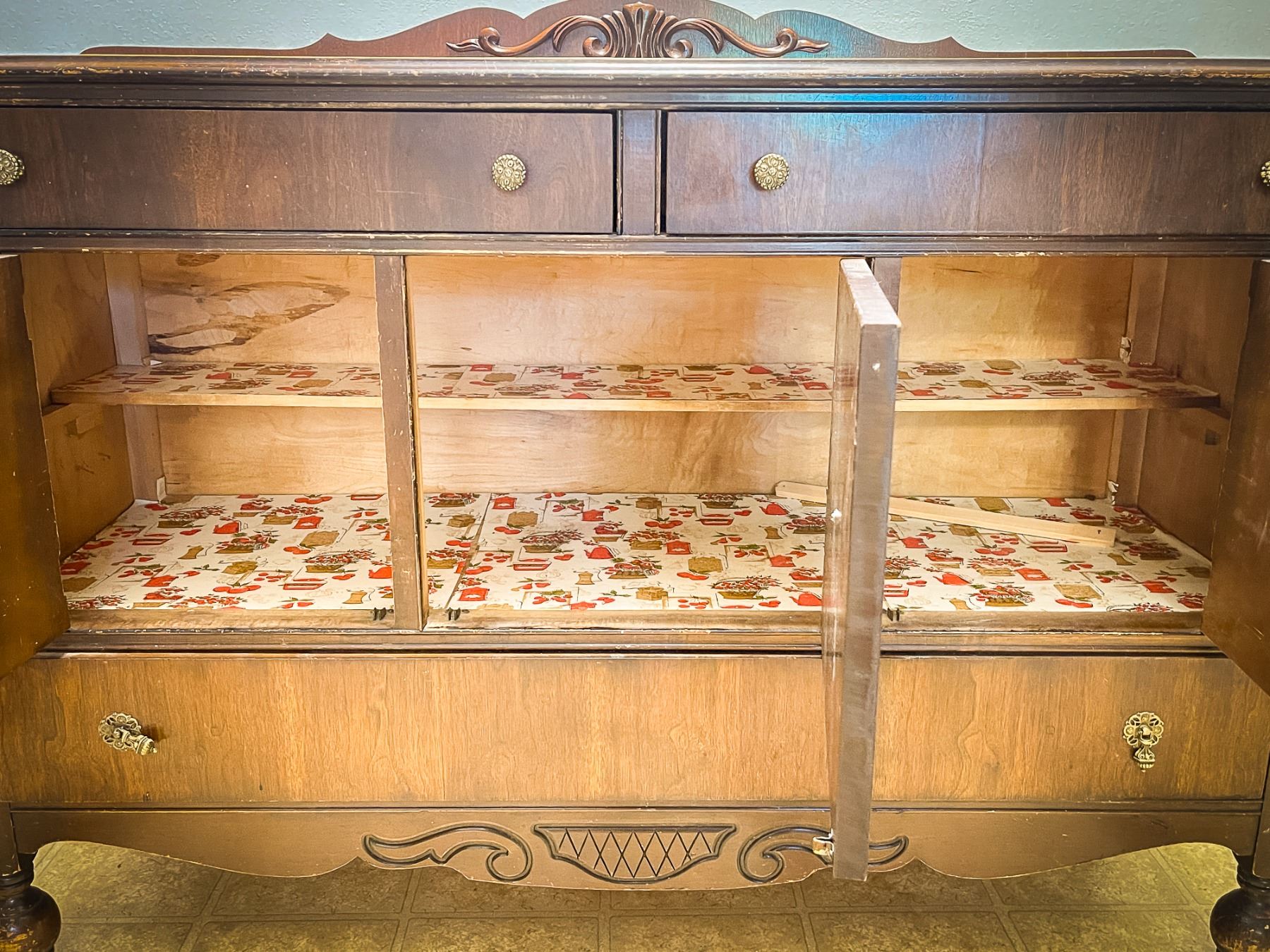 Heavy solid wood piece with carved details, turned legs, and original hardware. Two top drawers, large lower drawer, and center cabinets with shelves. Surface wear consistent with age; sturdy with lots of character. Buyer must bring help to move/load.