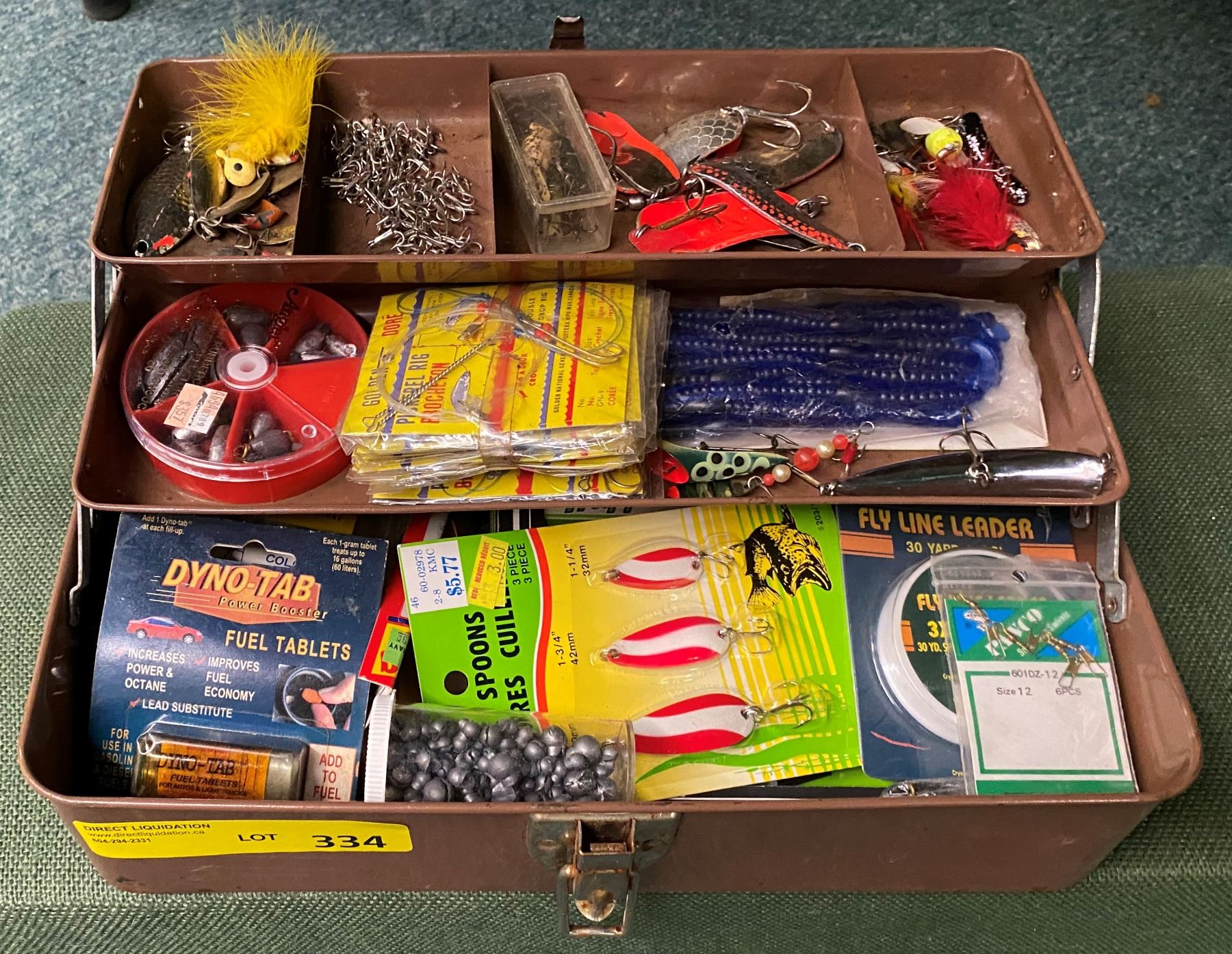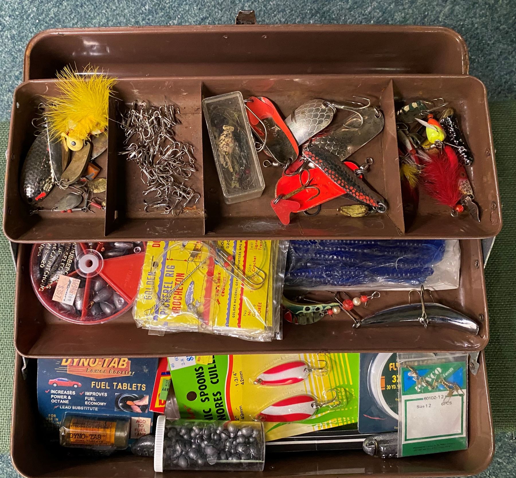 Vintage brown metal tackle box & contents (mostly fresh water tackle)