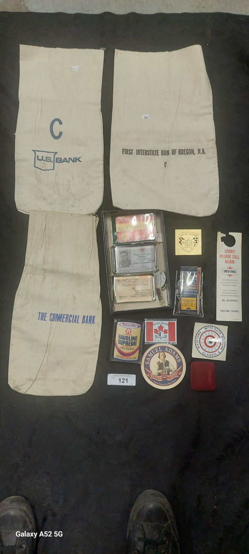 Vintage collectibles lot, decals, bank bags