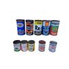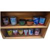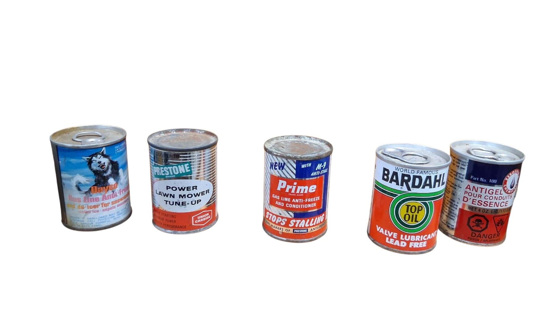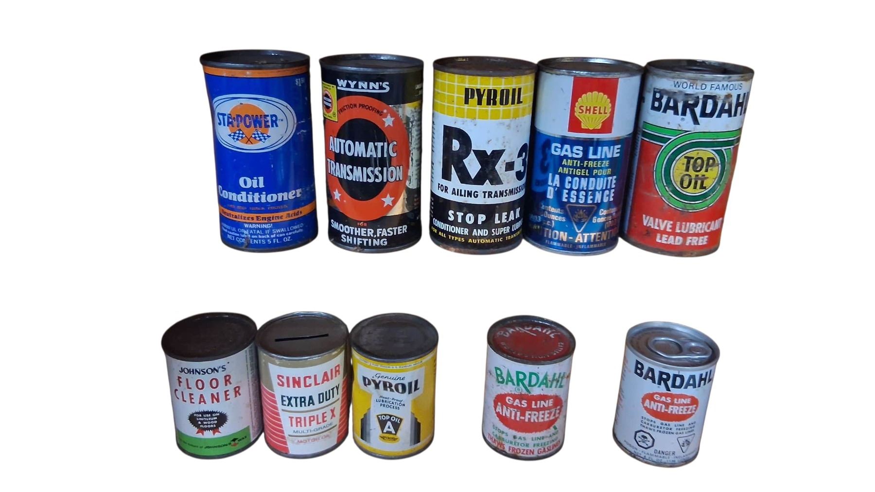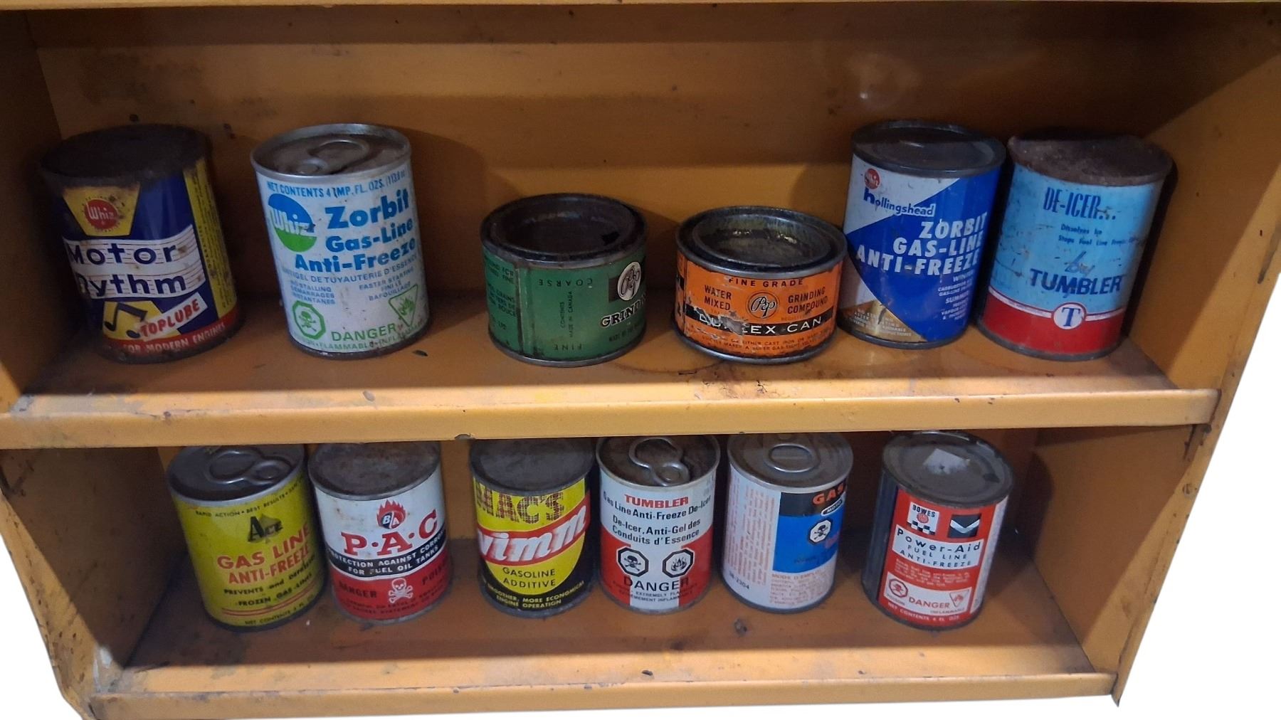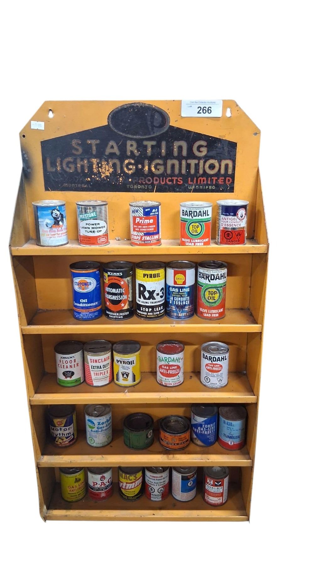 Vintage early 20th century metal shop rack, with approx 26 4 & 6 oz vintage petroliana tins, rack 32"x16"x4.5"