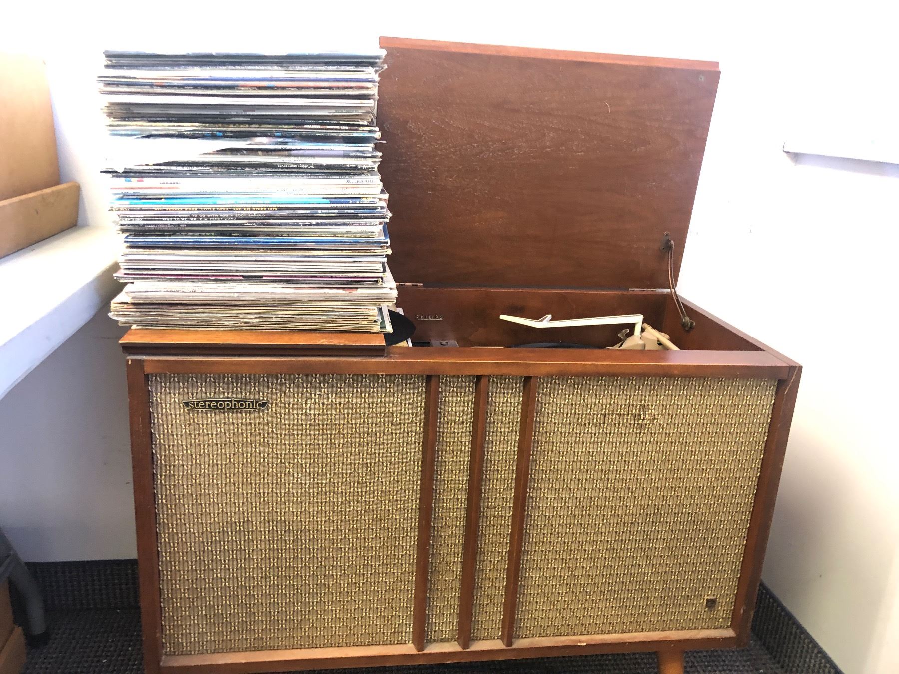 Vintage estate Steorophonic high fidelity record player (tested works perfectly) radio w/ vinyl records - approx 34" x 16" x 26 1/2")