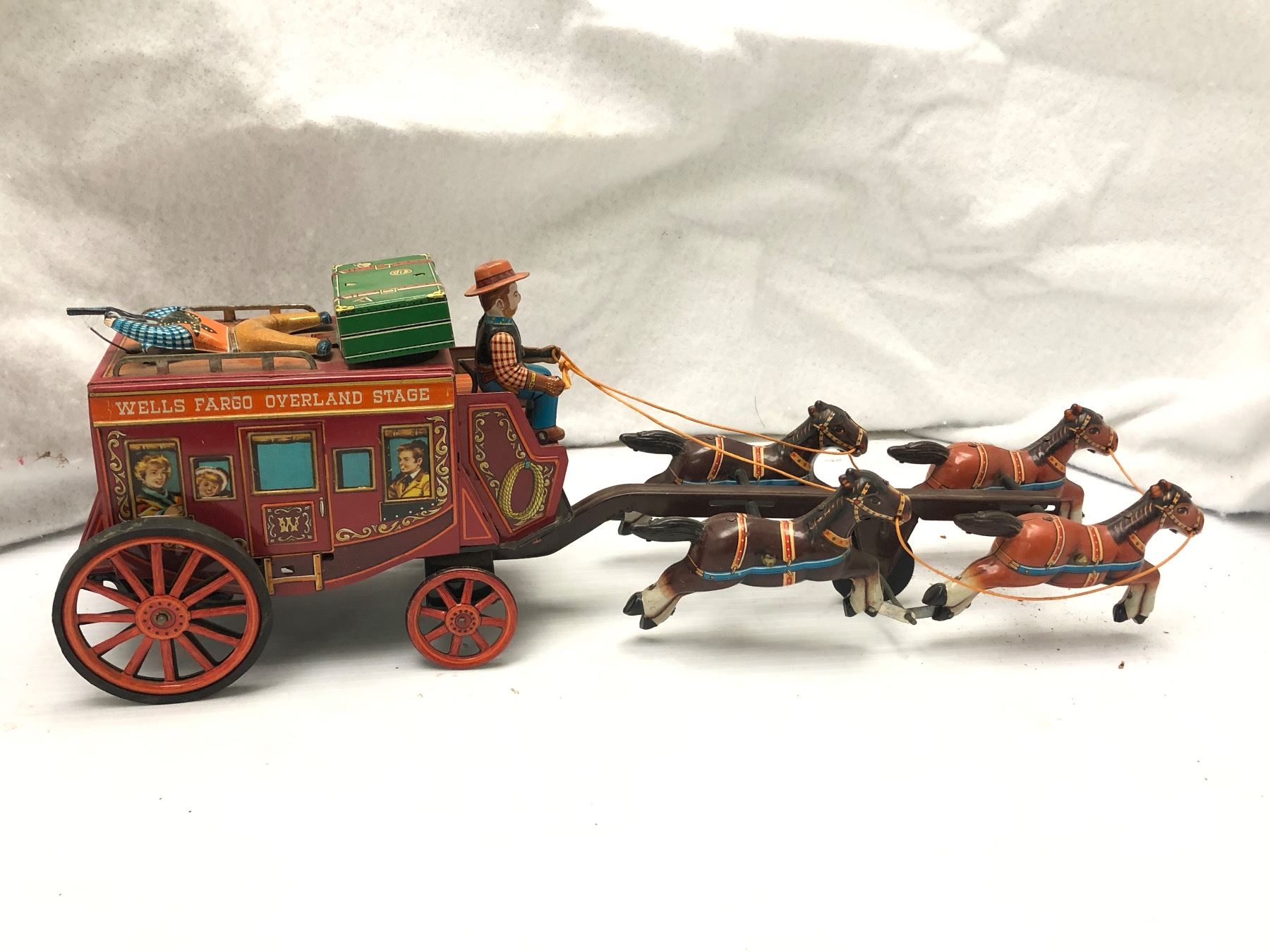 Vintage estate Wells Fargo overland stage - horse-drawn carriage w/ rider tin toy