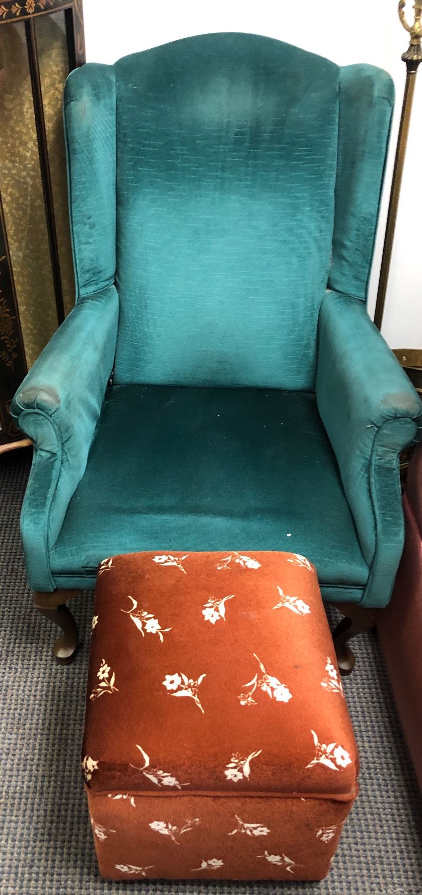 Vintage estate green wingback chair (approx 24" x 25 1/2" x 38 1/2" H) & Ottoman 15" x 14" x 16 1/2" H