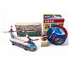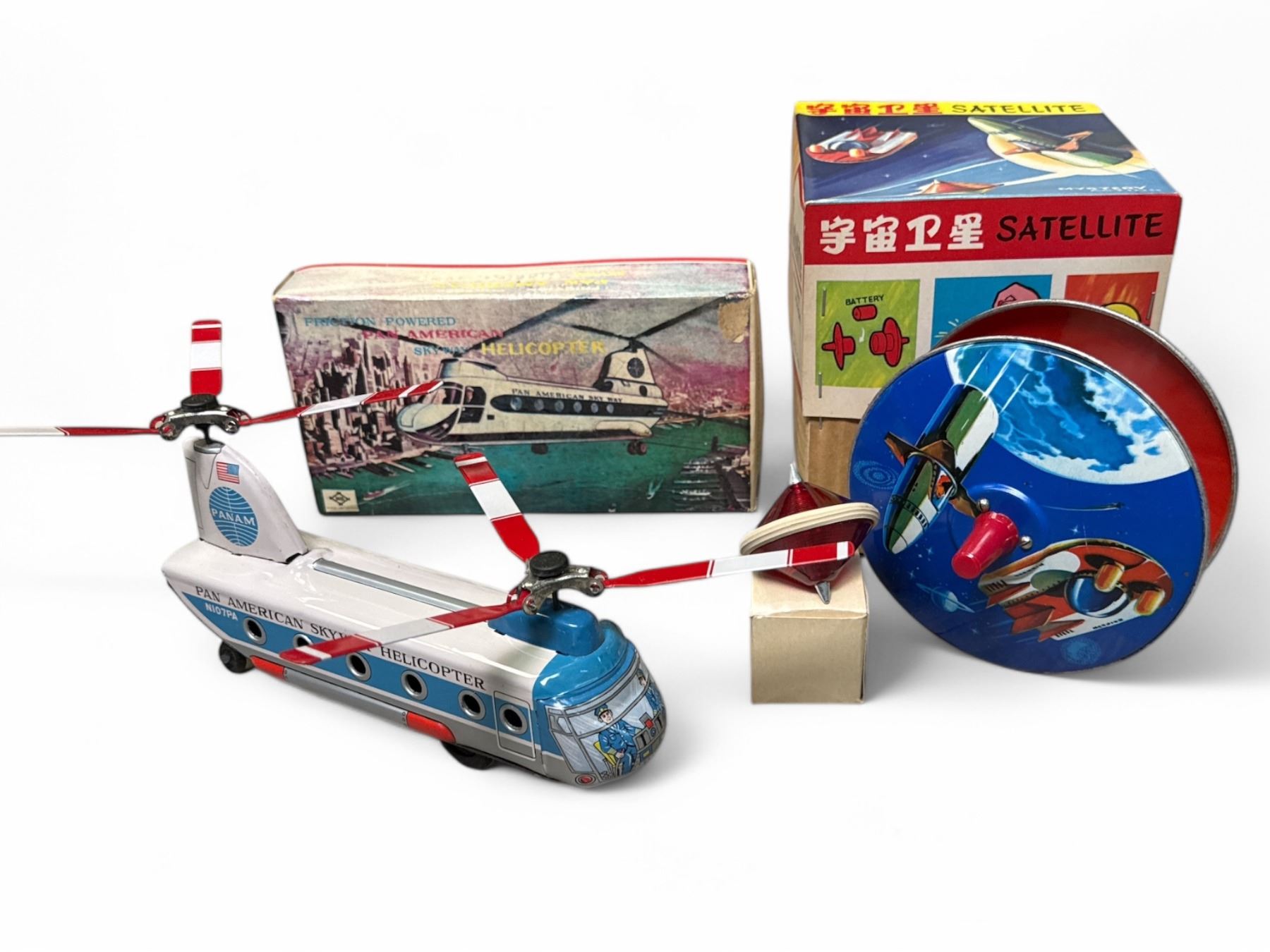 Vintage friction powered helicopter toy & Mystery action satellite toy in original boxes