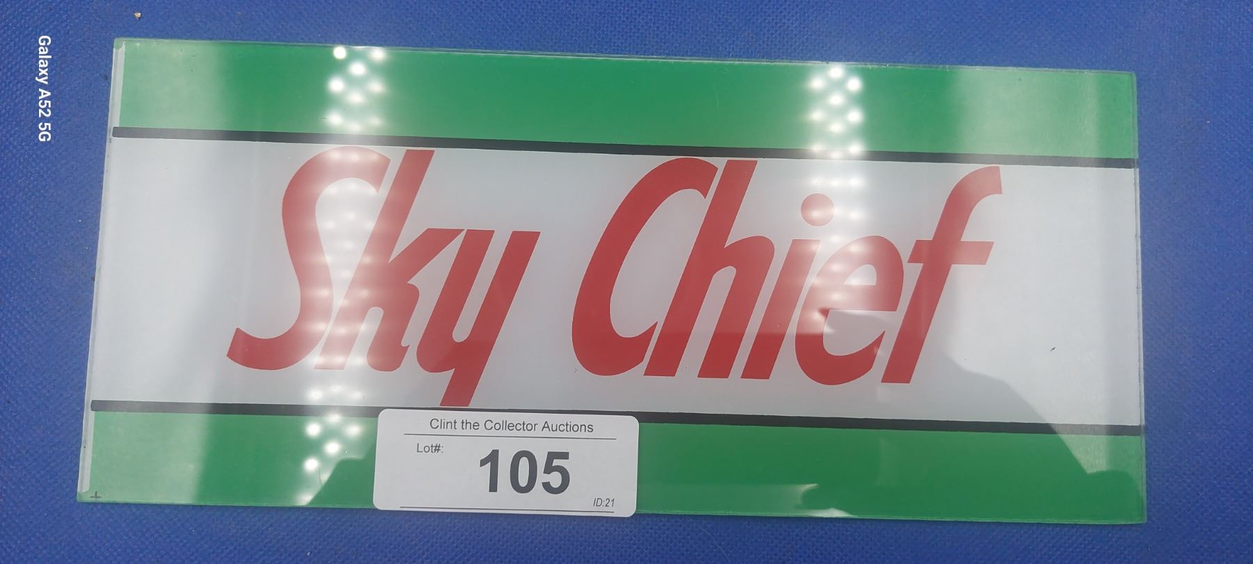 Vintage glass Sky Chief gas pump plaque 10" x 5"