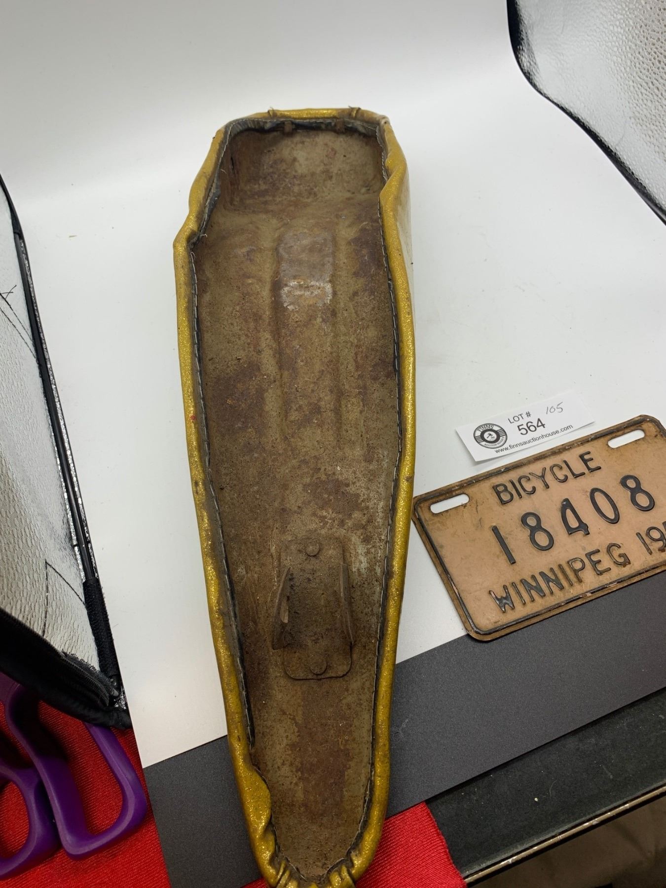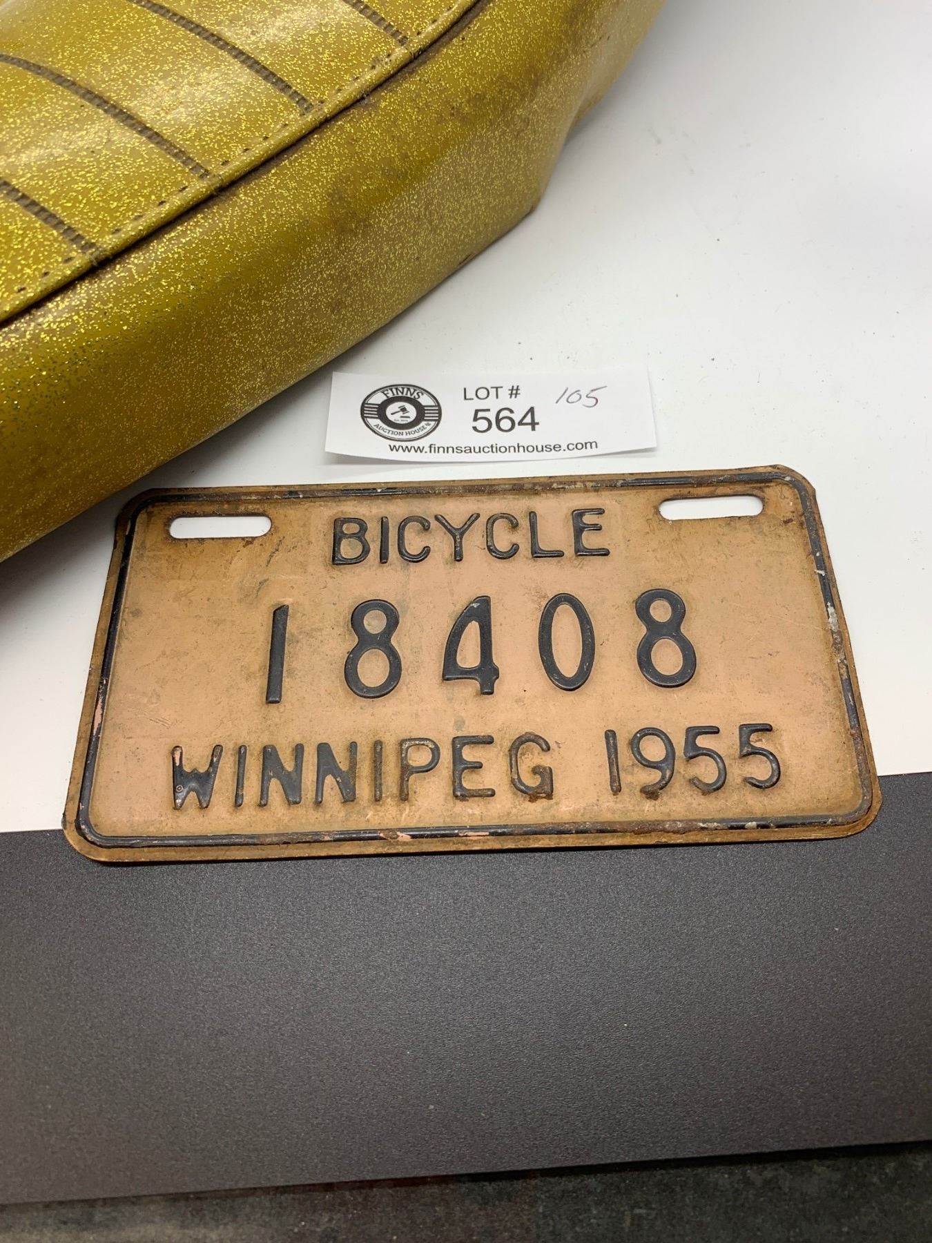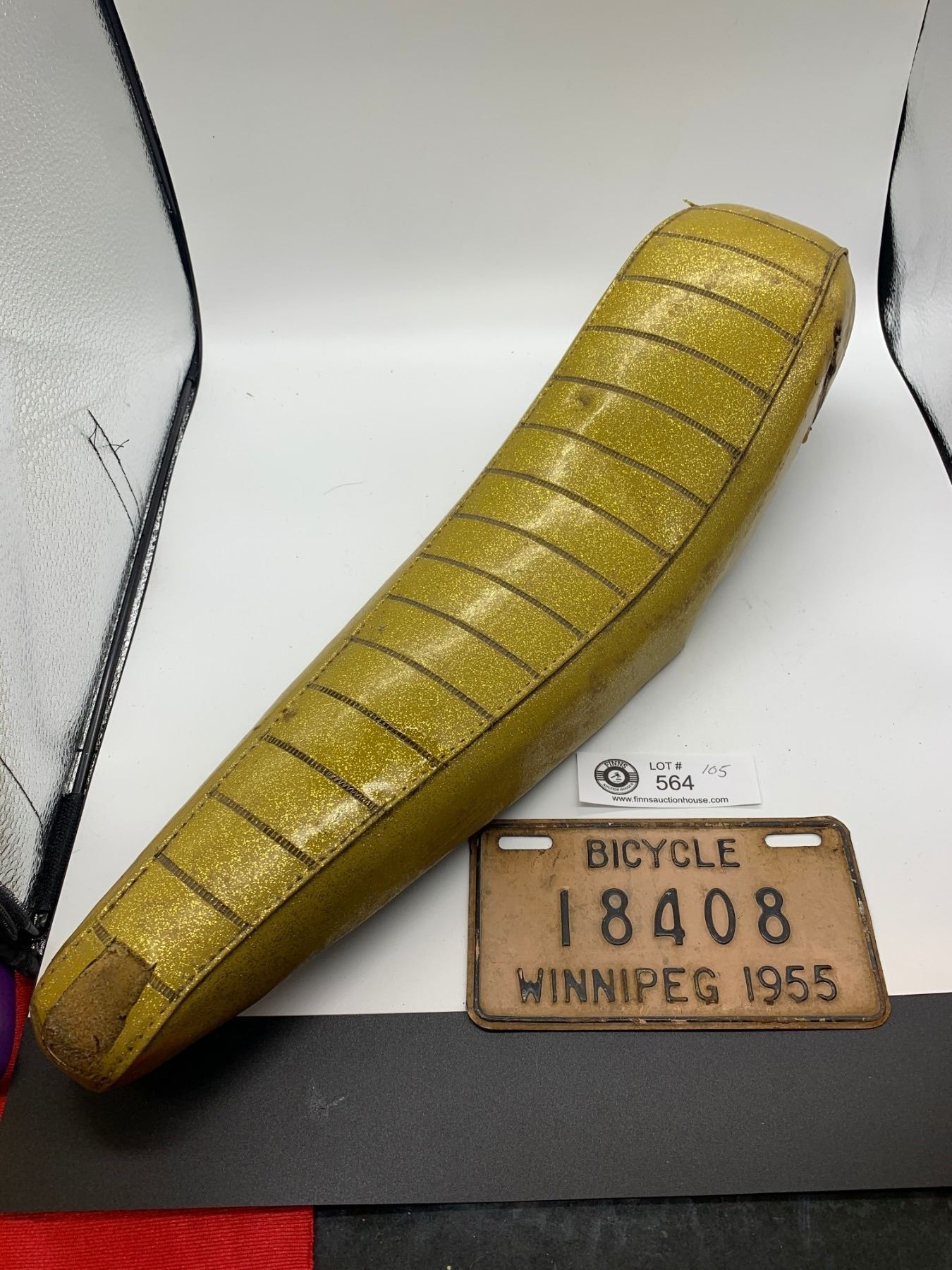 Vintage gold flake bannana seat and winnipeg 1955 bicycle License Plate