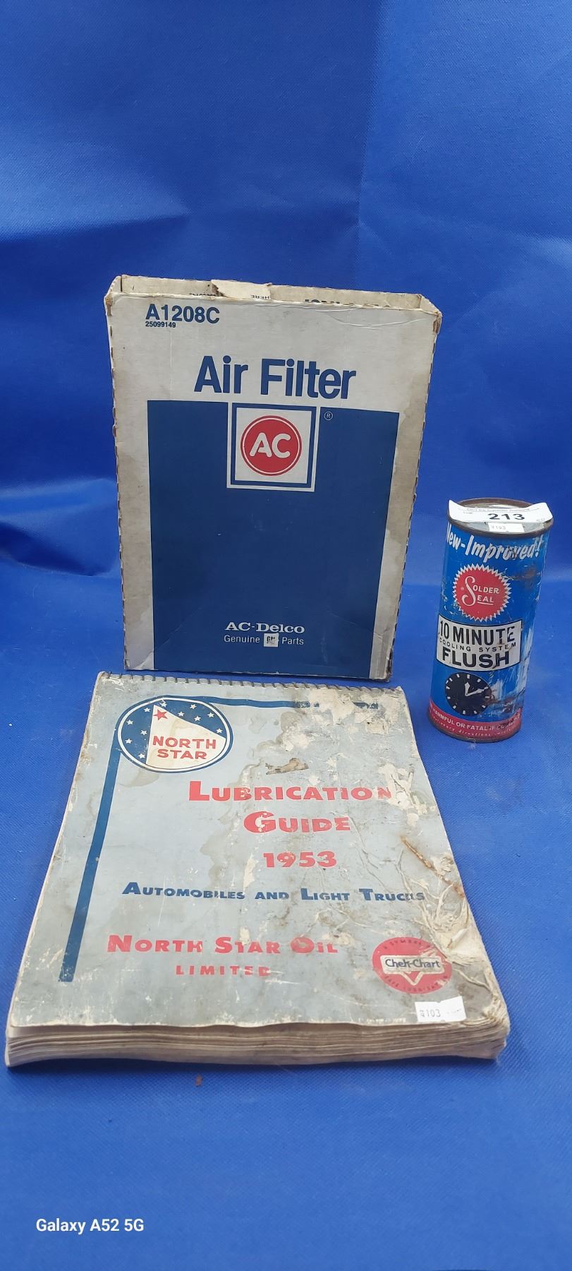 Vintage lot including Lubrication guide, air filters & cooling system flush