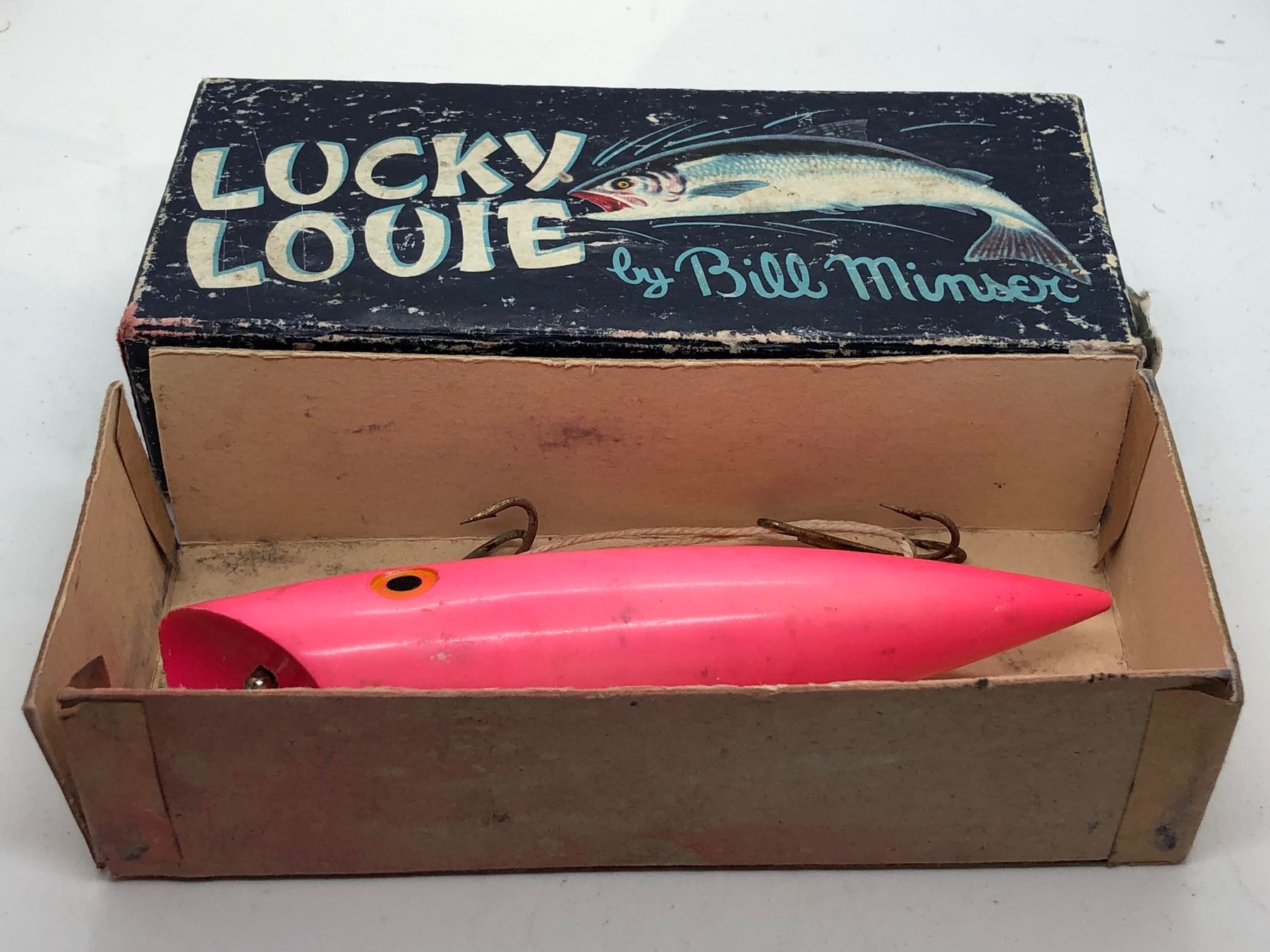 Vintage lucky louie by Bill Minser "pearl pink" 5 1/2" fishing plug w/orginal box