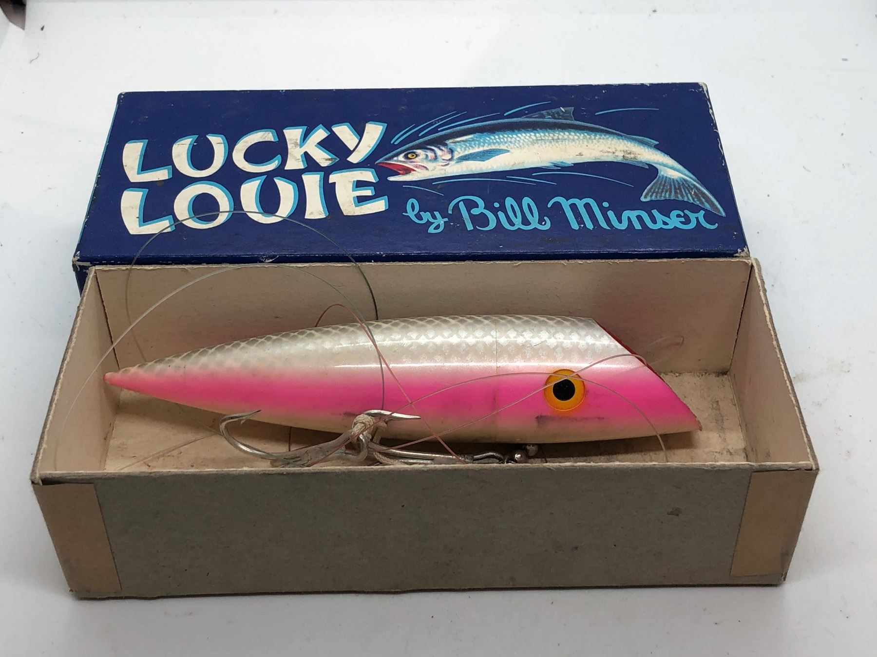 Vintage lucky louie by Bill Minser "silver pearl pink" 5 1/2" fishing plug w/orginal box