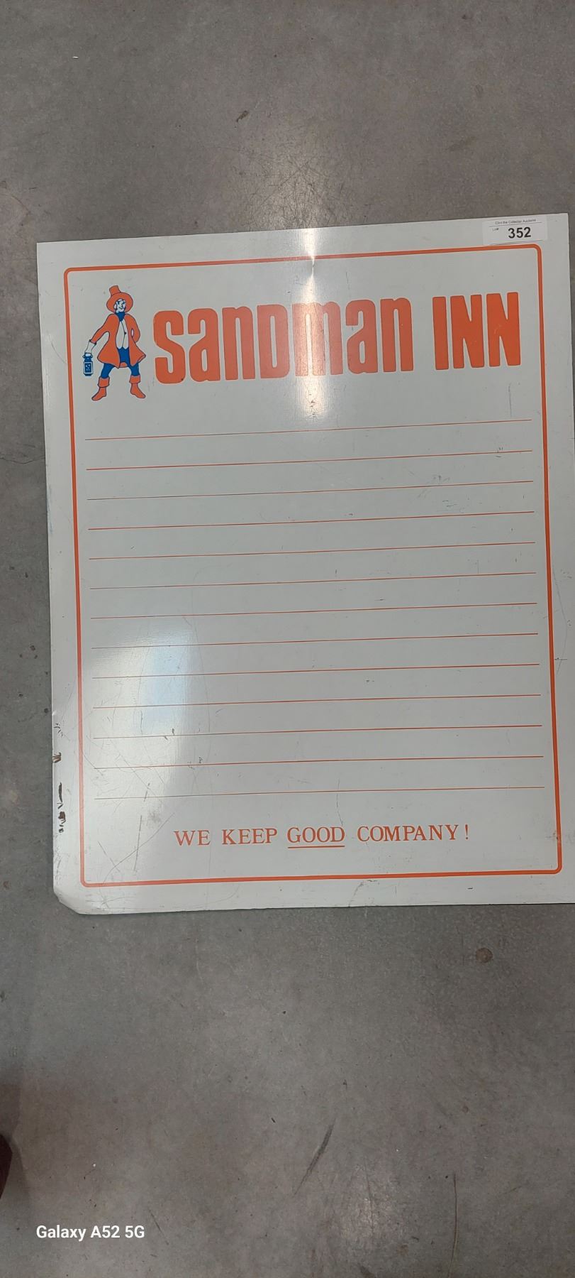 Vintage metal Sandman Inn hotel sign 28"x24"
