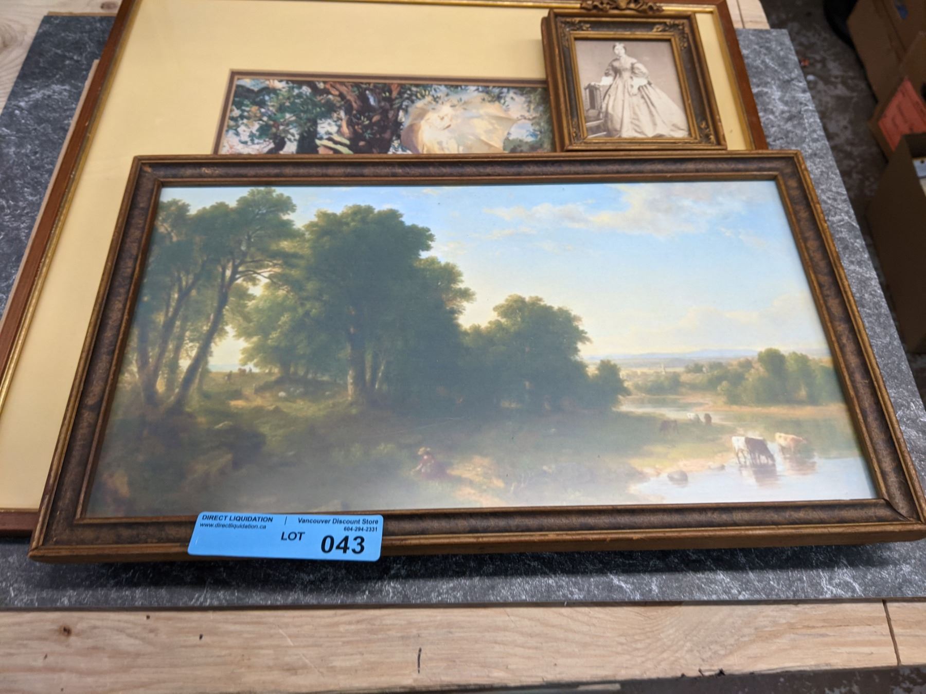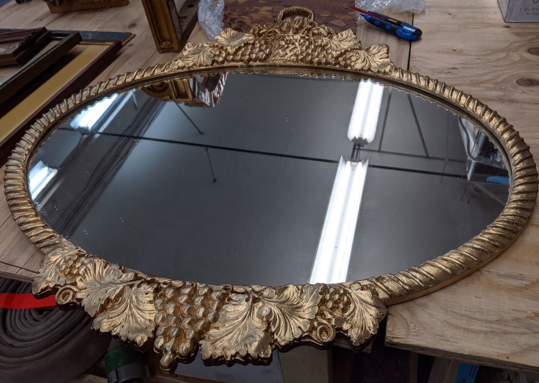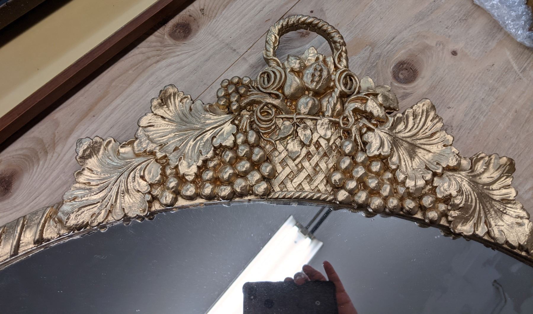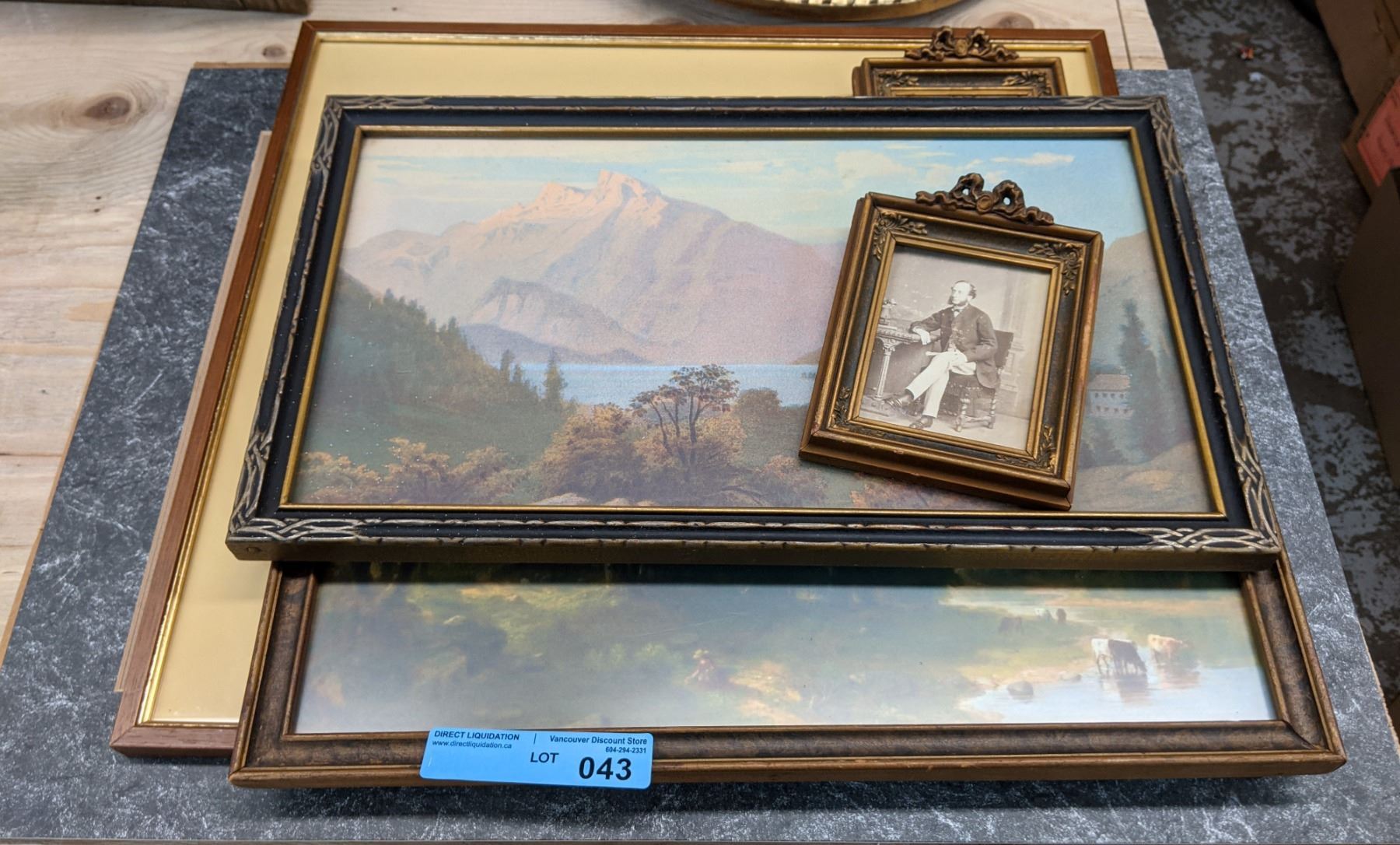 Gorgeous round vintage mirror with intricate details, 20"x27". Plus, an assortment of antique pictures in various decorative frames, 19x21, 19x12, 5x7