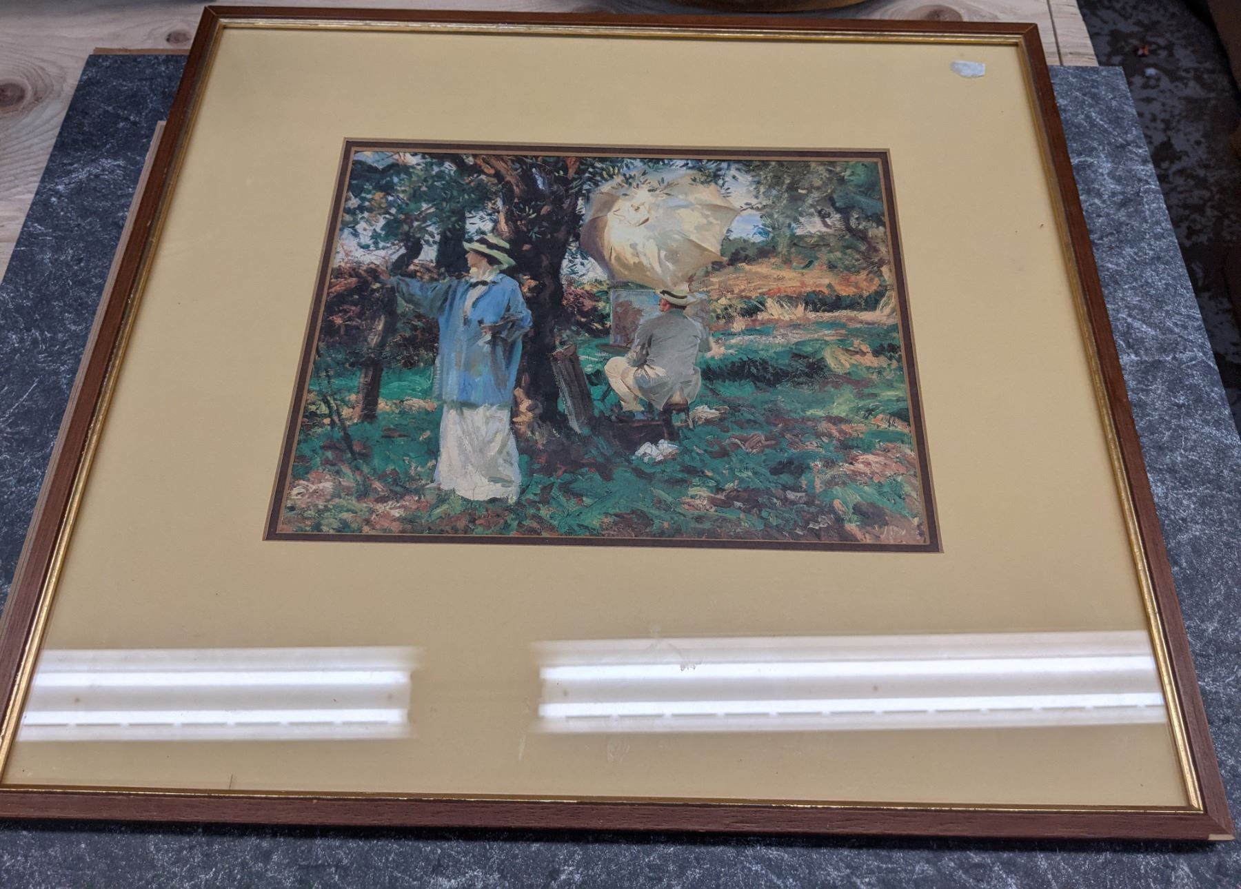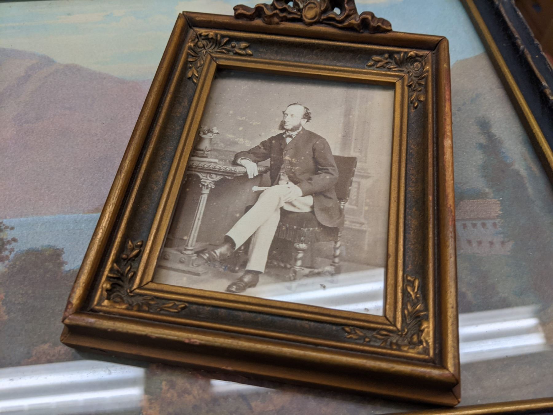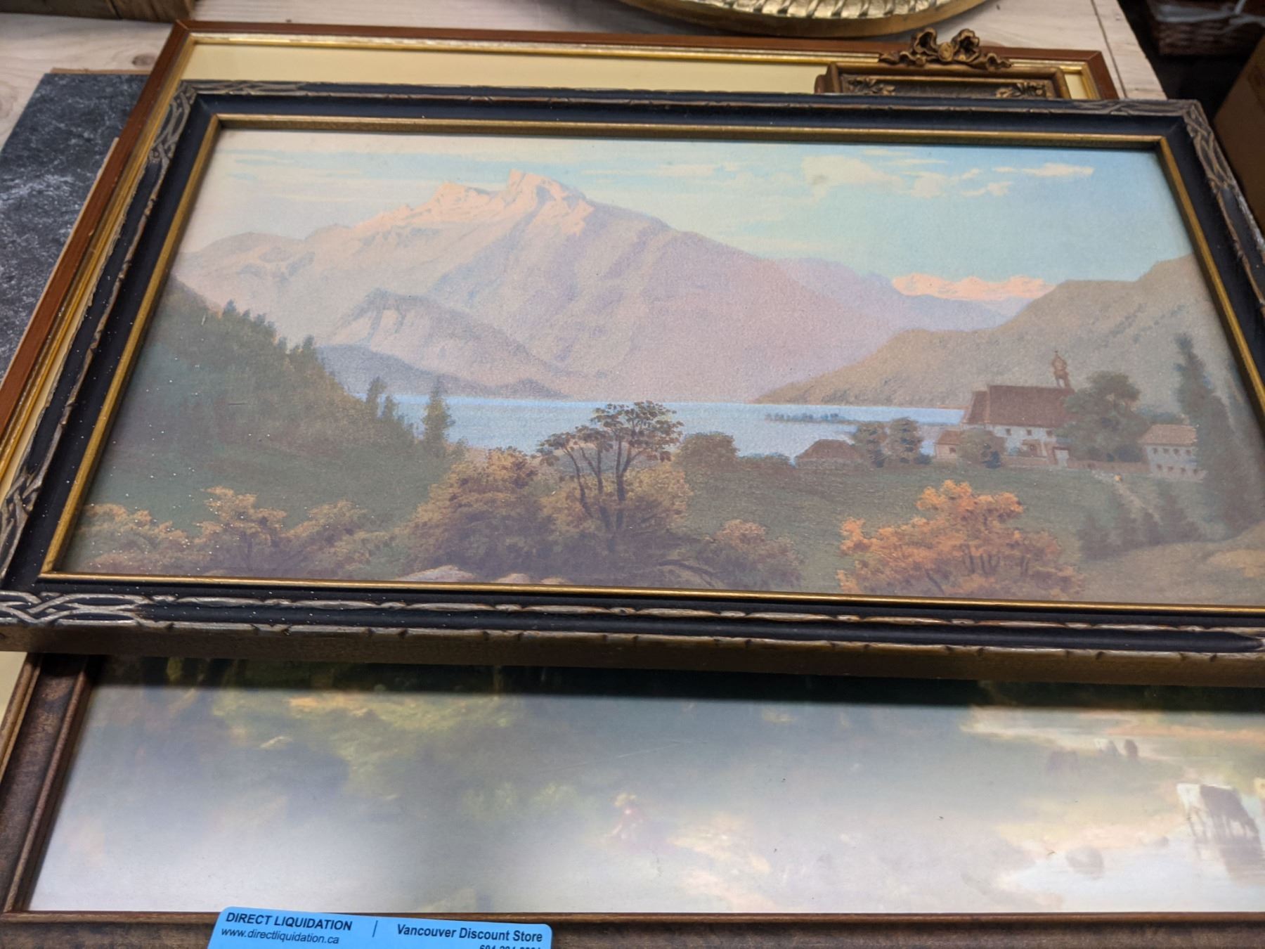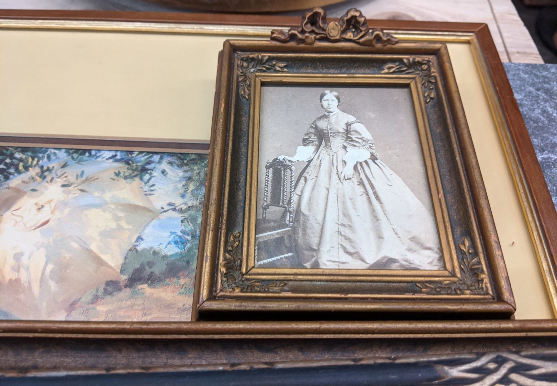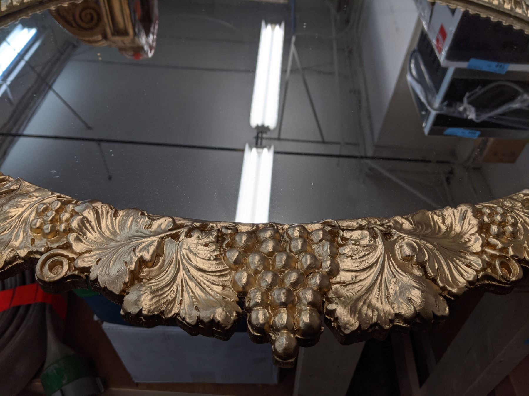 Gorgeous round vintage mirror with intricate details, 20"x27". Plus, an assortment of antique pictures in various decorative frames, 19x21, 19x12, 5x7