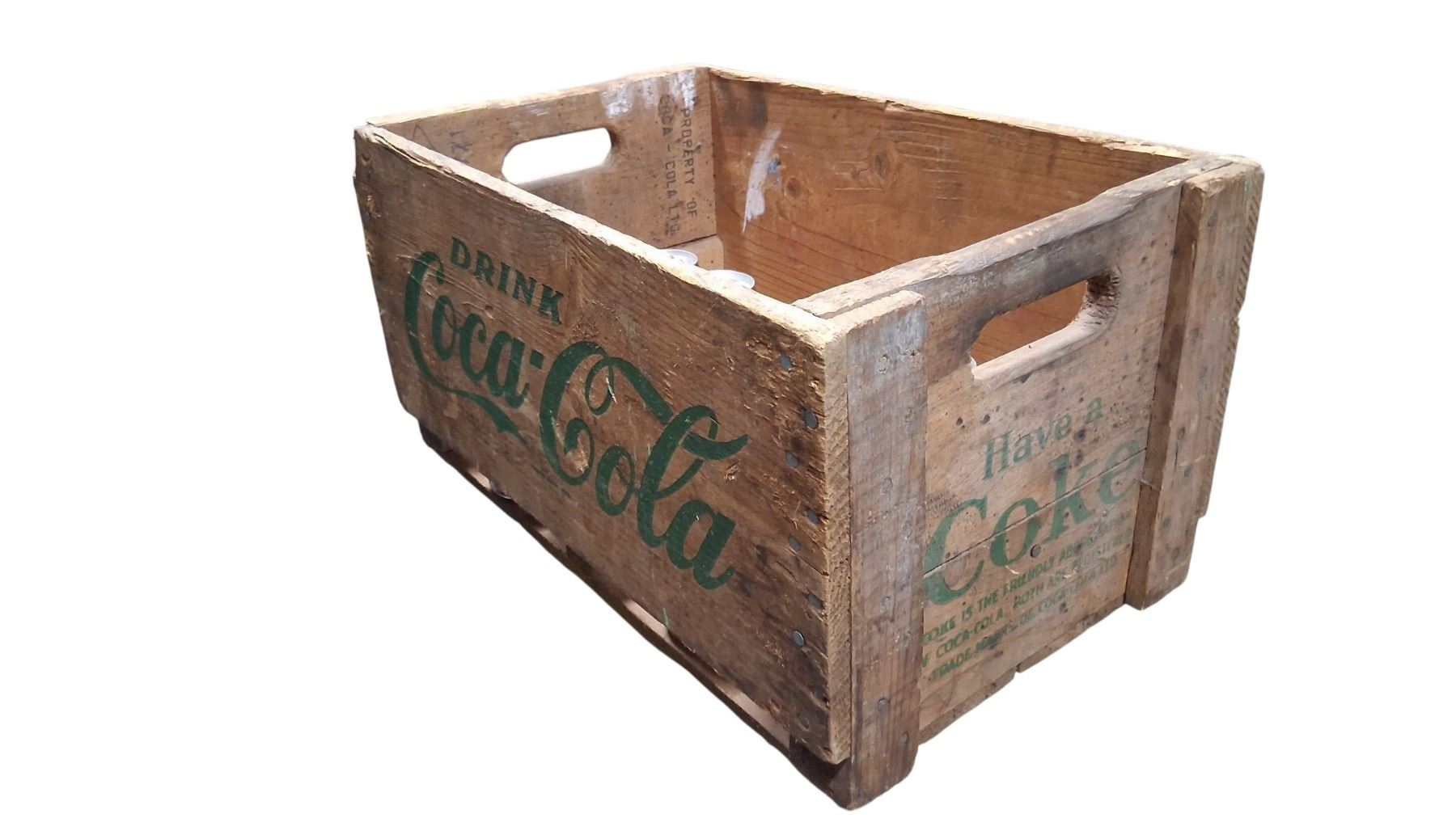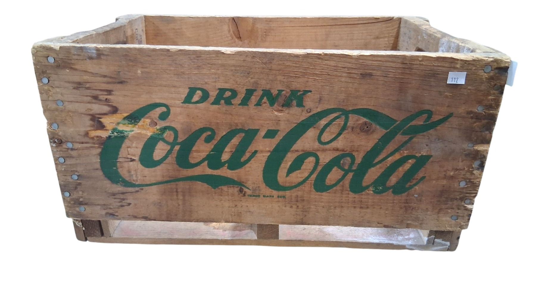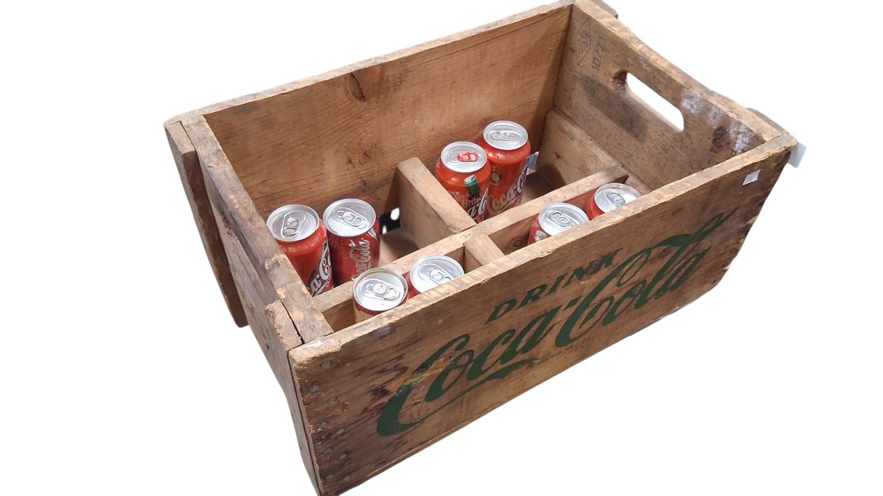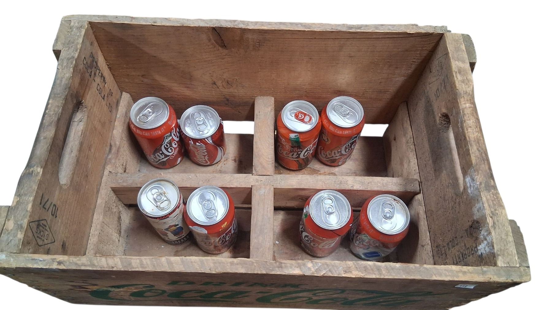 Vintage wood Coca Cola crate with 8 vintage cans full