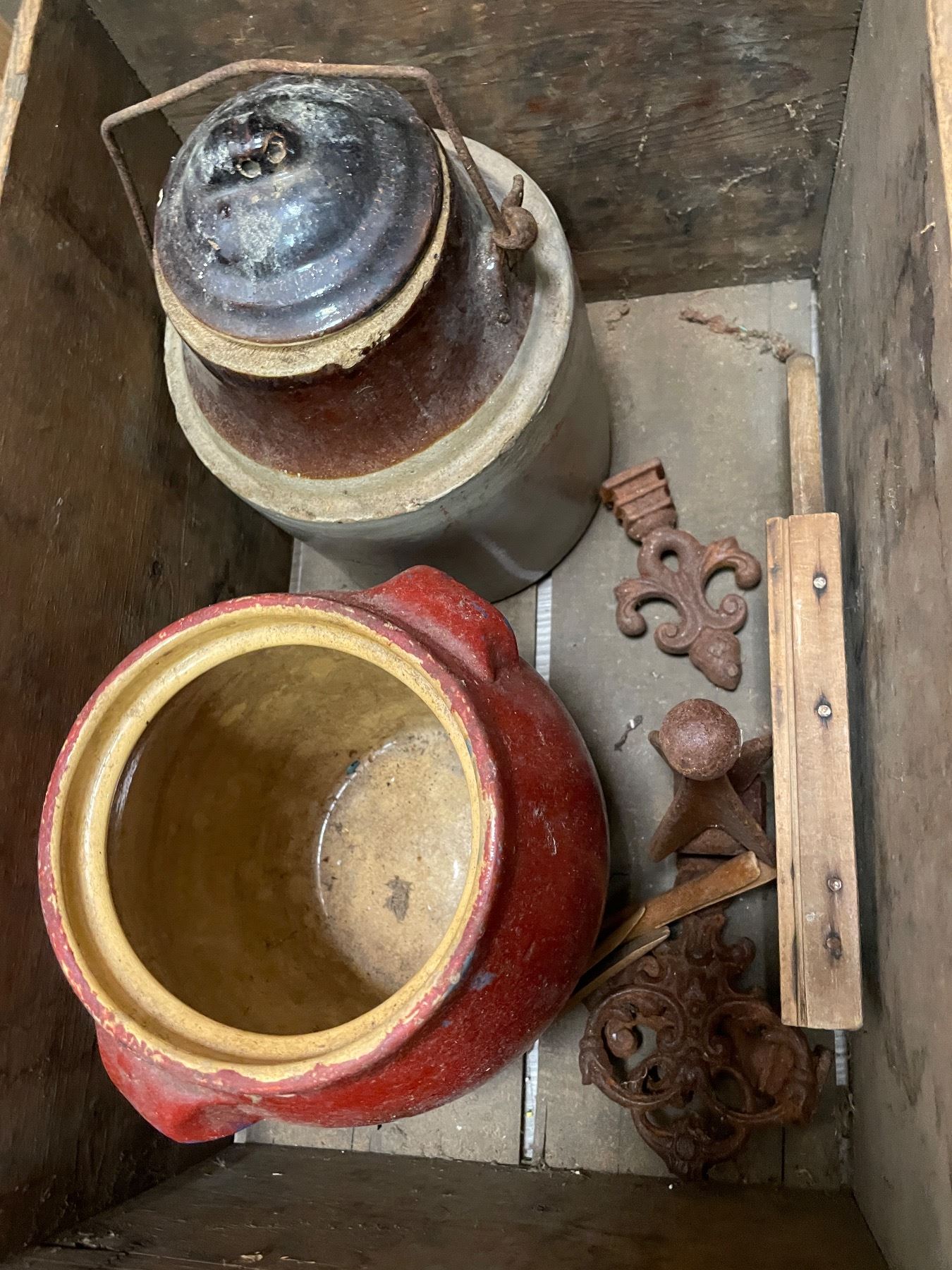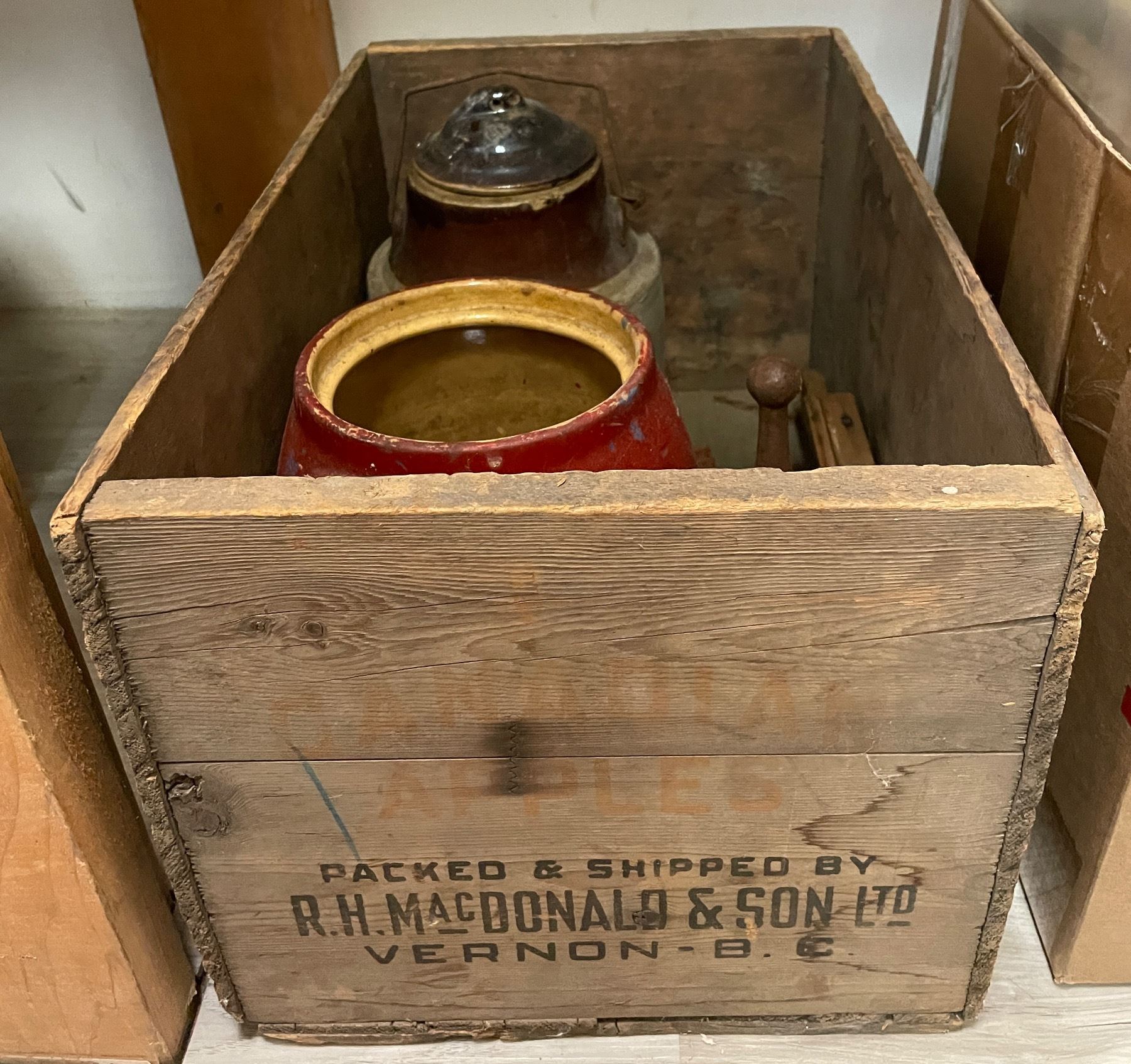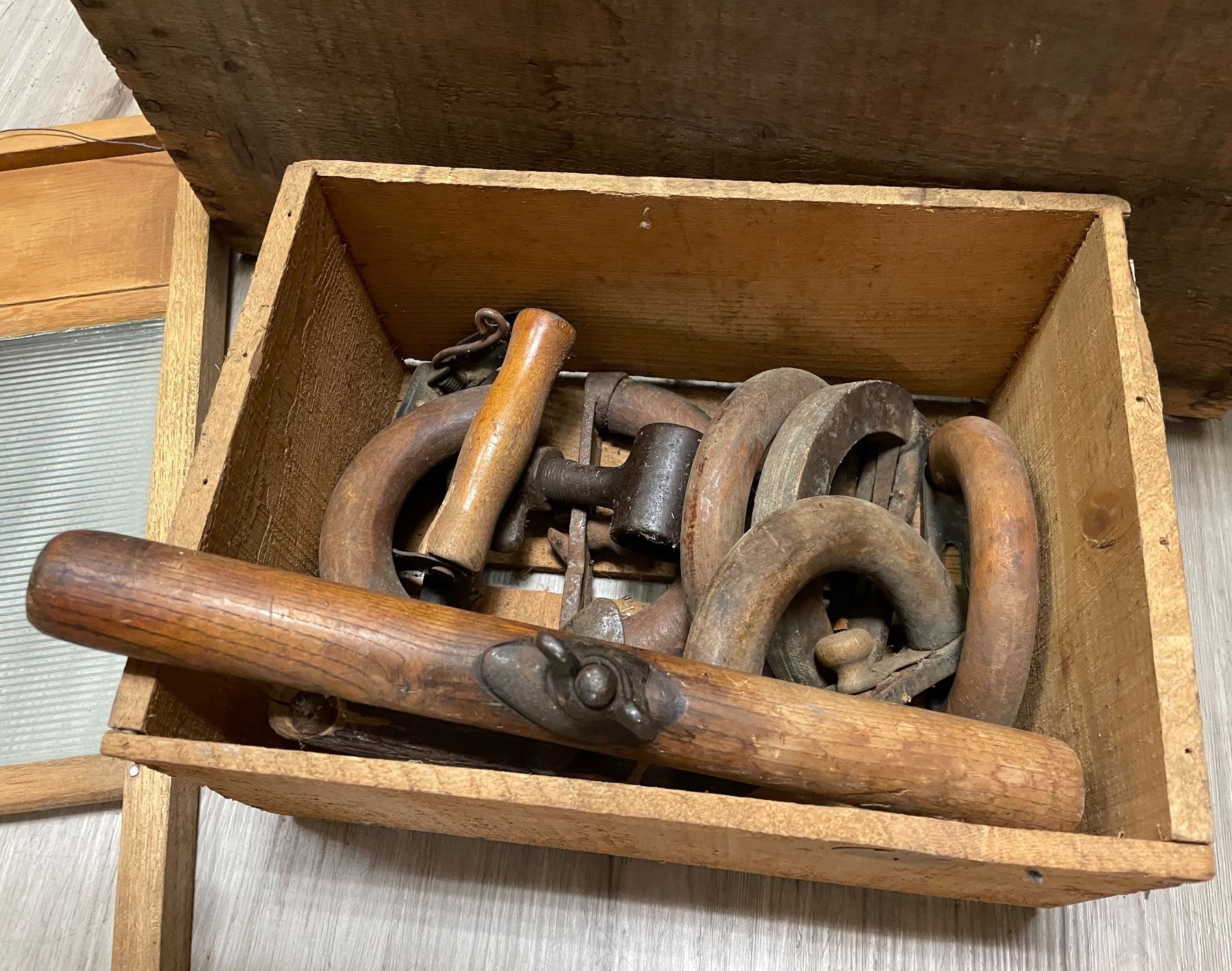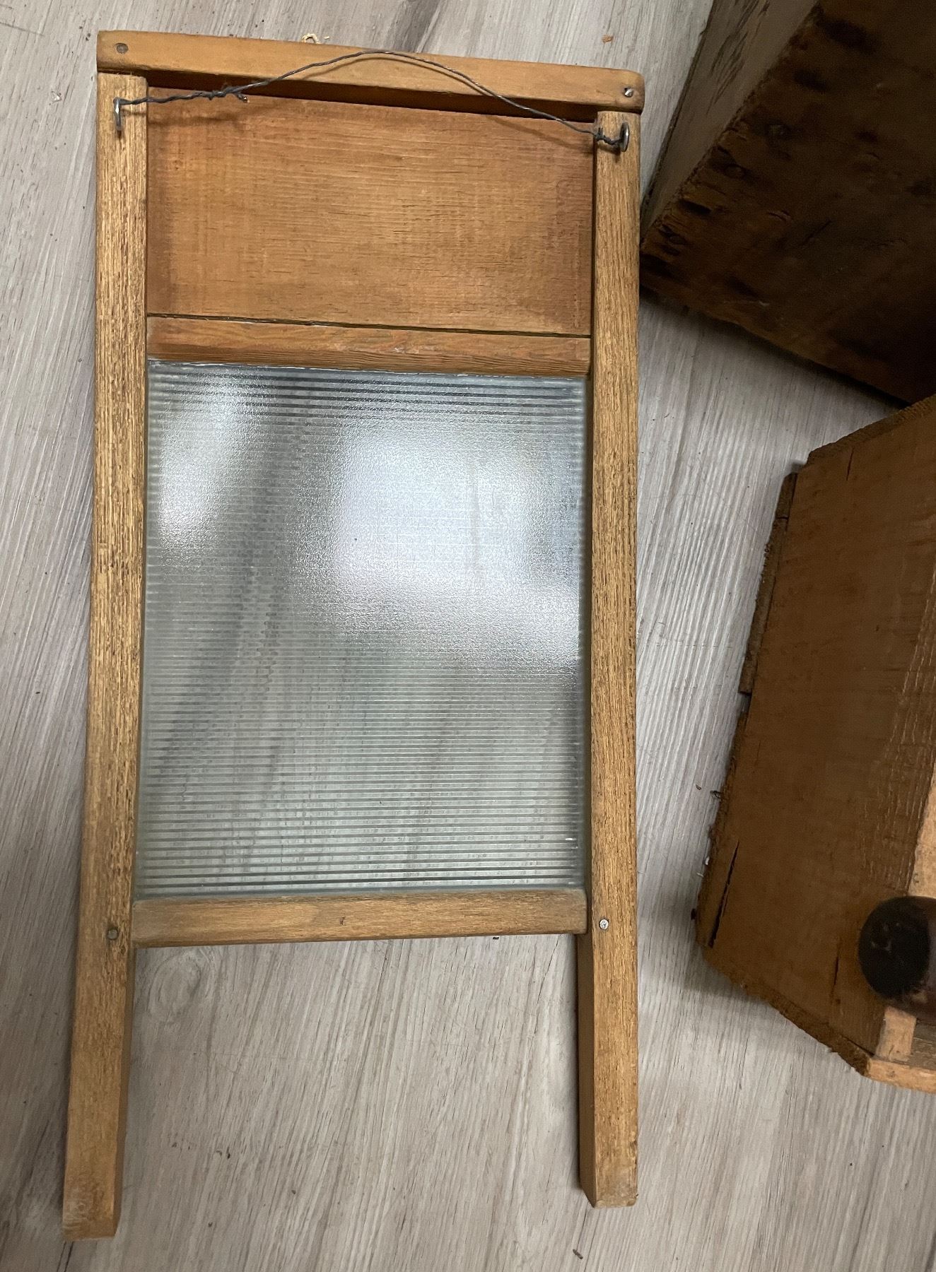 Vintage wooden crate containing washboard, vintage tools & ceramics