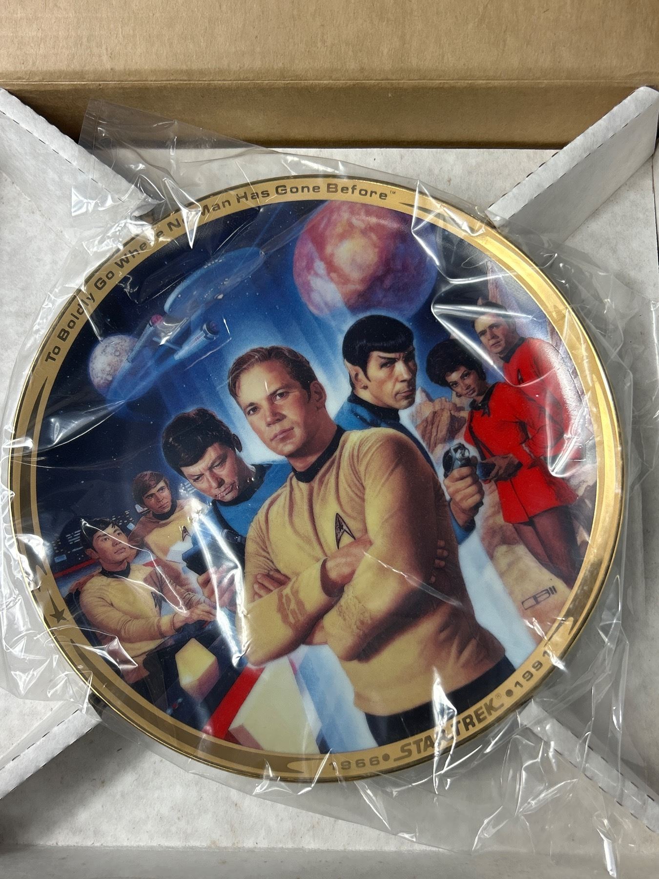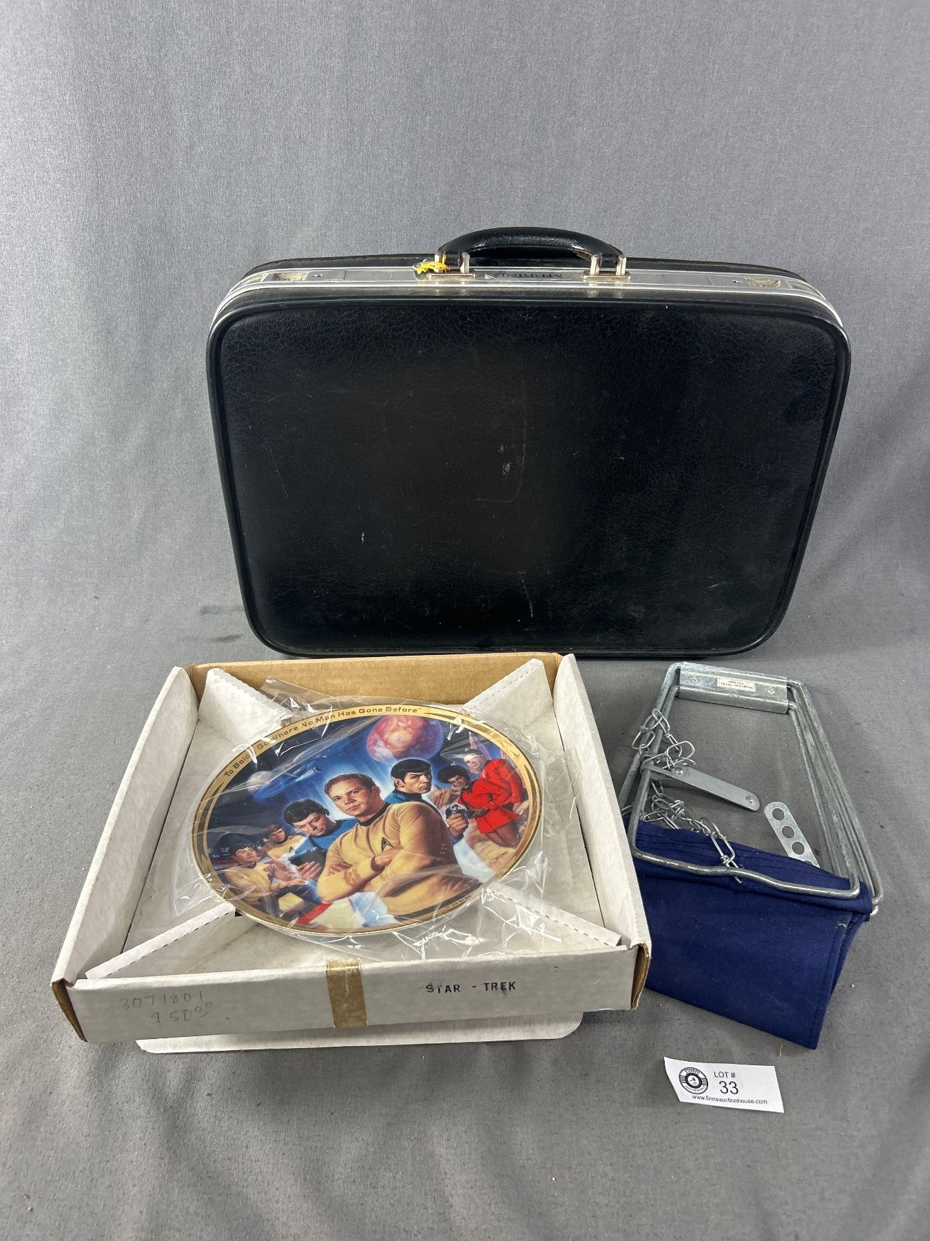 Vintge Hard Sided Suitcase with Contents, Star Trek Collector Plate etc