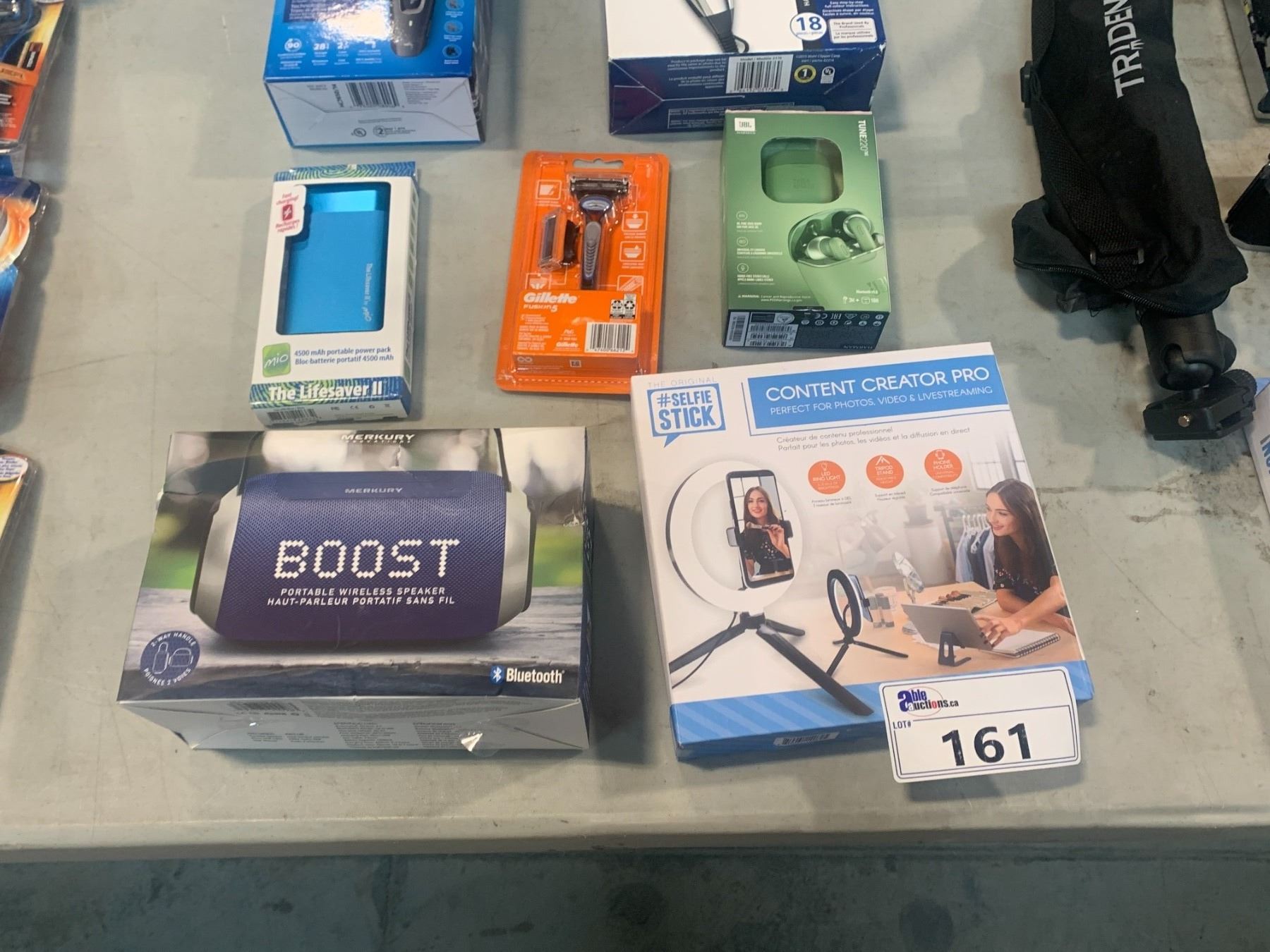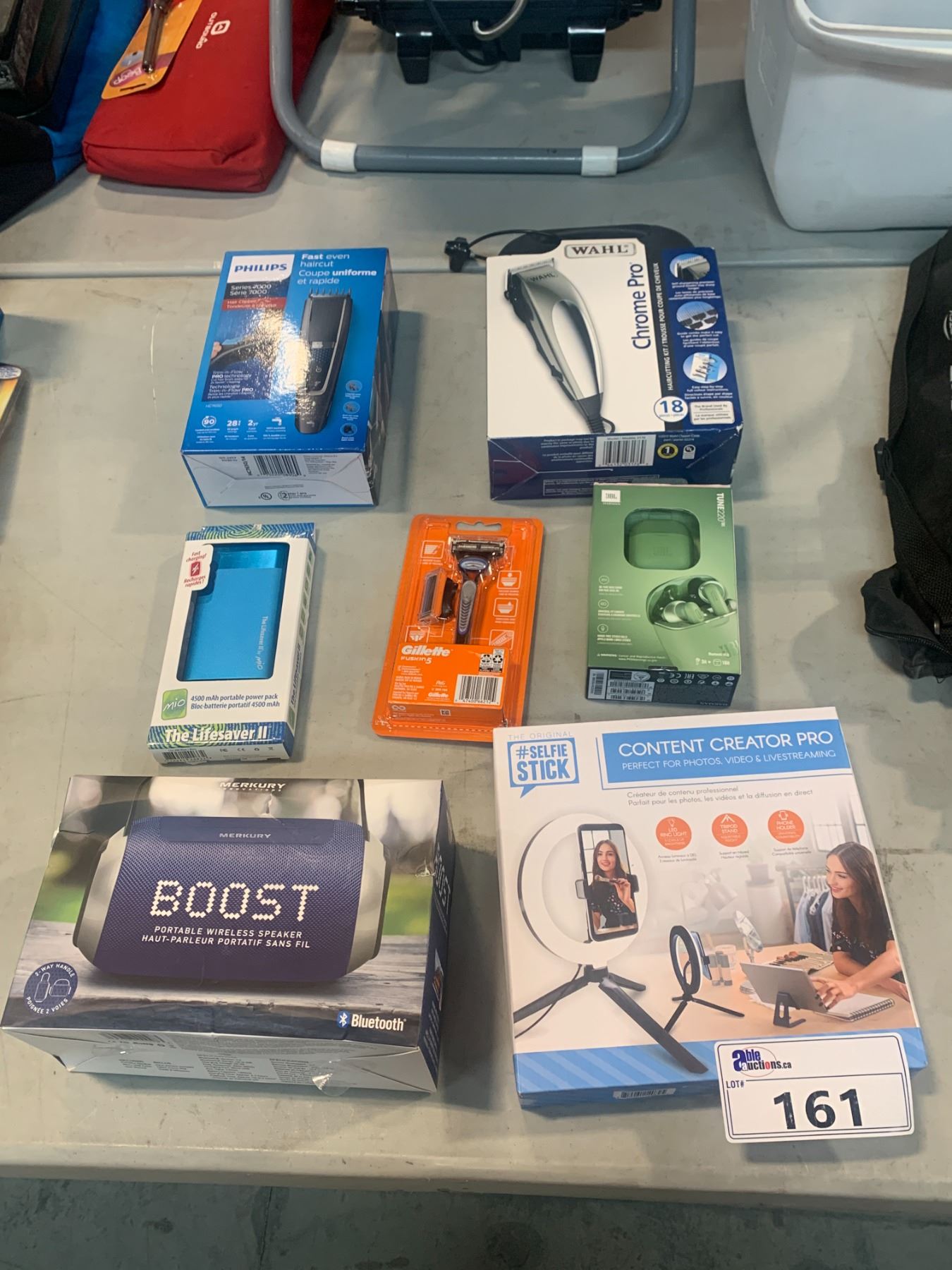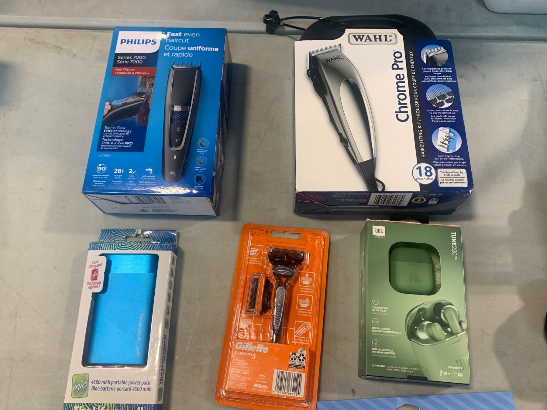 WAHL HAIRCUTTING KIT, PHILIPS SERIES 7000 TRIMMER, BOOST PORTABLE WIRELESS SPEAKER, SELFIE STICK, JBL WIRELESS EARBUDS, THE LIFESAVER PORTABLE POWER PACK AND GILLETTE FUSION 5 RAZOR