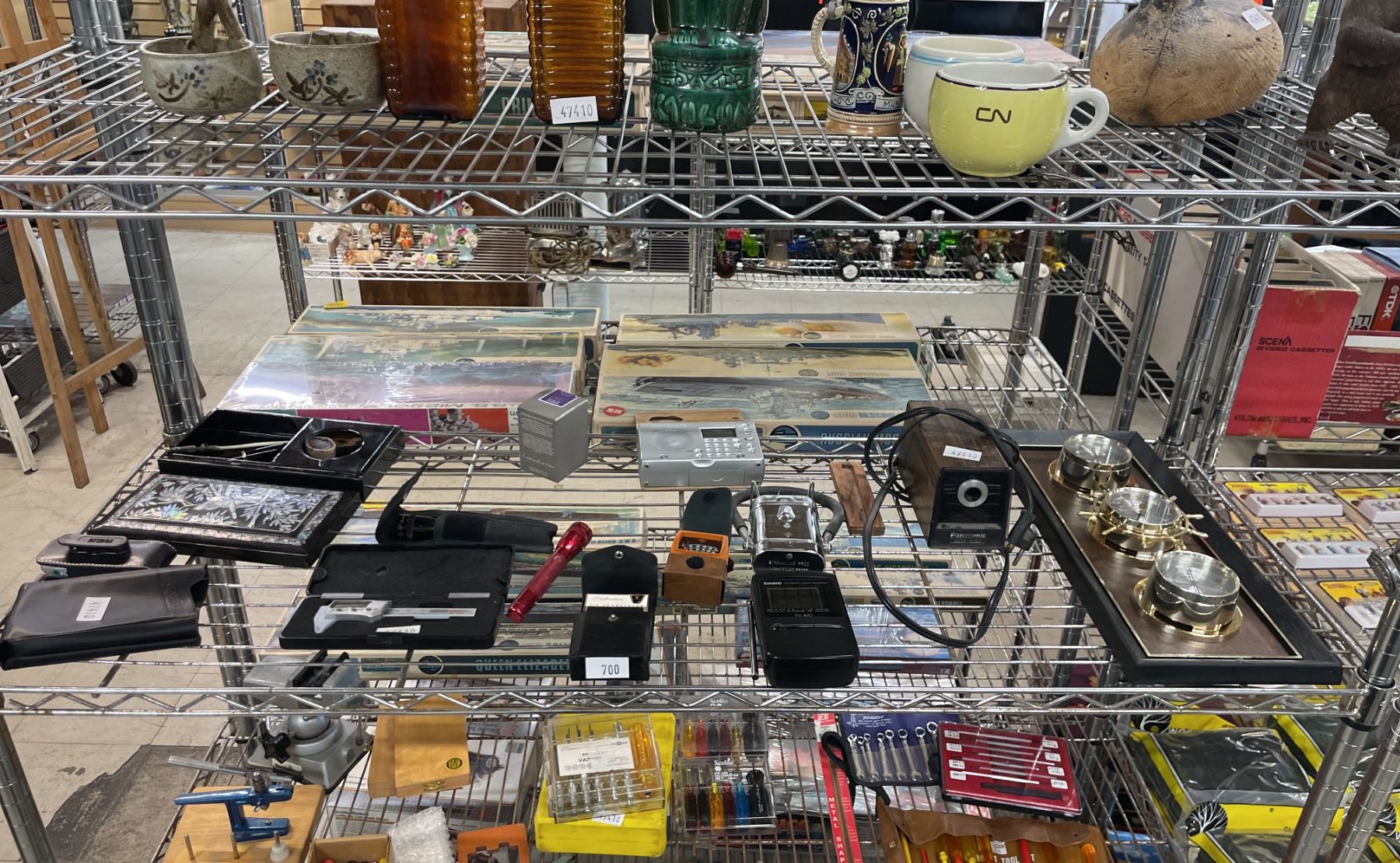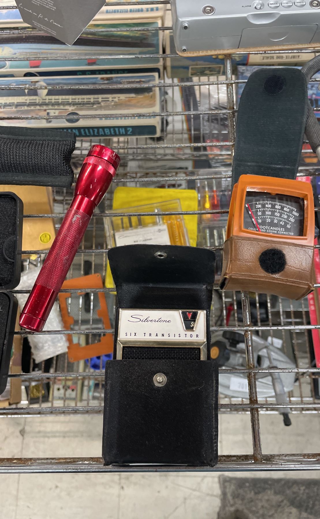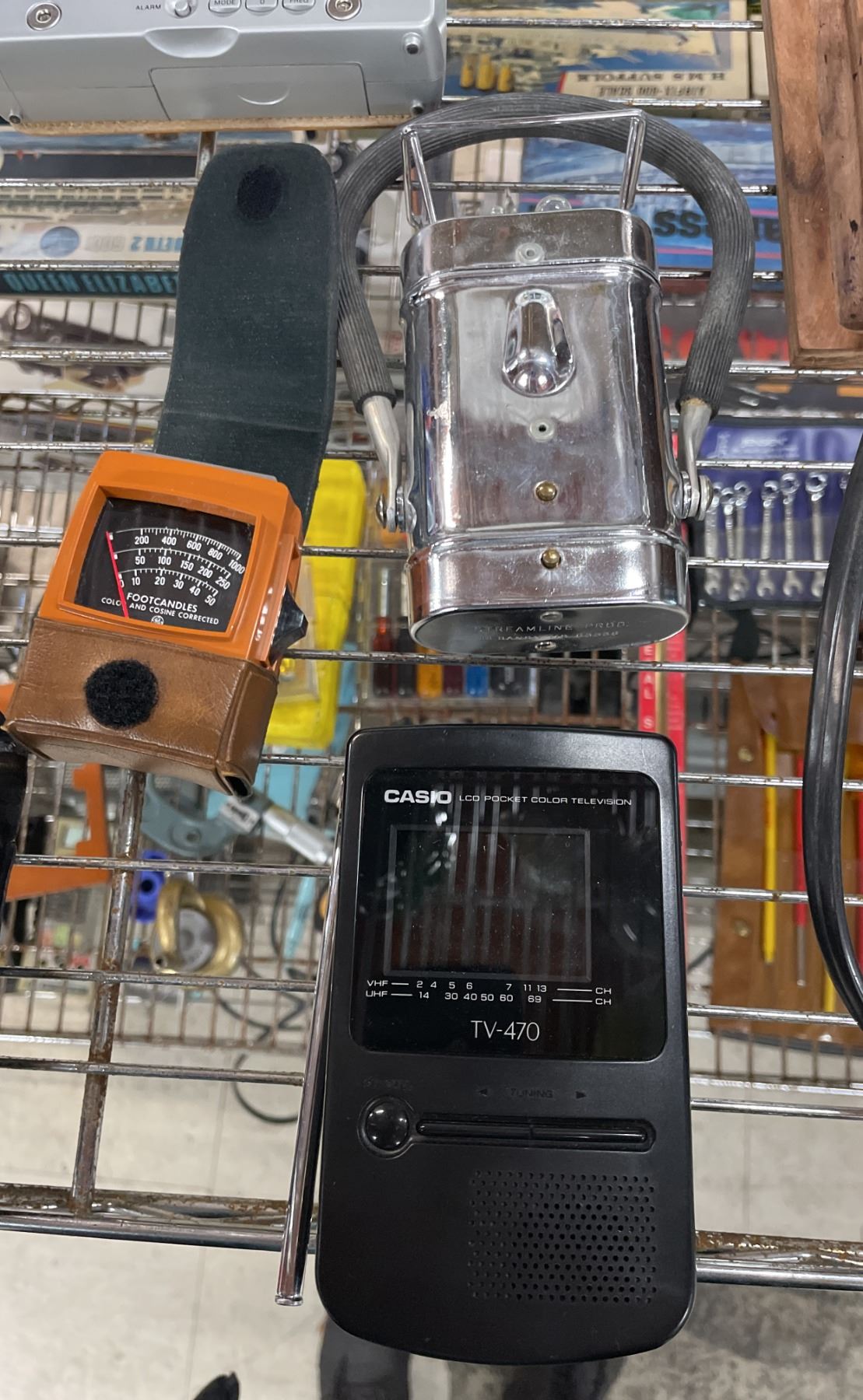 WALL MOUNTED SPRINGFIELD THERMOMETER, BAROMETER & HUMIDITY STATION, PANASONIC PENCIL SHARPENER, CASIO LCD POCKET COLOR TELEVISION, SILVERSTONE SIX TRANSISTOR, GRUNDIG RADIO & MORE