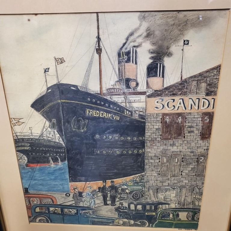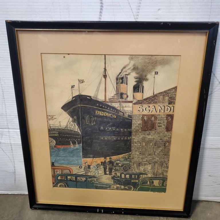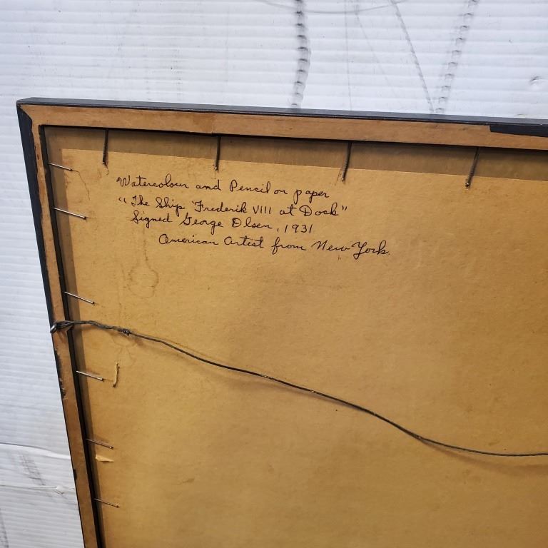 WATERCOLOR AND PENCIL ON PAPER THE SHIPS FREDERIK VIII AT DOCK SIGNED GEORGE OLSEN