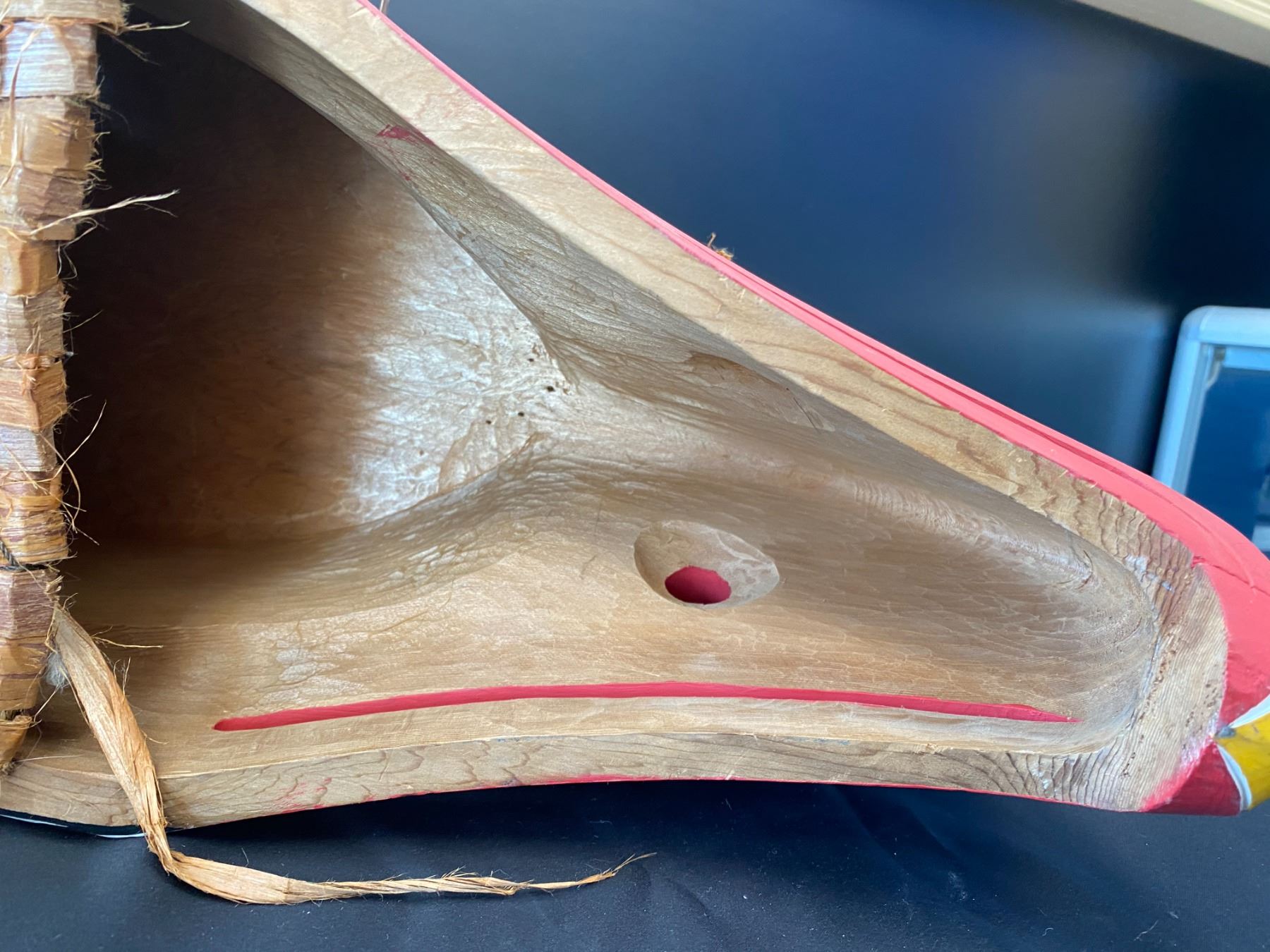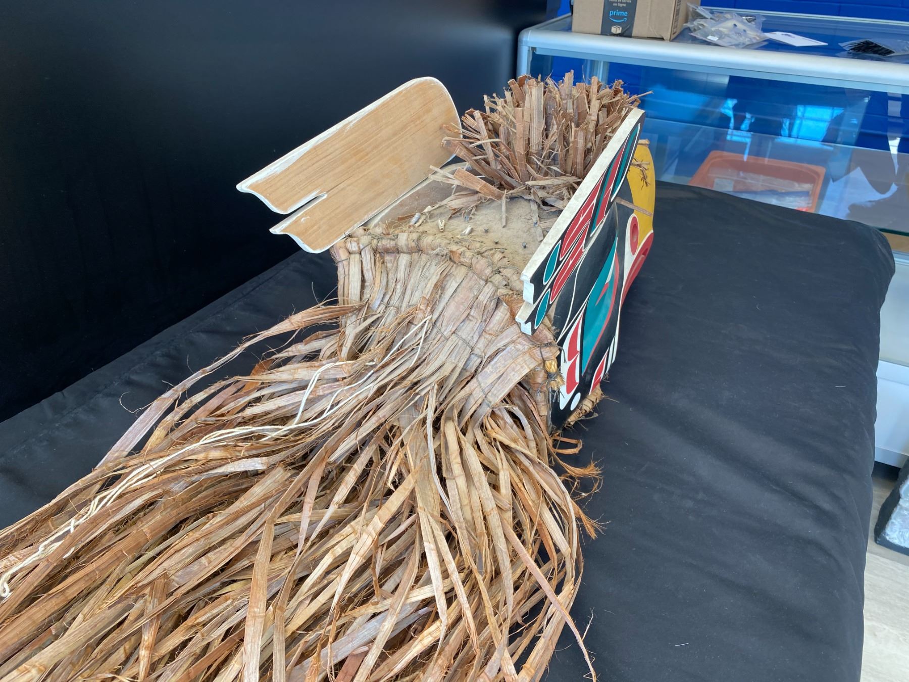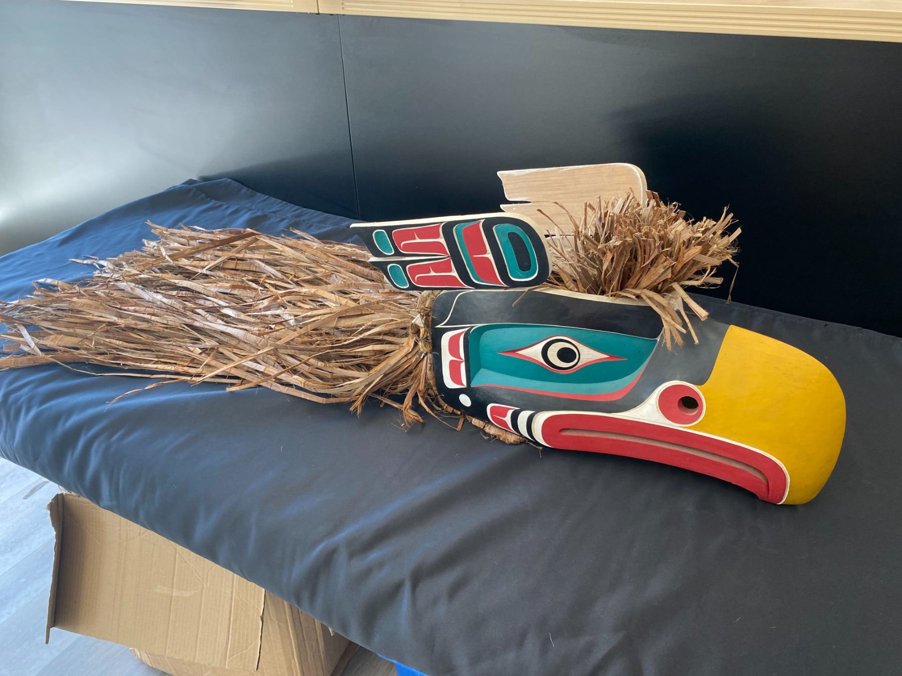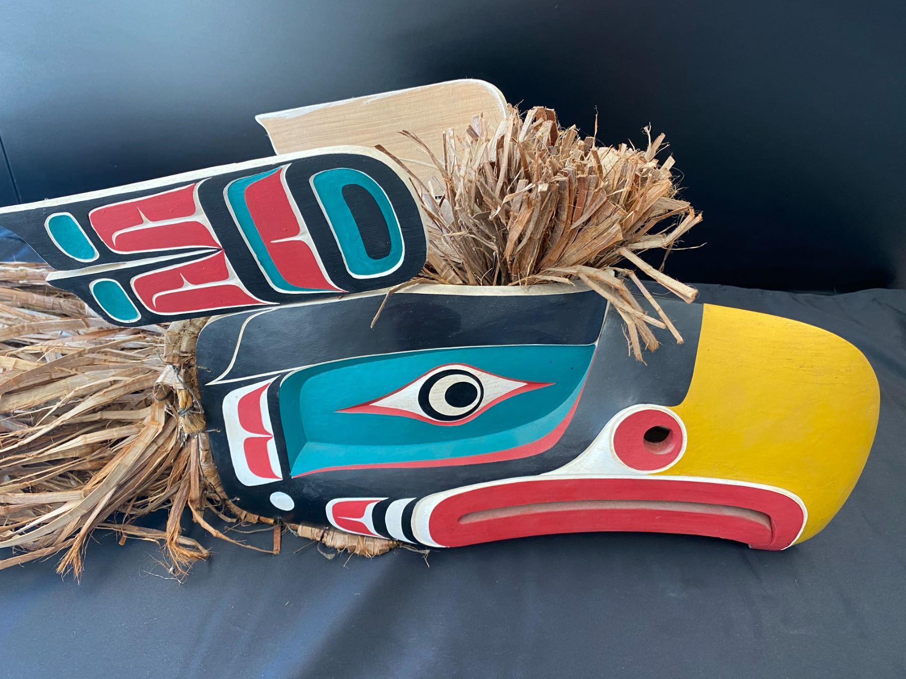 WEST COAST FIRST NATIONS CARVED AND PAINTED EAGLE MASK WITH CEDAR BARK HAIR APPROX 23" X 12"