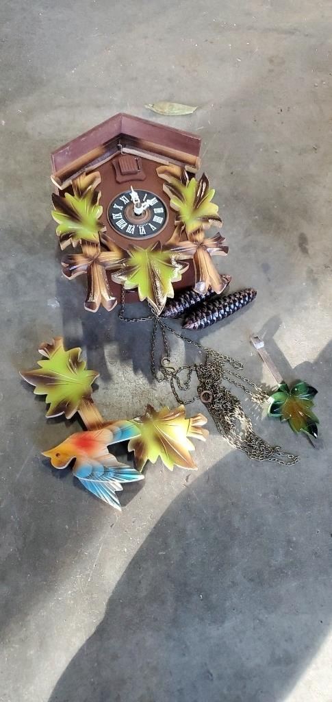 WEST GERMAN CUCKOO CLOCK , WORKING, WITH CHAINS, WEIGHTS ETC