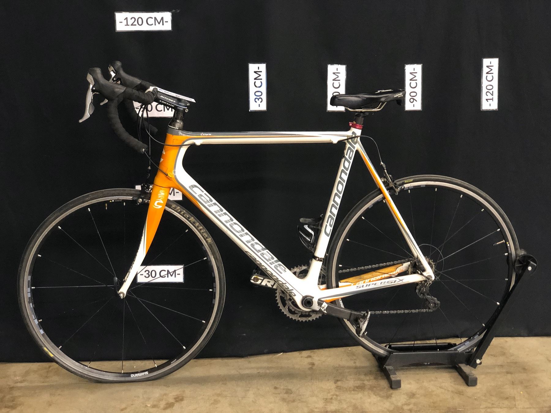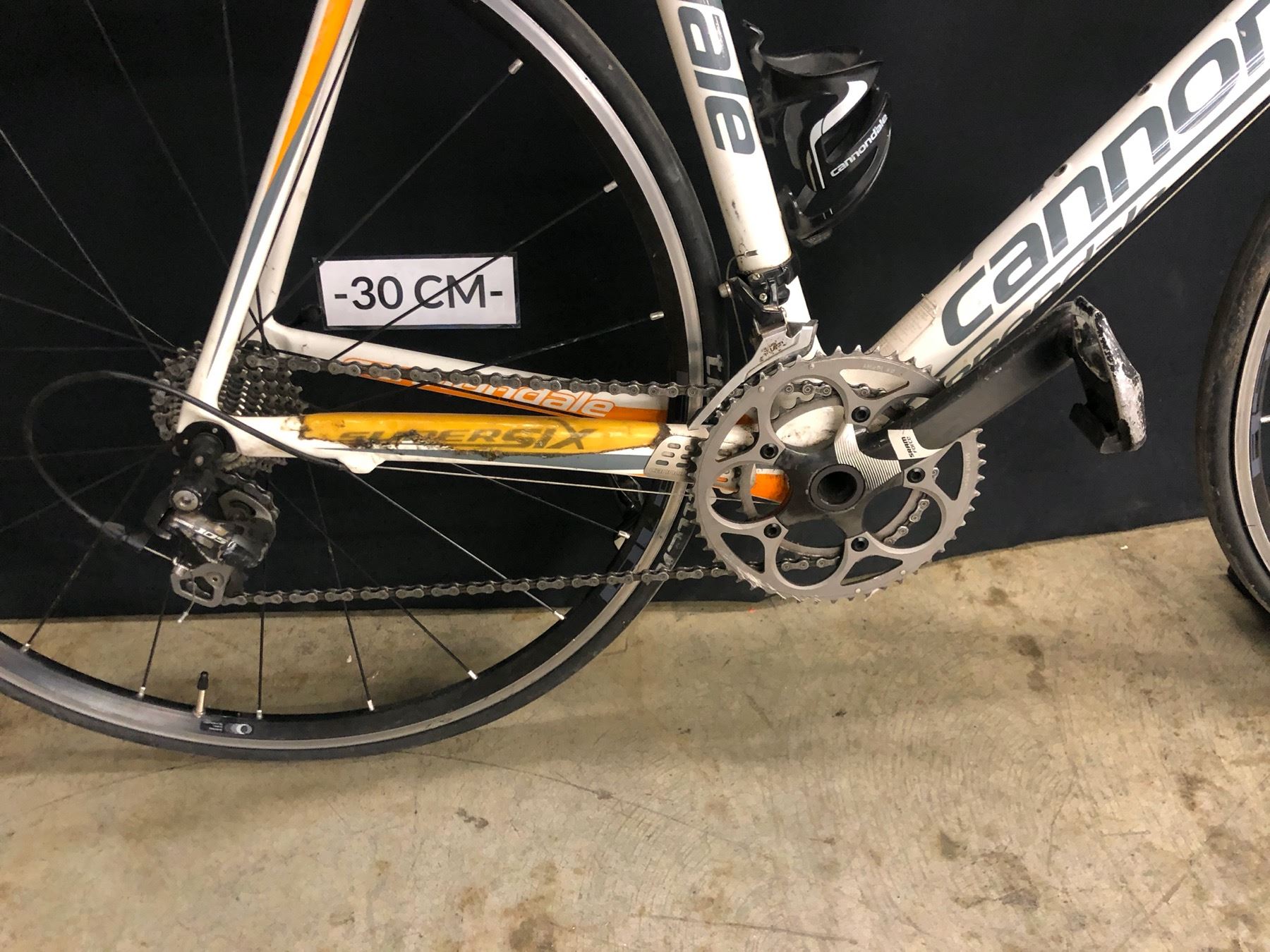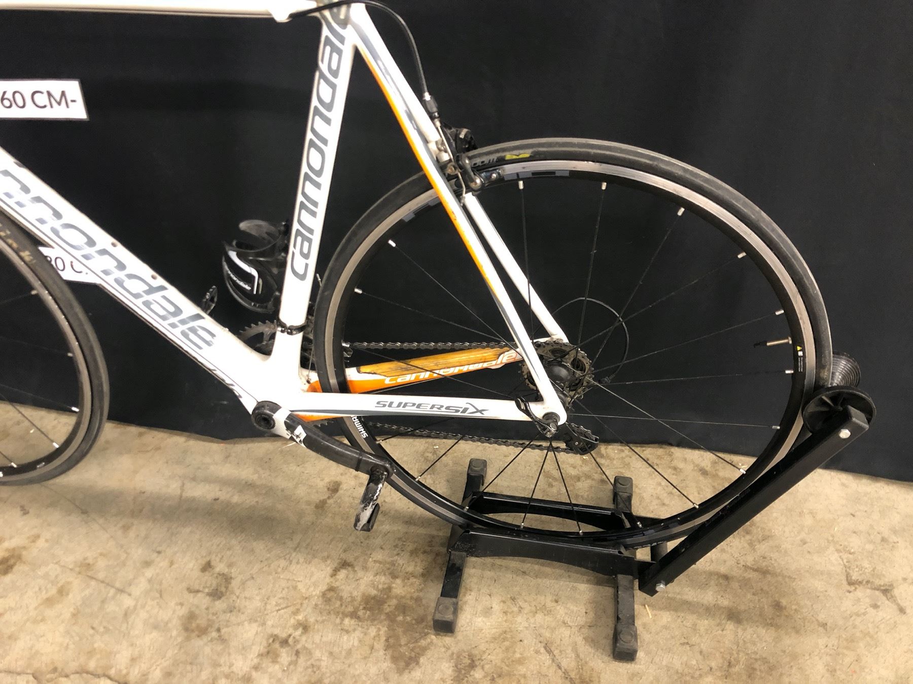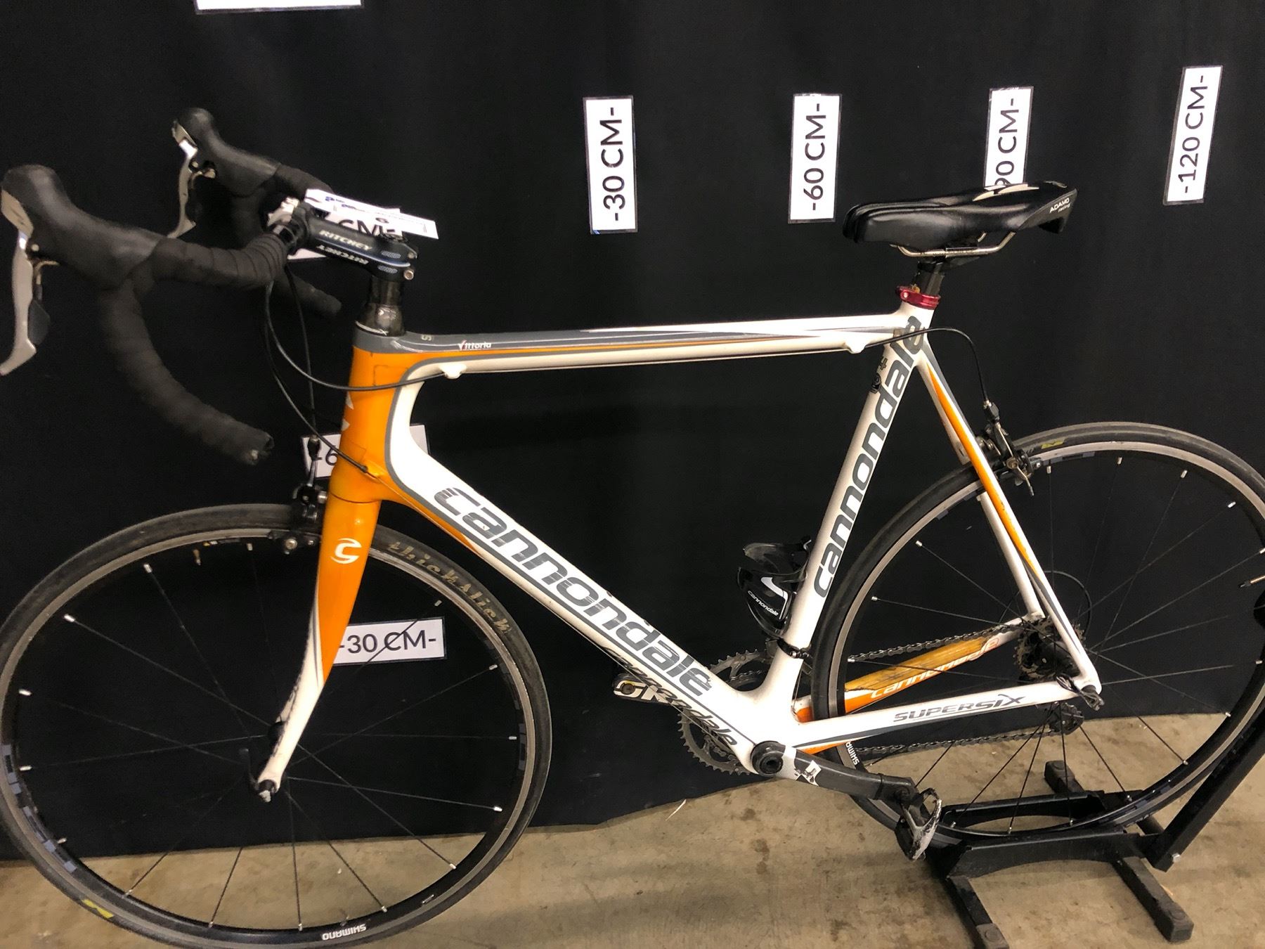 WHITE AND ORANGE CANNONDALE VITTORIA 20 SPEED ROAD BIKE WITH CLIP PEDALS, 60 CM FRAME SIZE, STANDOVER HEIGHT: 84 CM