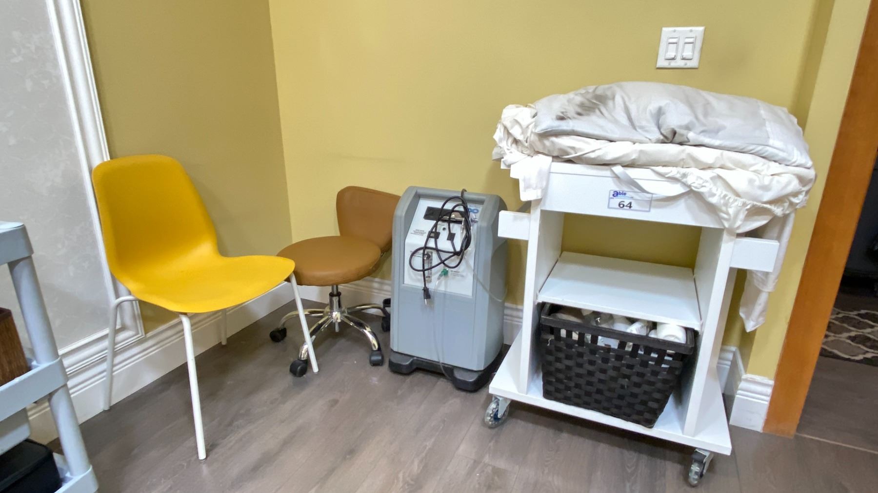 WHITE COMMERCIAL MOBILE SPA CART WITH MASSAGE BED HEATING PAD, SPA ITEMS, CHAIRS, & NATURE TECH