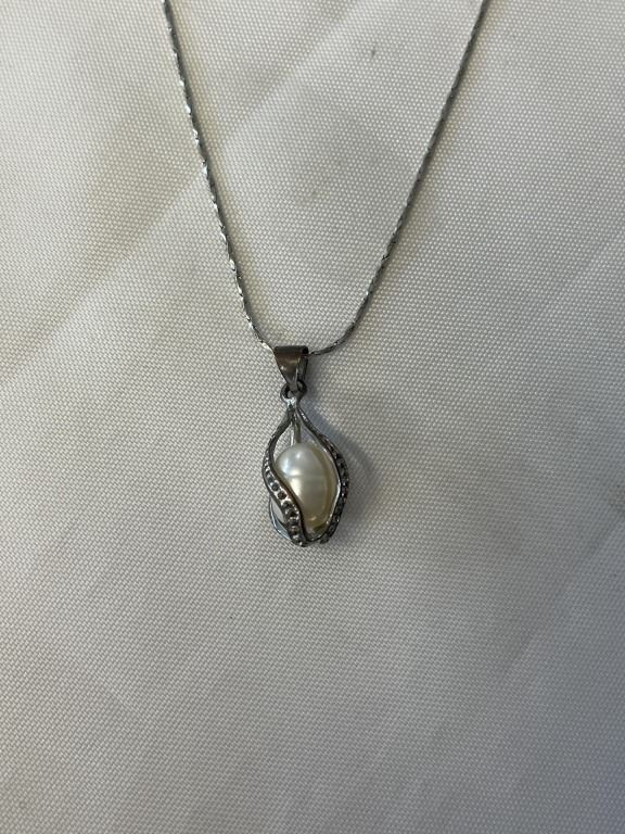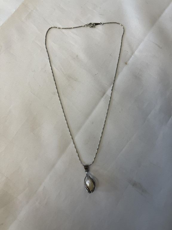 WHITE GOLD PLATED W/ GENUINE PEARL PENDANT AND CHAIN NECKLACE MARKED EA 18K GF