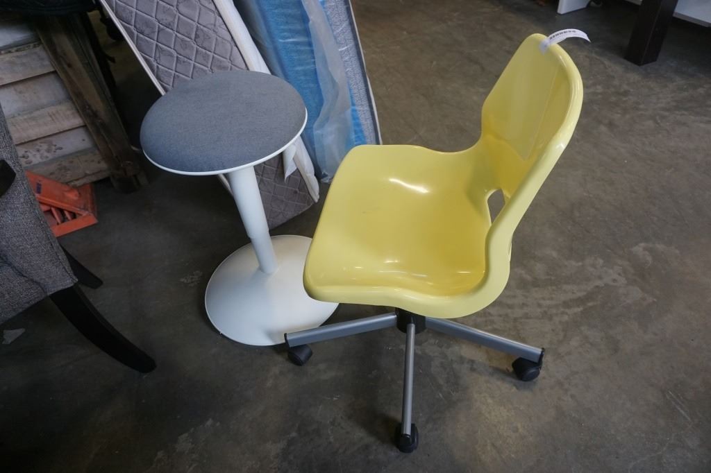 WHITE GREY GAS LIFT STOOL AND YELLOW ROLLING CHAIR