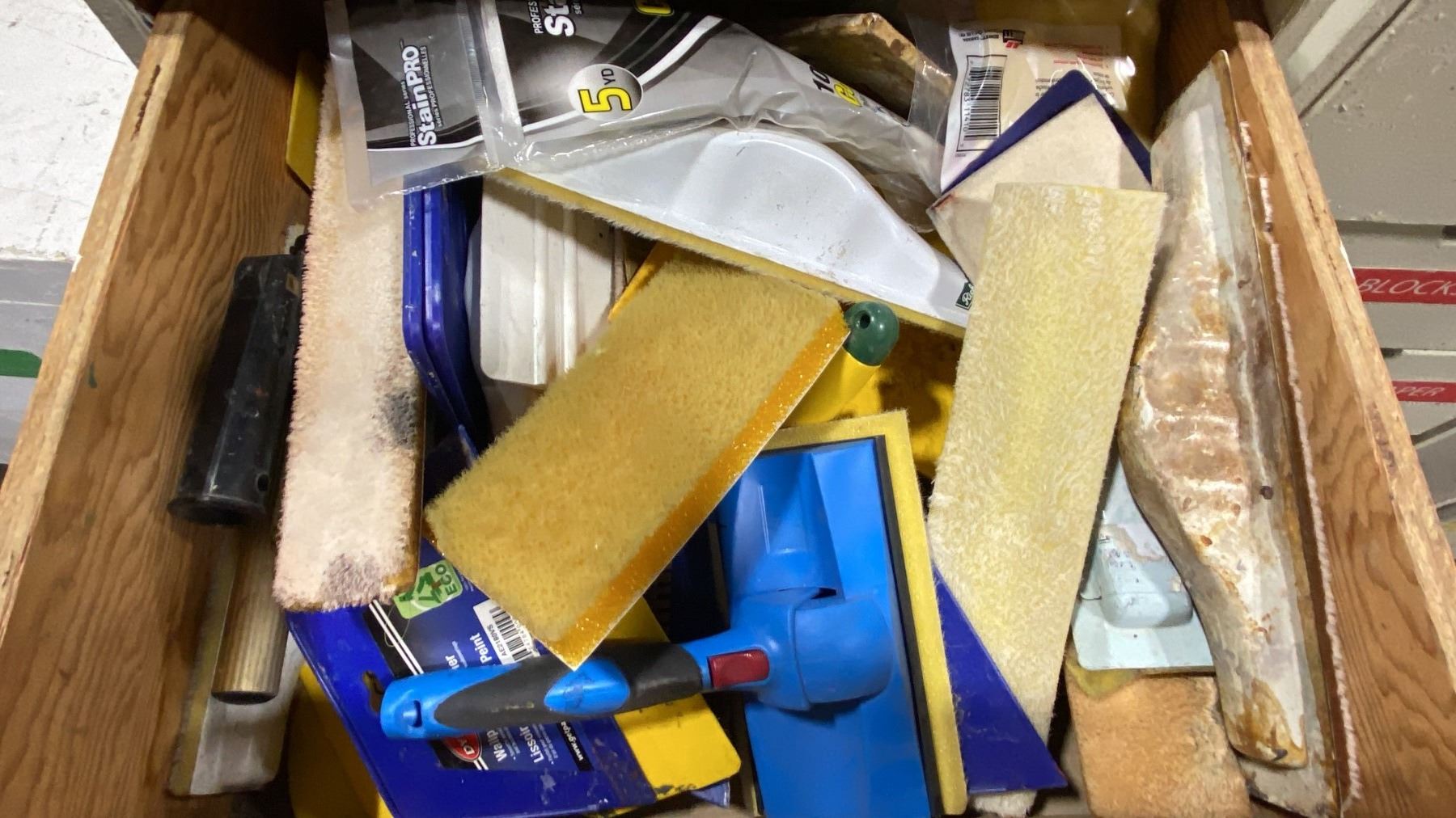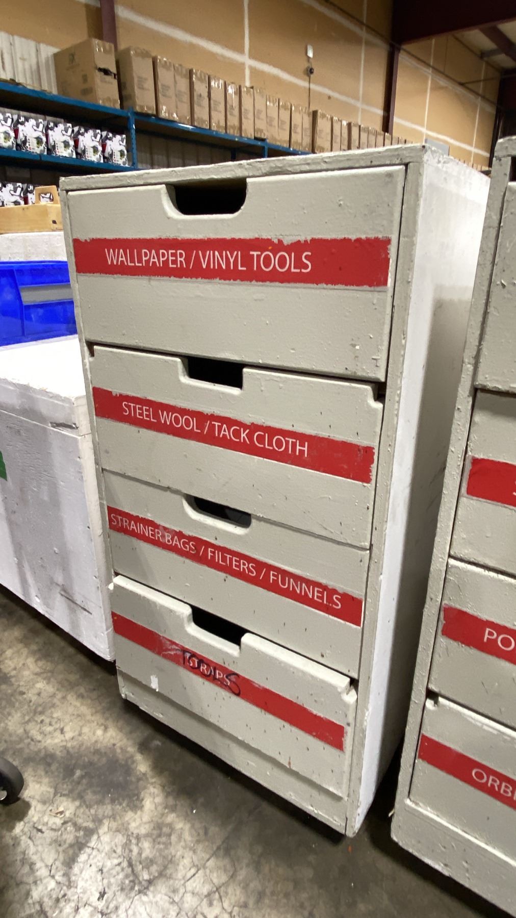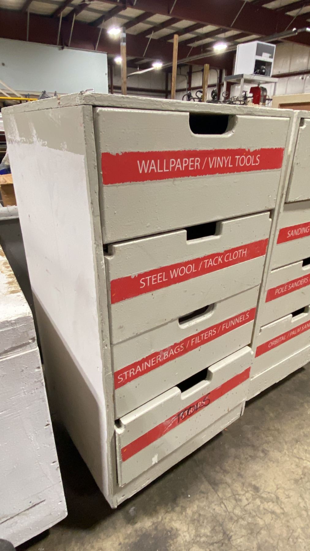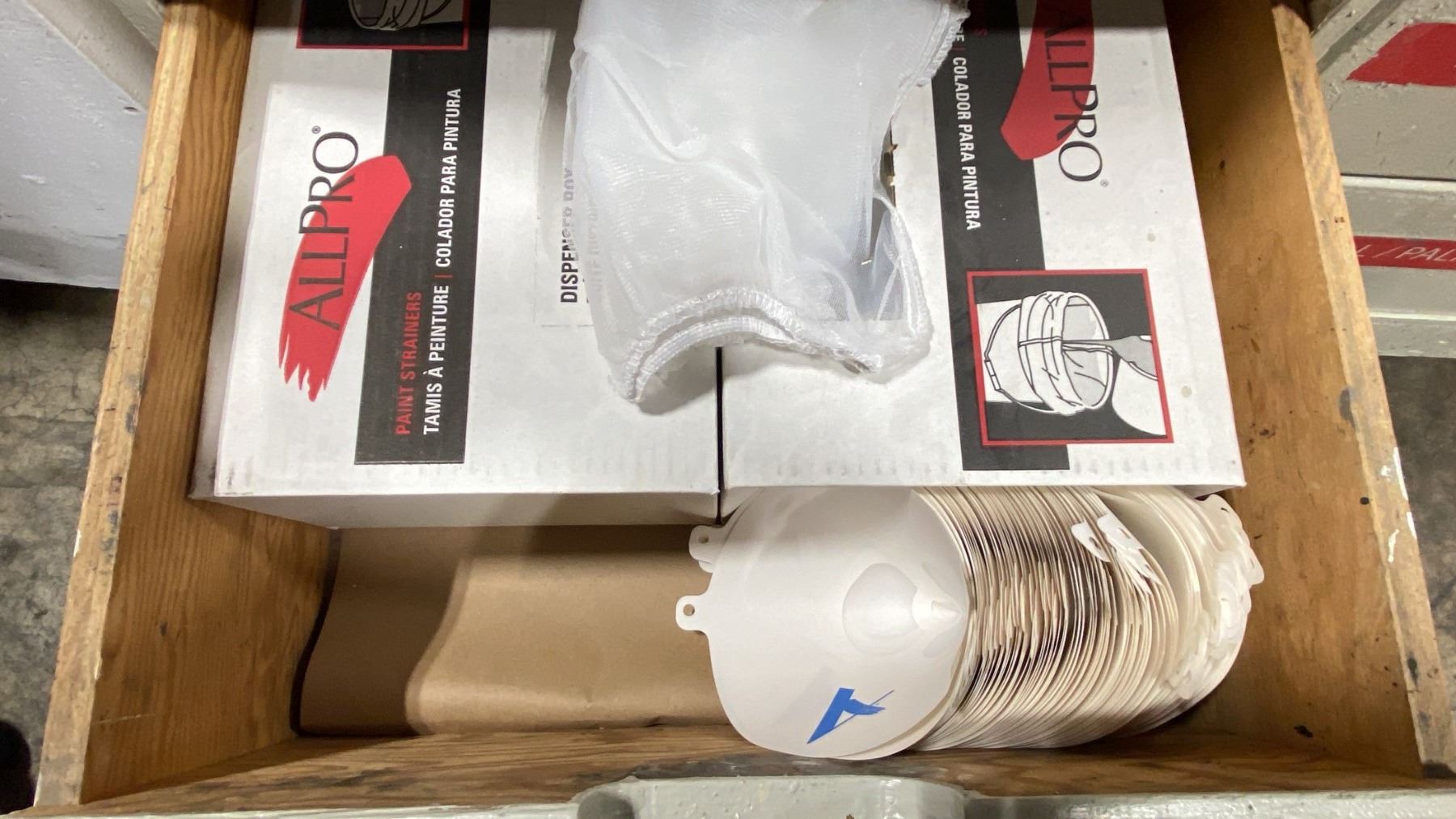WHITE MOBILE STORAGE CABINET WITH ASSORTED CONTENTS INCLUDING CHEESE CLOTH, STEEL WOOL, FILTER FUNNELS, PAINT STRAINERS & PAINTING ACCESSORIES