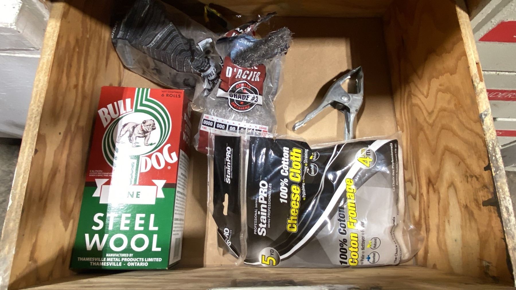 WHITE MOBILE STORAGE CABINET WITH ASSORTED CONTENTS INCLUDING CHEESE CLOTH, STEEL WOOL, FILTER