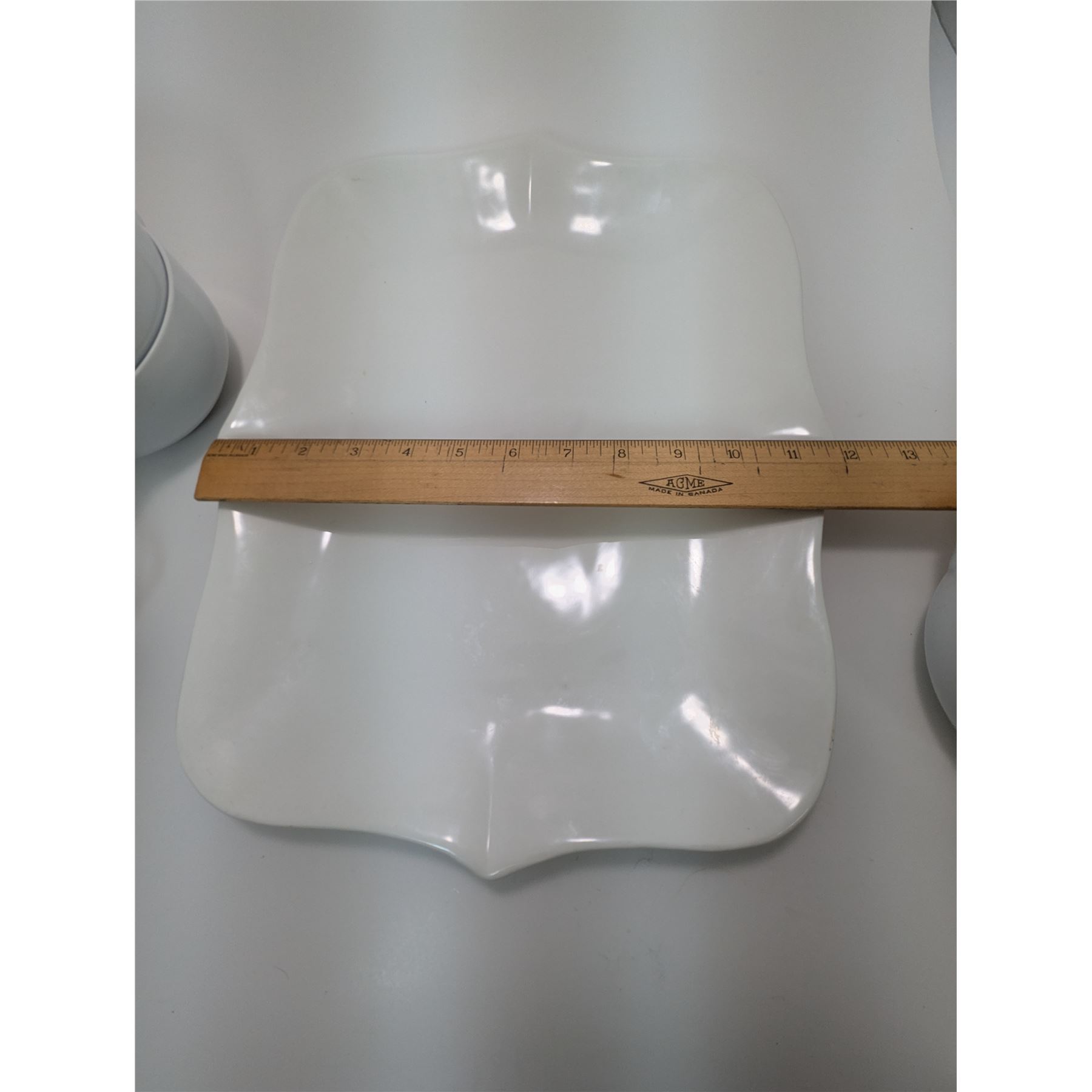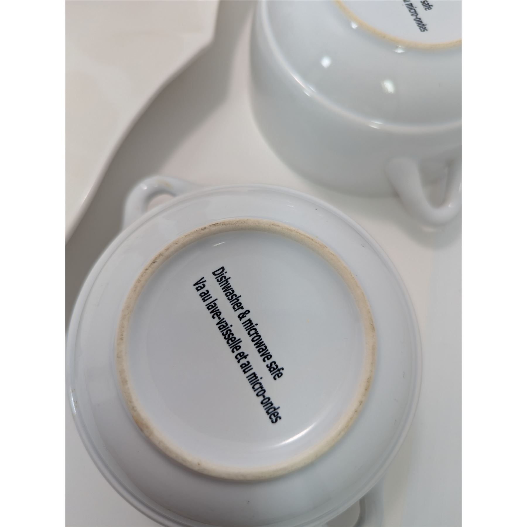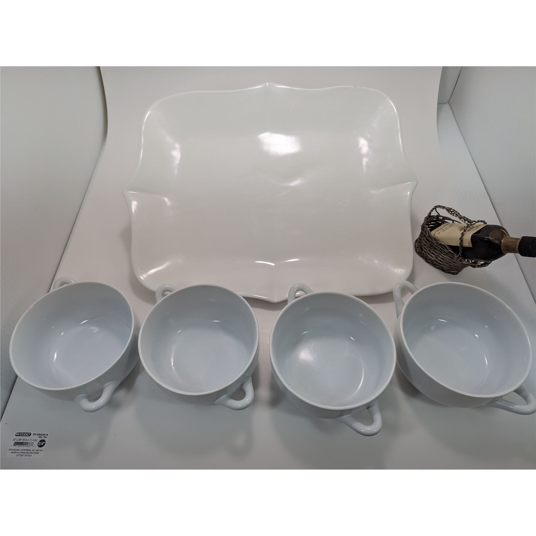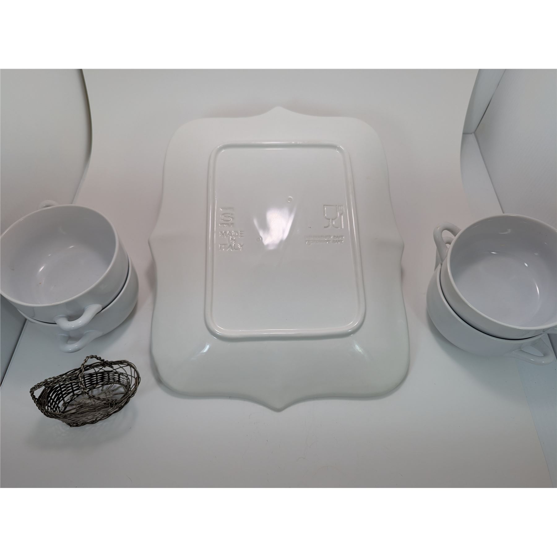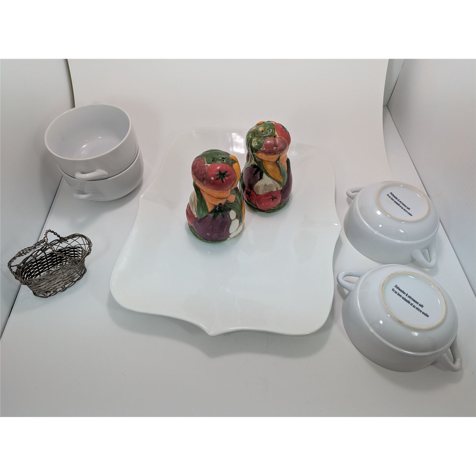 WHITE PLATTER 12"X15", SOUP BOWLS, WIRE BOTTLE CRADLE, SALT & PEPPER SHAKERS