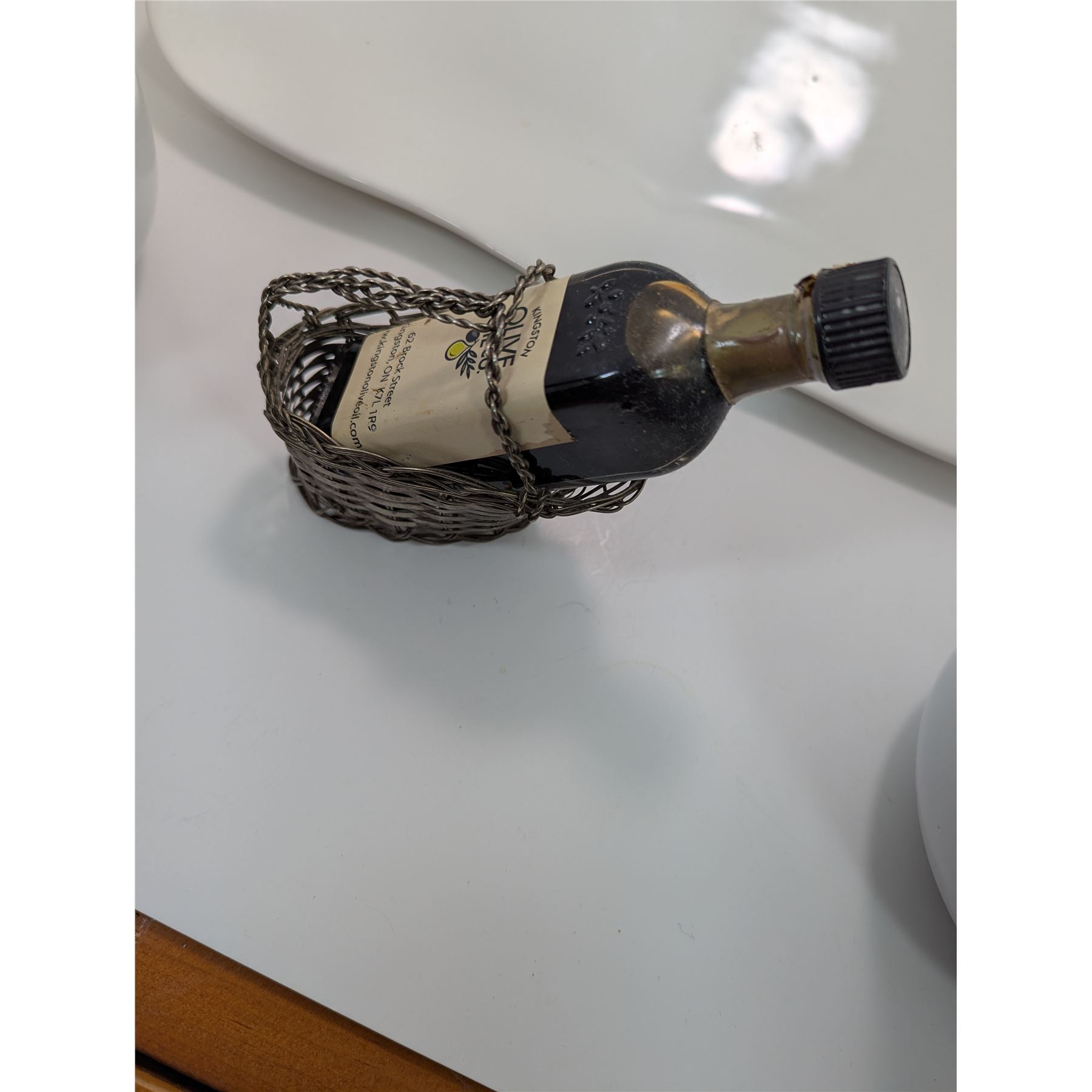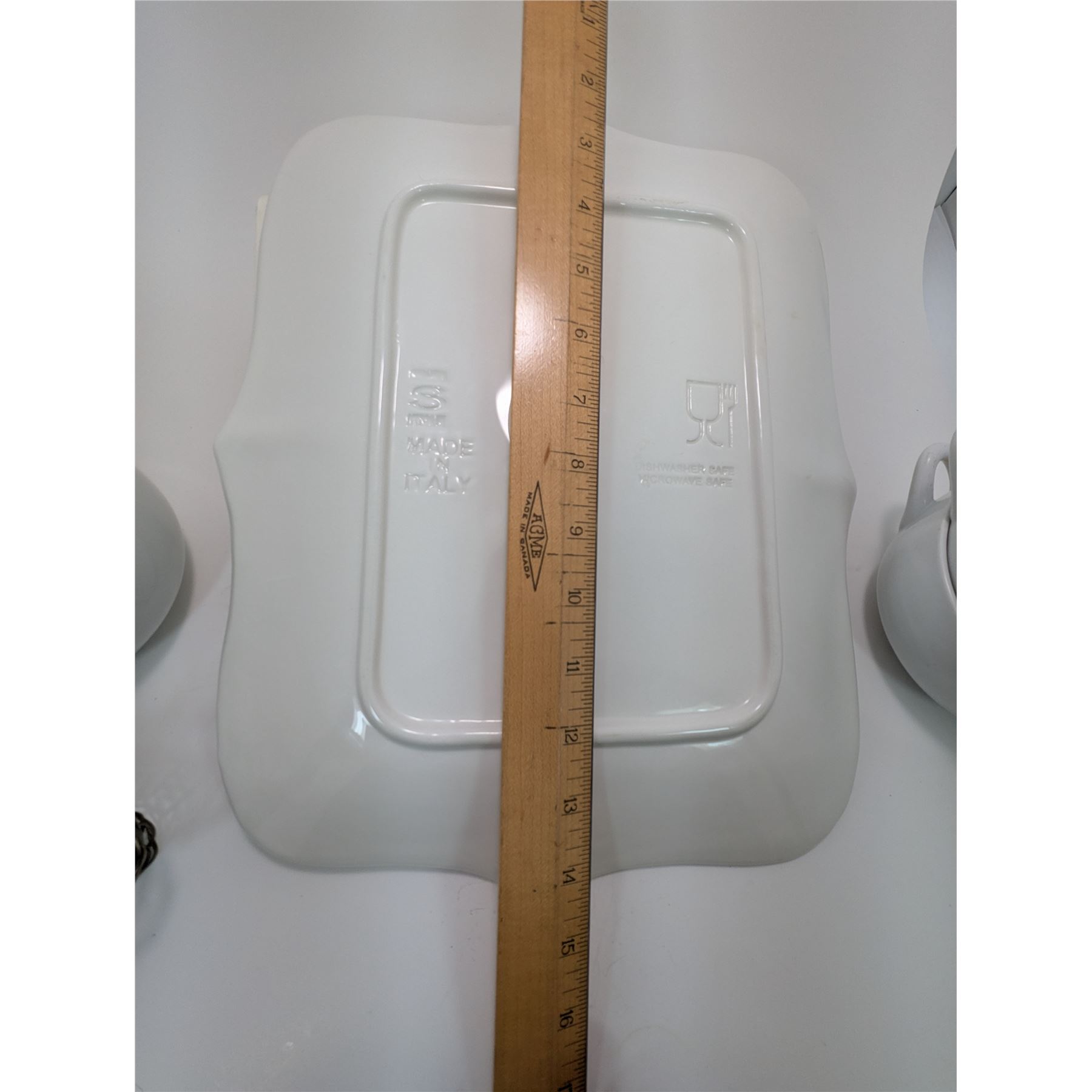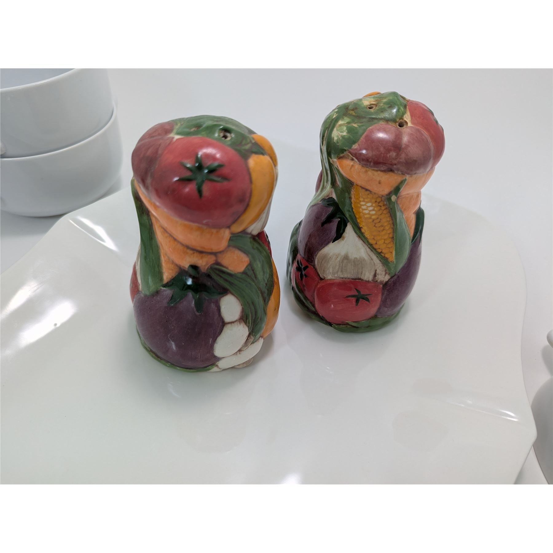 WHITE PLATTER 12"X15" Made in Italy, microwave & dish washer safe, SOUP BOWLS microwave & dish washer safe, WIRE BOTTLE CRADLE(Small bottle NOT INCLUDED), SALT & PEPPER SHAKERS WITH VEGETABLE MOTIF