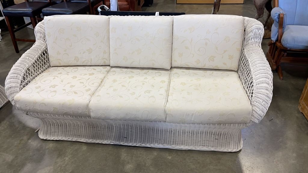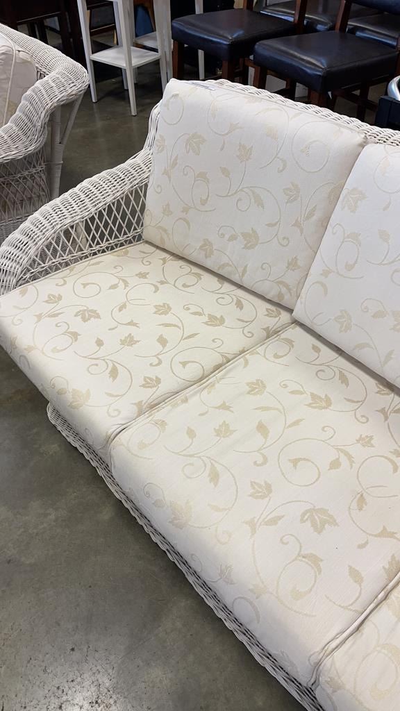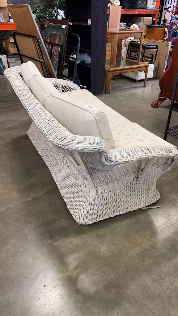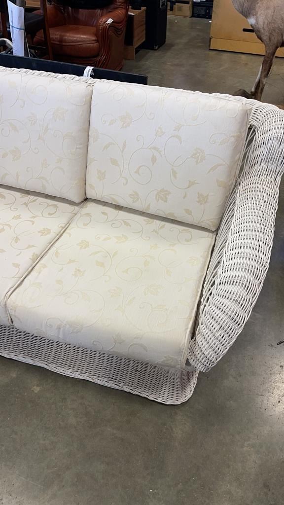 WHITE WICKER 6FT SOFA, WITH CUSHIONS