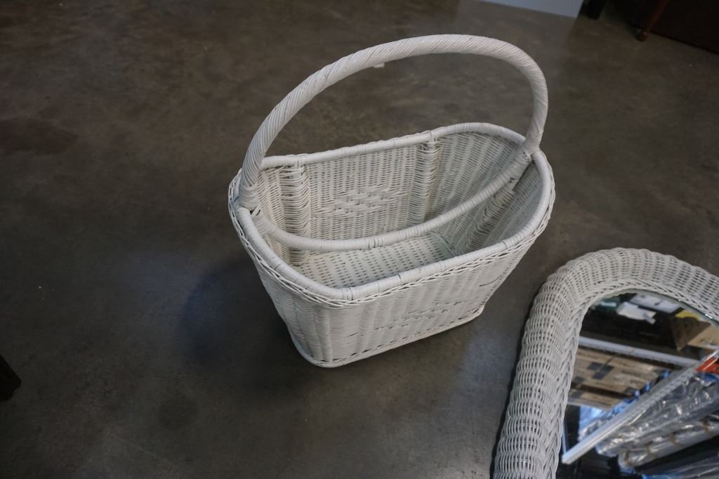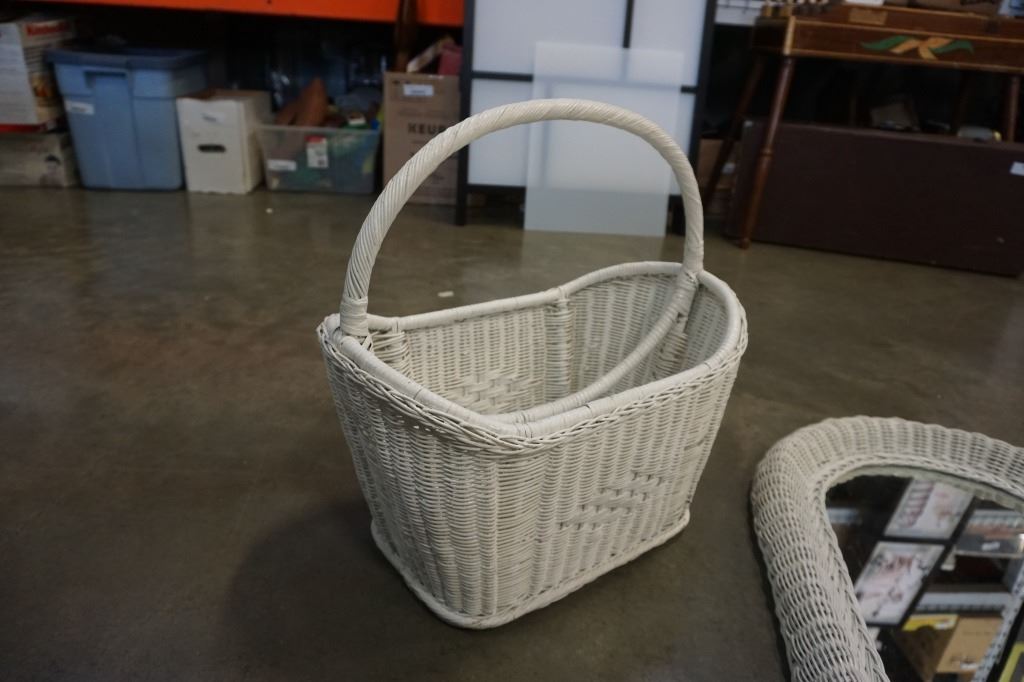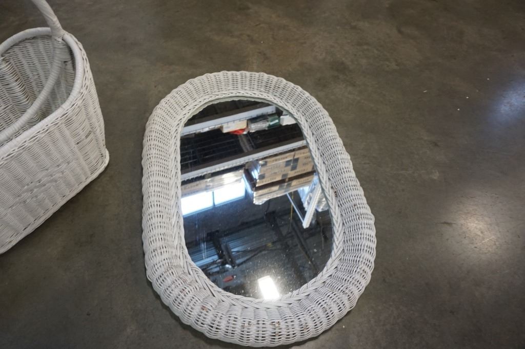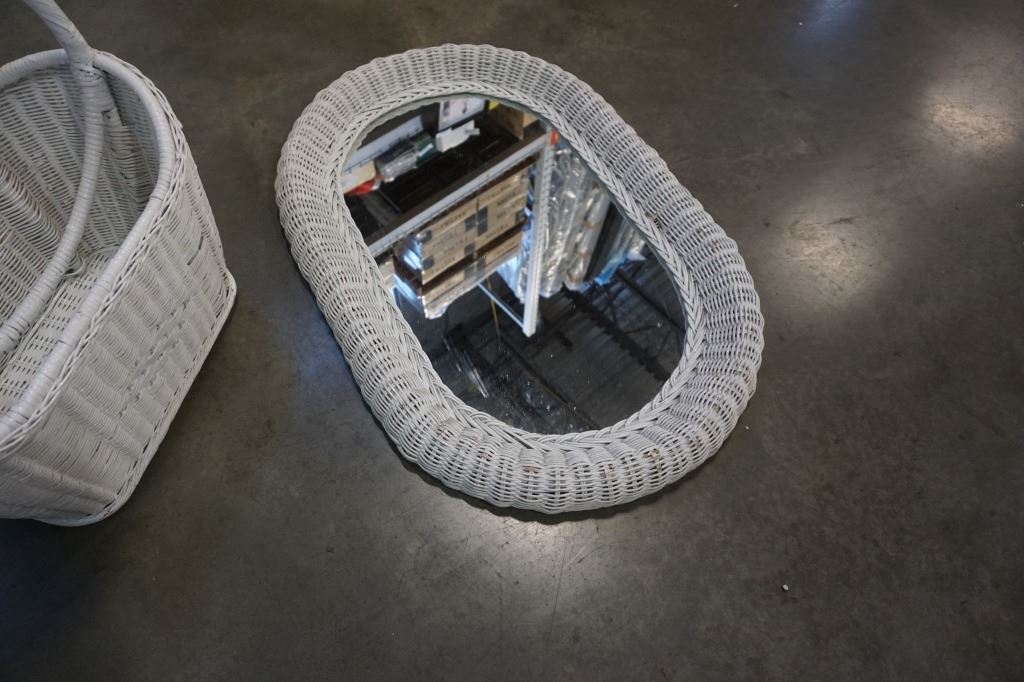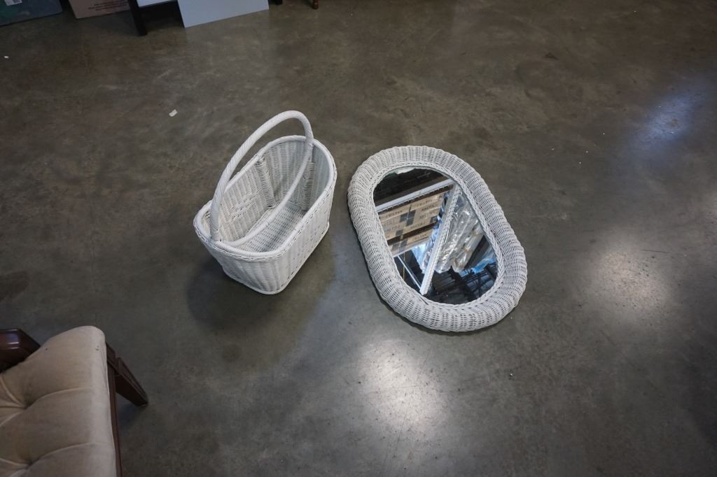 WHITE WICKER MIRROR AND WHITE WICKER BASKET