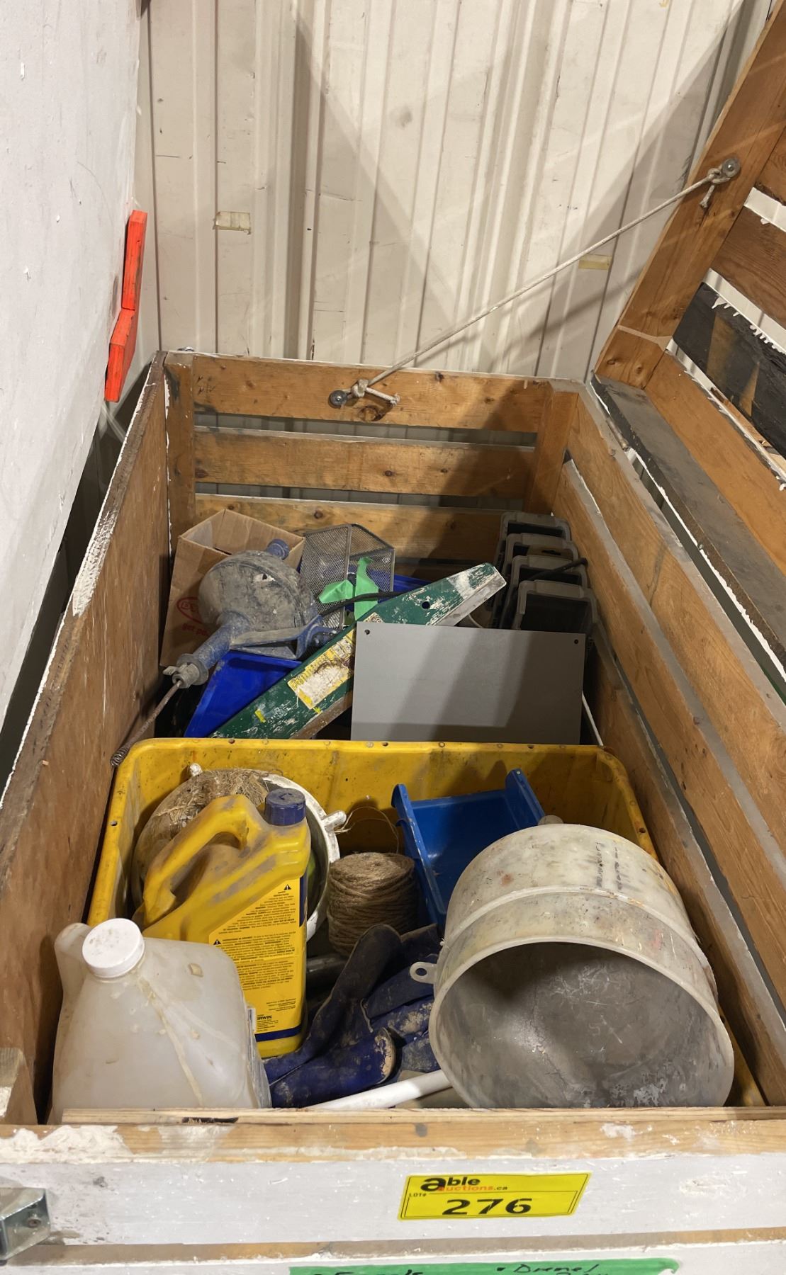 WHITE WOODEN MOBILE 47"W X 26"W X 45"H INDUSTRIAL STORAGE CRATE WITH ASSORTED HAND TOOLS, CHALK LINE & SHOP CONTENTS