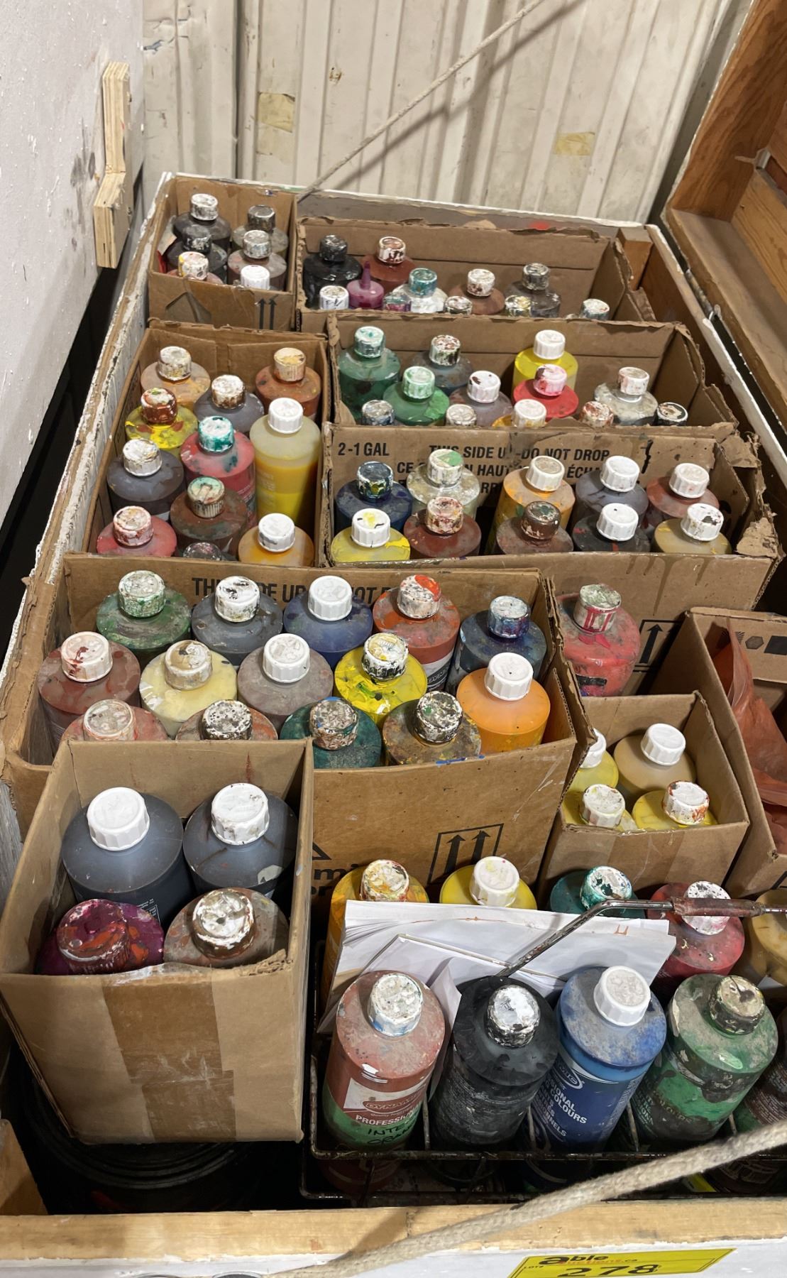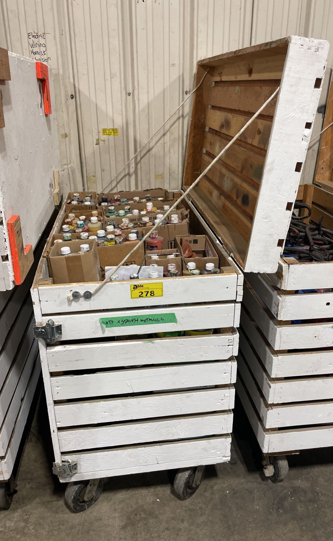 WHITE WOODEN MOBILE 47"W X 26"W X 45"H INDUSTRIAL STORAGE CRATE WITH ASSORTED PRINT SHOP DYES / CHEMICALS