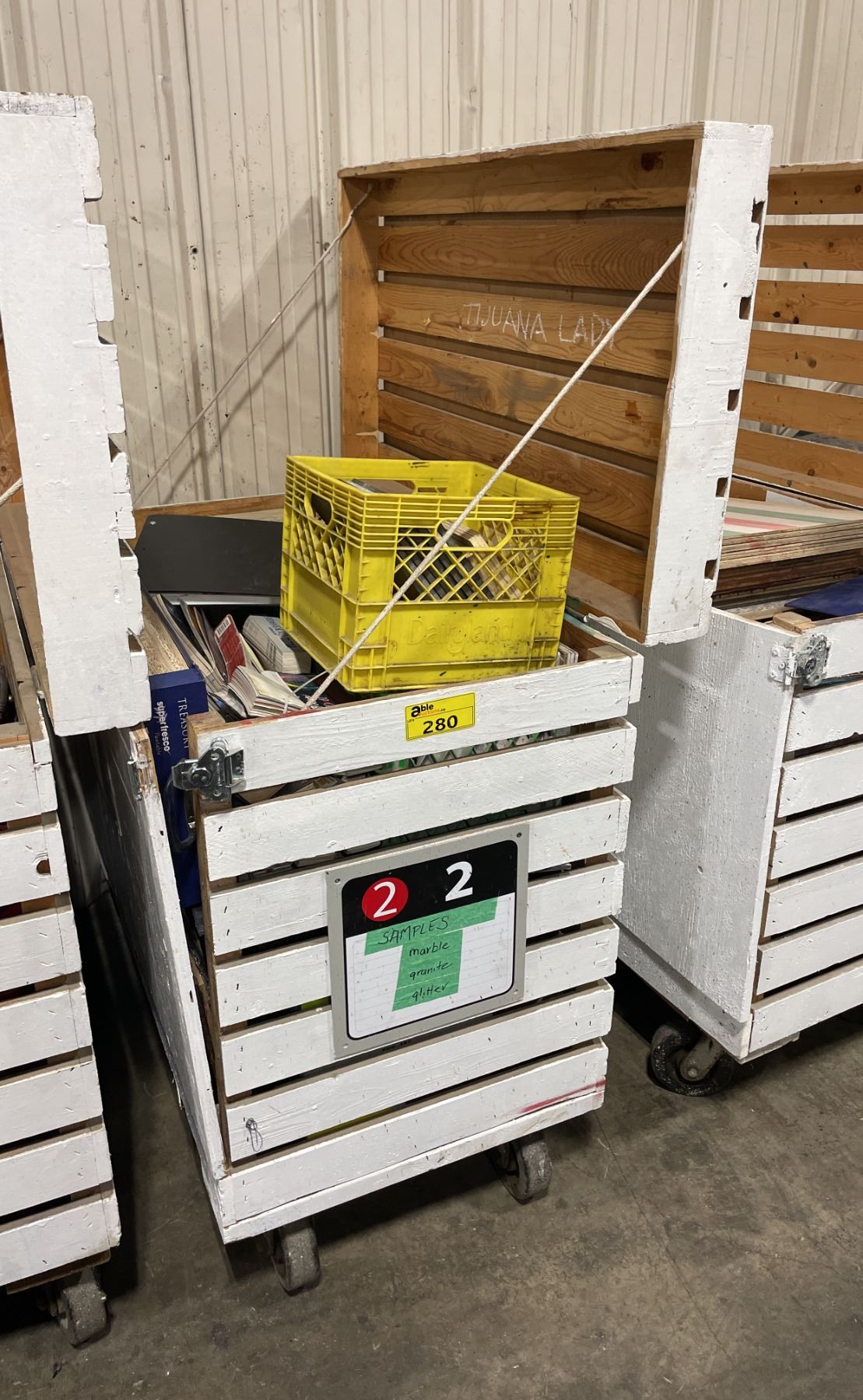 WHITE WOODEN MOBILE 47"W X 26"W X 45"H INDUSTRIAL STORAGE CRATE WITH ASSORTED SAMPLE PRODUCTS