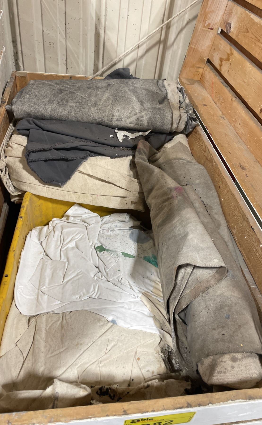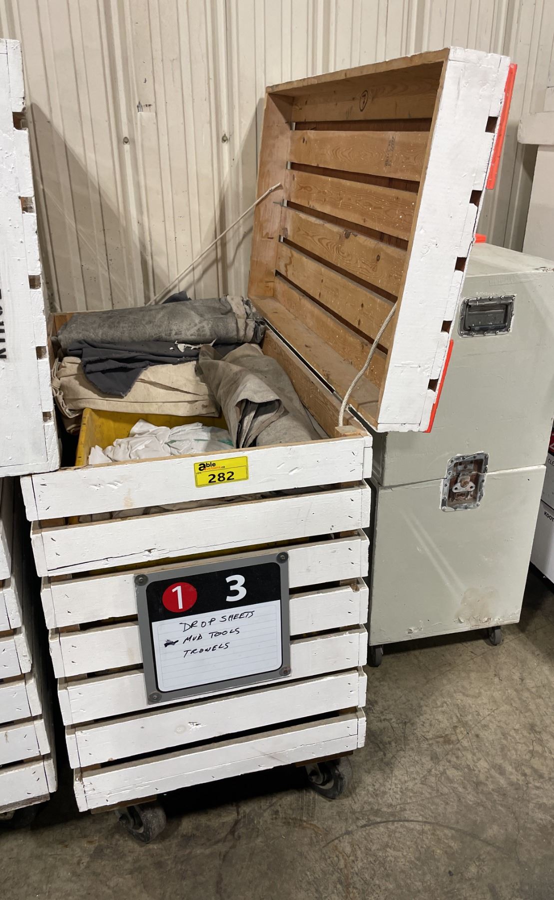 WHITE WOODEN MOBILE 47"W X 26"W X 45"H INDUSTRIAL STORAGE CRATE WITH PAINTERS DRAPERY & PAINT PRODUCTS