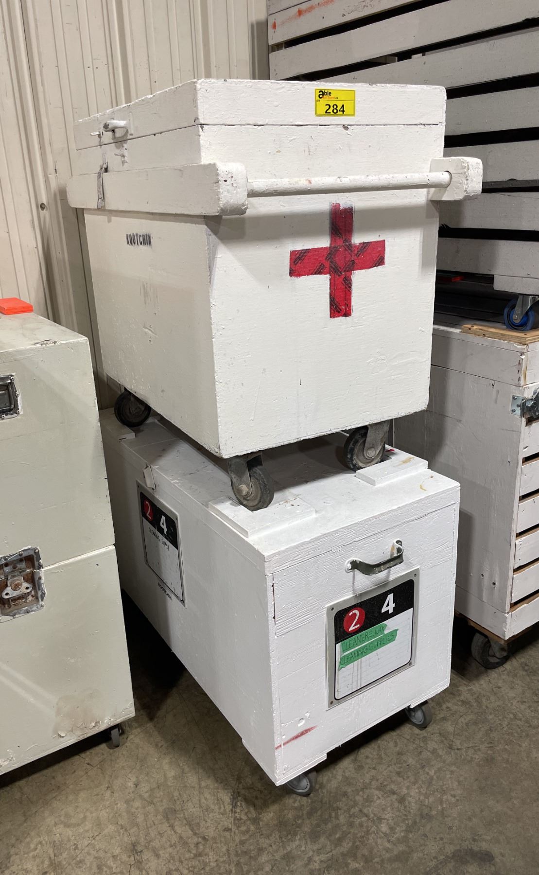 WHITE WOODEN MOBILE 48"W X 24"W X 31"H & 45"W X 24"D X 36"H INDUSTRIAL STORAGE CRATES *EMPTY*