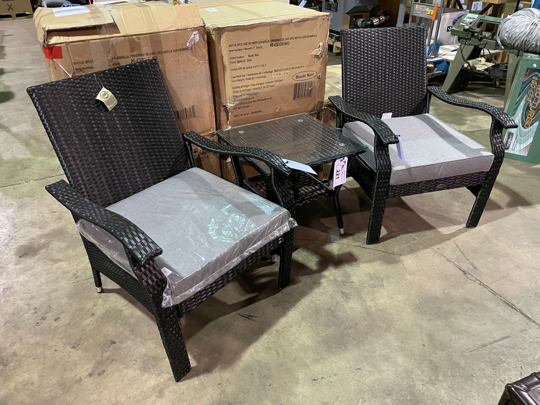 WHYLIE BLACK RATTAN 3 PIECE OUTDOOR PATIO CHAT SET WITH GREY SUNBRELLA CUSHIONS