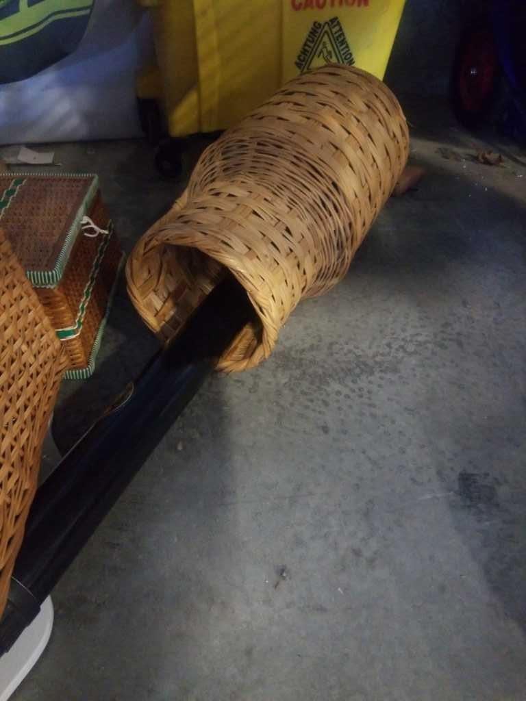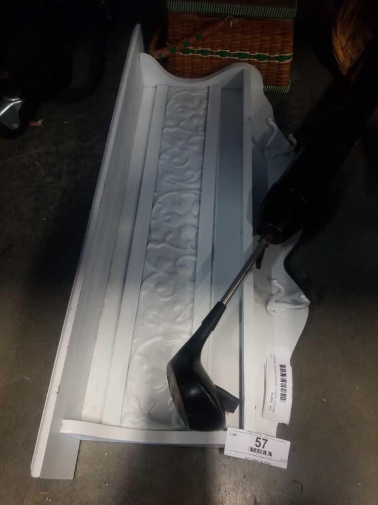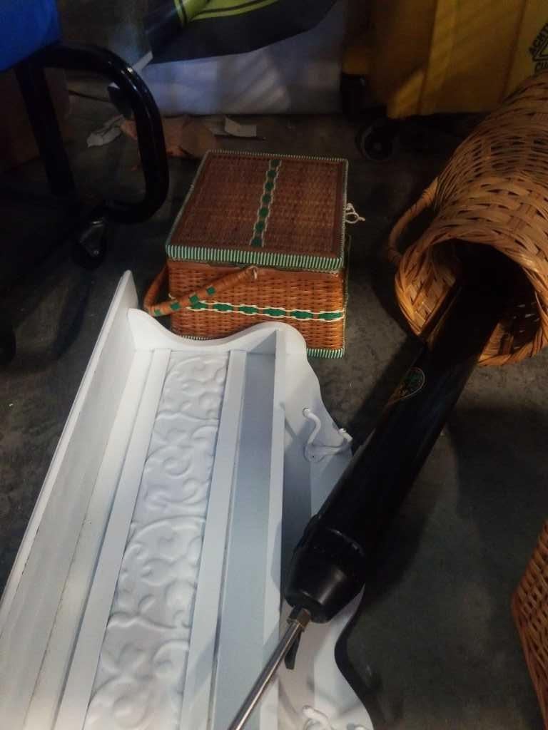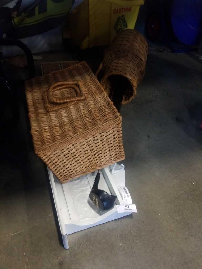 WICKER BASKET, WICKER SEWING BASKET, WICKER VASE, KOOLER KLUB DRINK DISPENSER AND SMALL WHITE SHELF