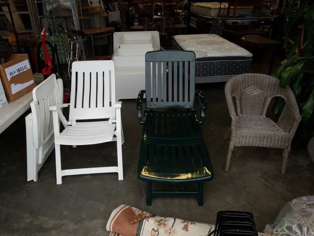 WICKER CHAIR, PATIO LOUNGE CHAIR AND 2 FOLDING PATIO CHAIRS
