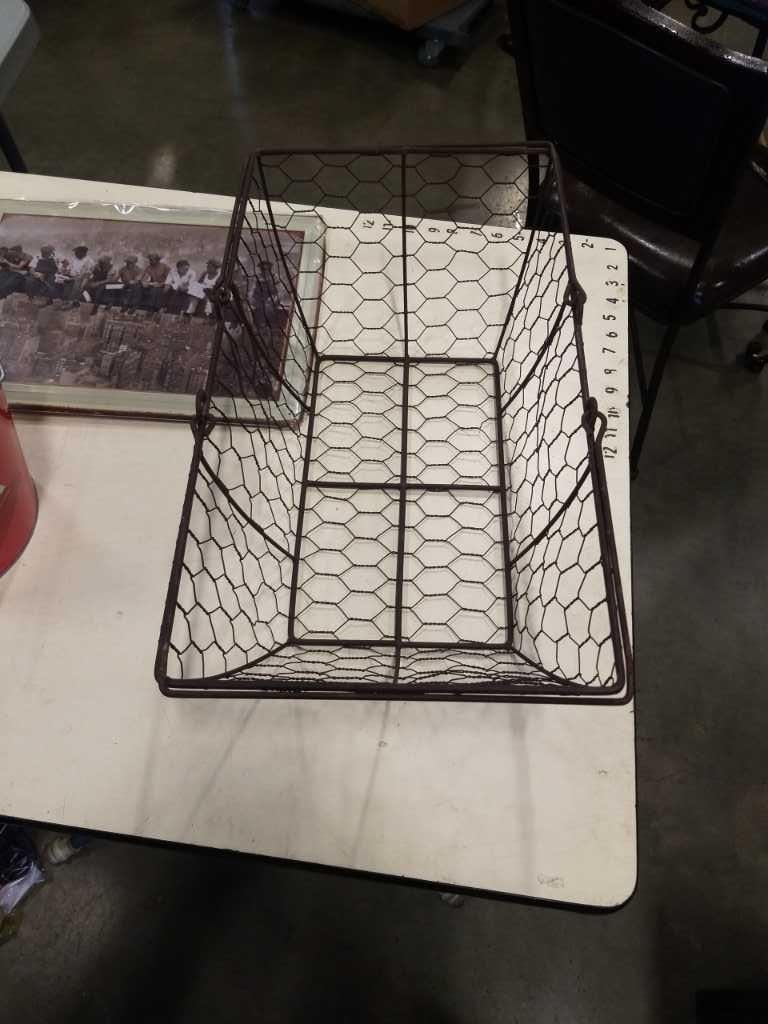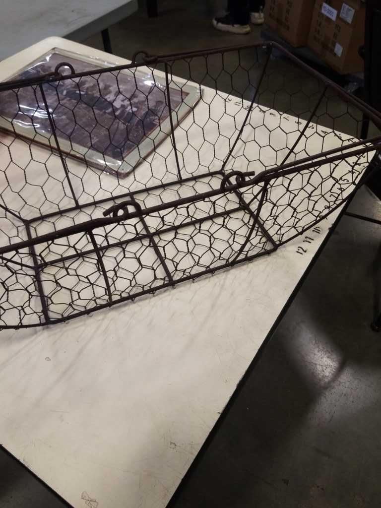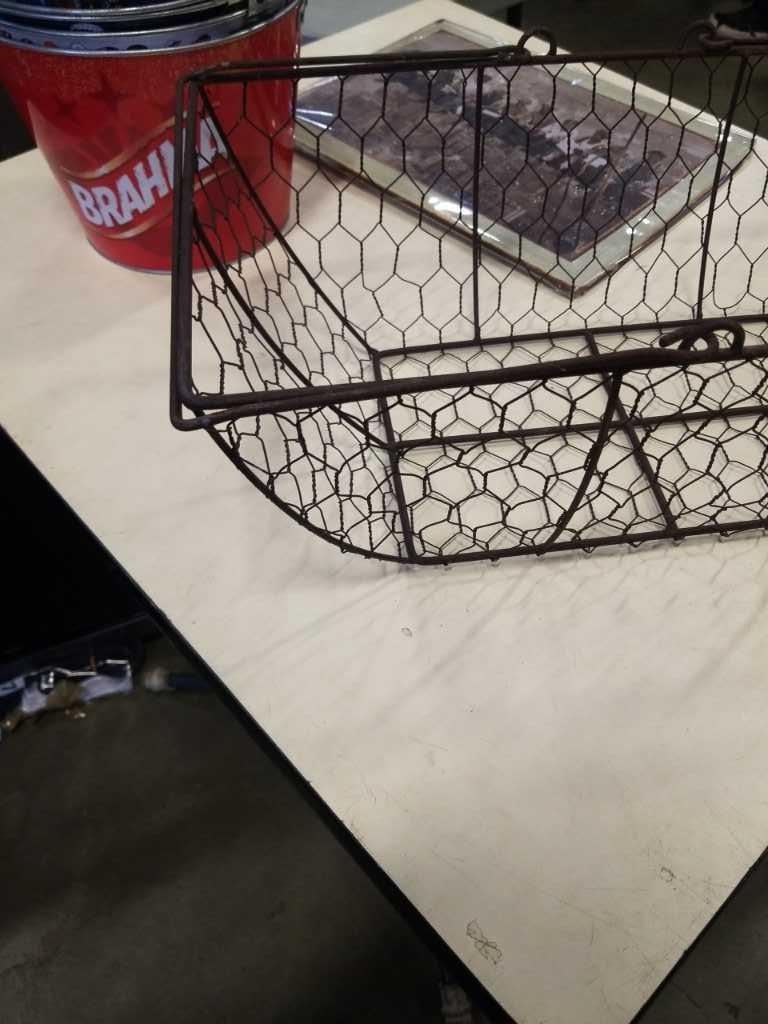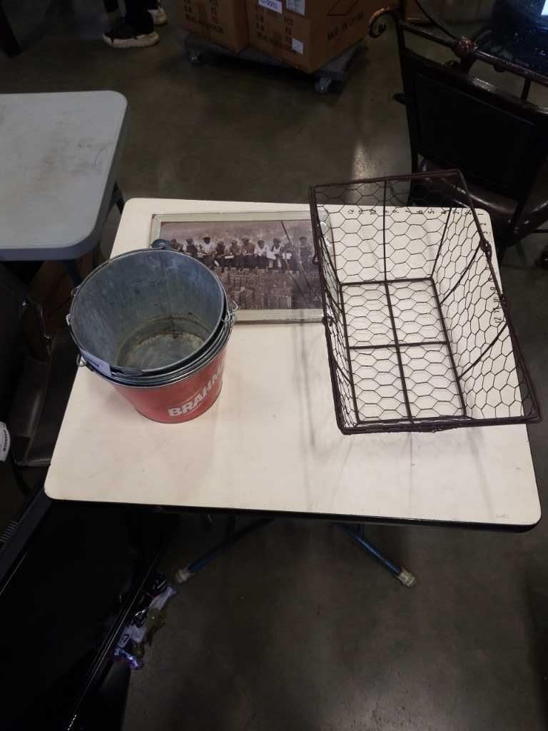 WIRE BASKET WITH ICE BUCKETS AND IRON WORKERS TIN SIGN