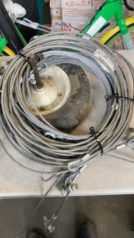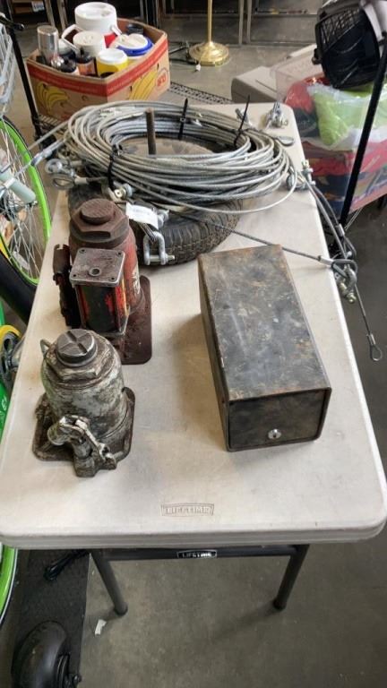 WIRE CABLE SLINGS, METAL BOX, WHEELBARROW WHEEL AND BOTTLE JACKS