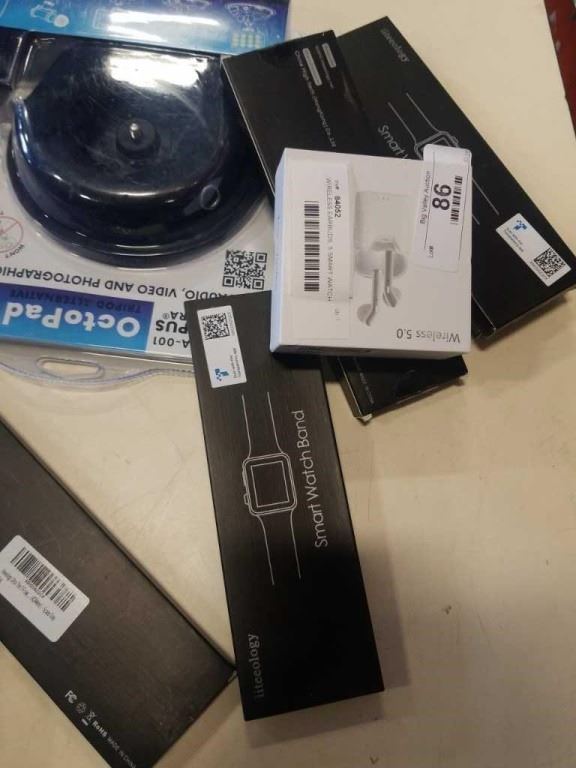 WIRELESS EARBUDS, 5 SMART WATCH BANDS AND 2 OCTOPAD CAMERA / MICROPHONE / LIGHT MOUNTS