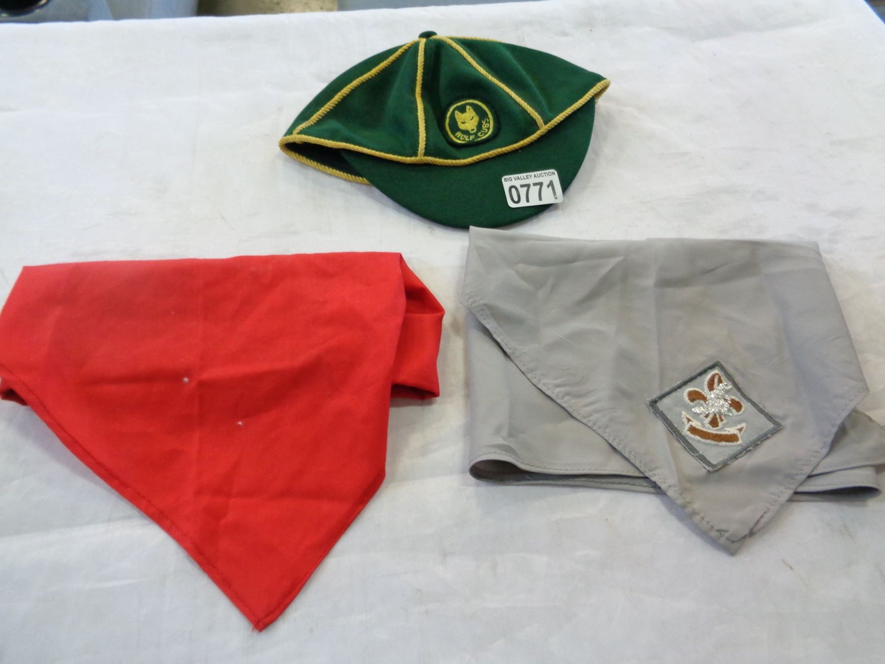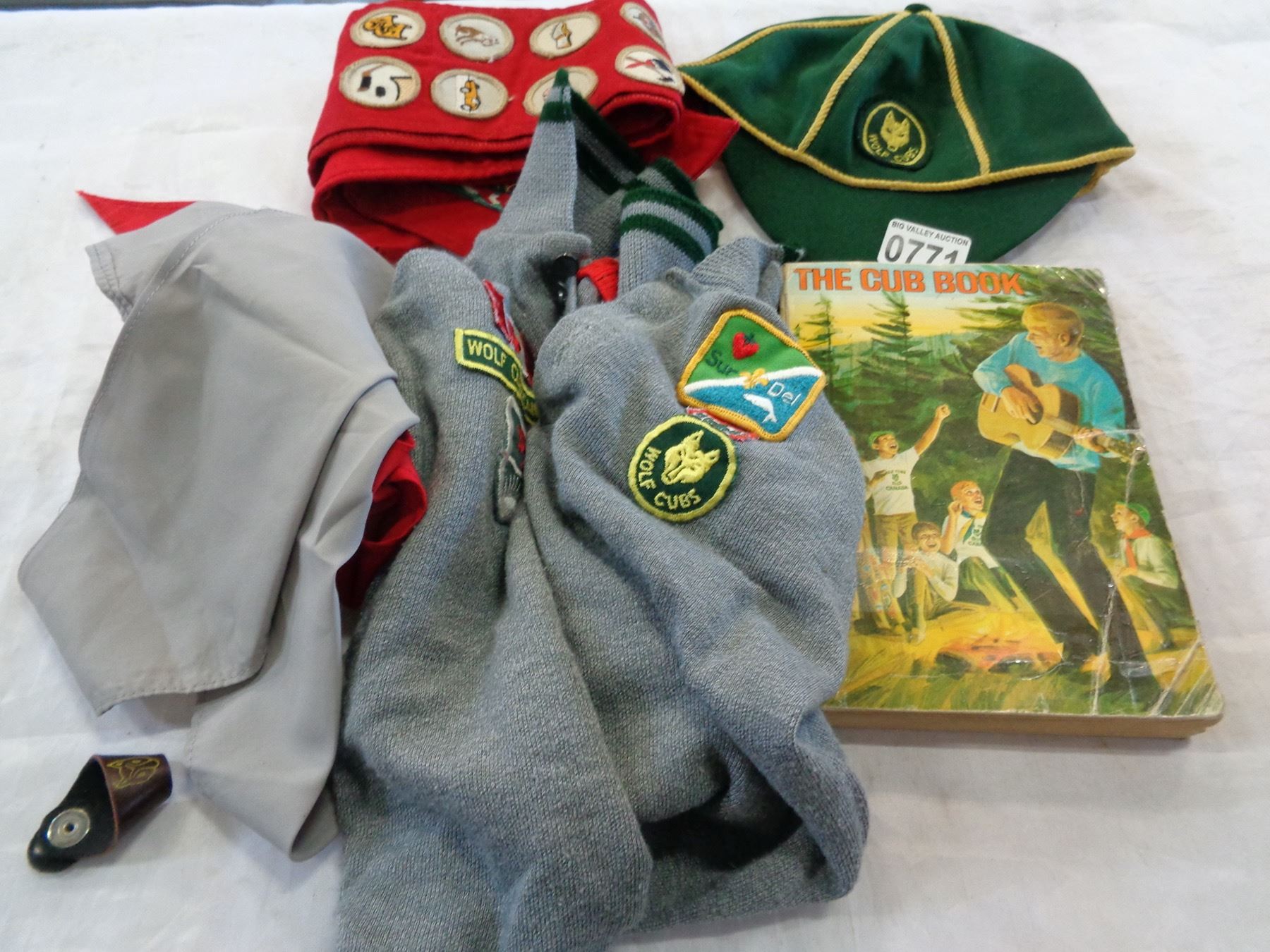 WOLF CUBS HAT, SASH WITH PATCHES, BOOK AND SHIRT