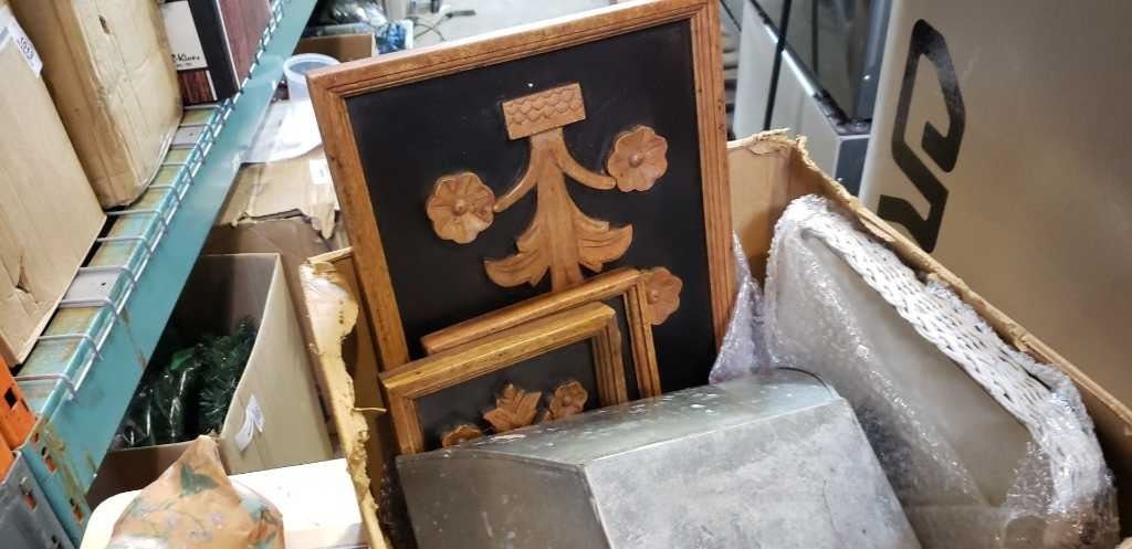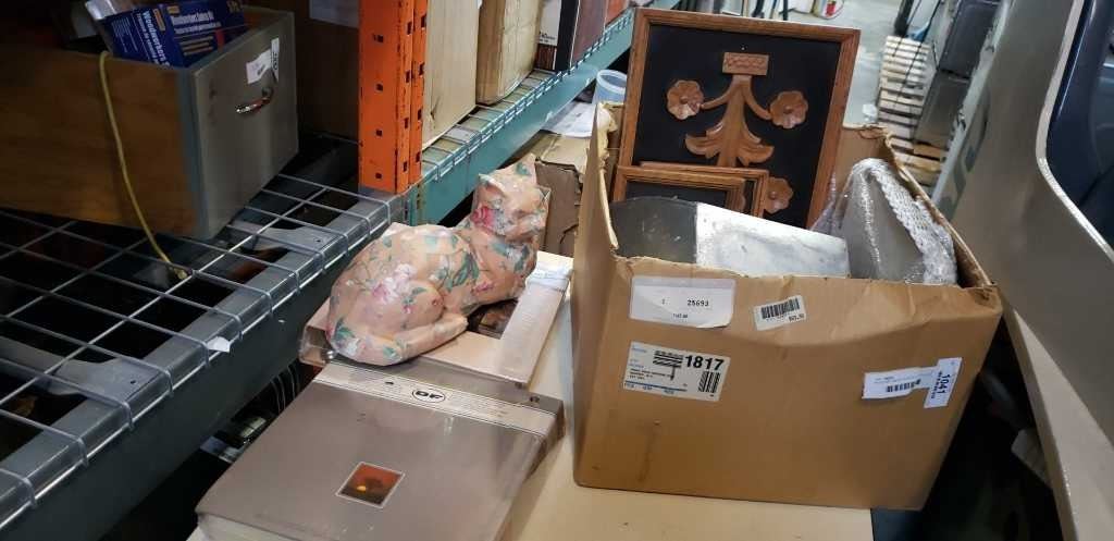 WOOD ART, METAL PLANTER, CAT FIGURE AND 2 PHOTO ALBUMS
